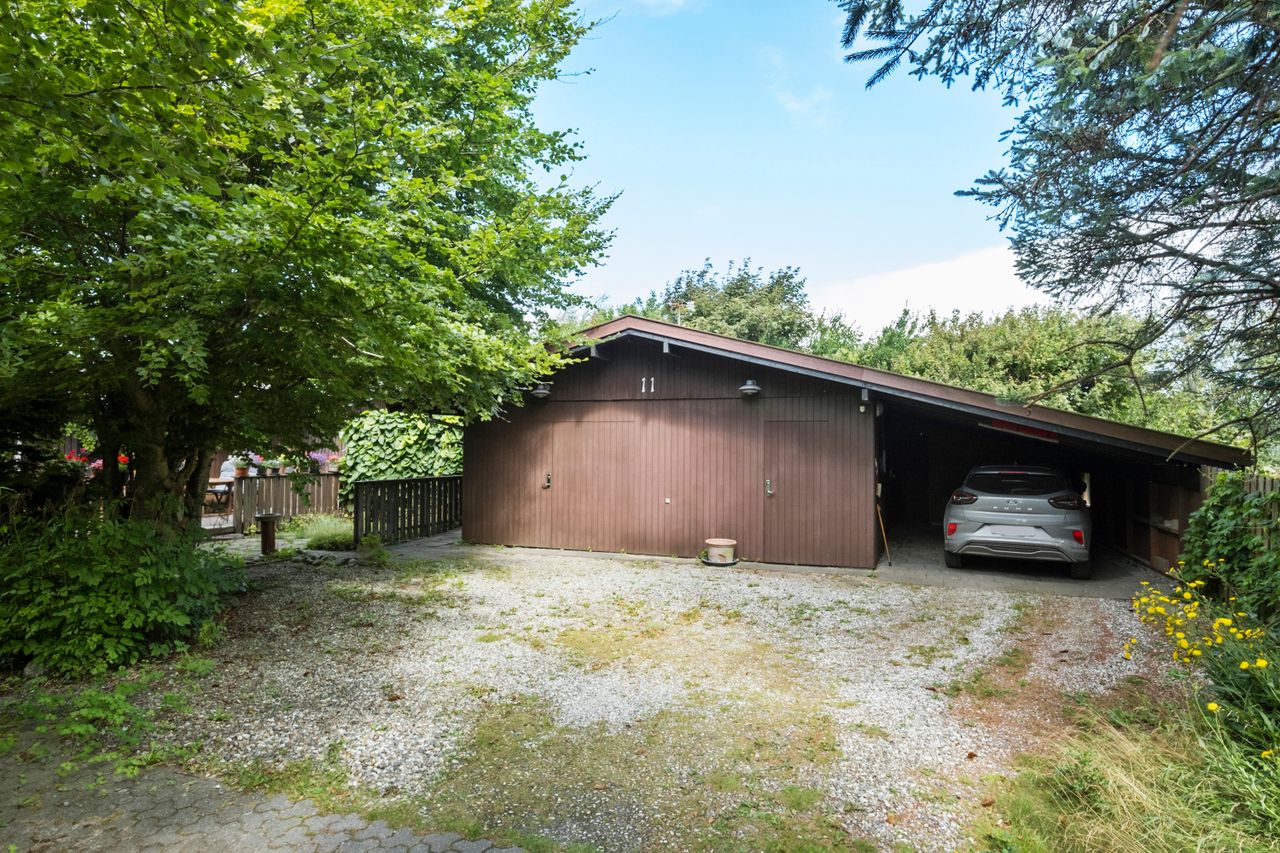 Til ejendommen hører desuden en stor garage samt en carport, hvilket giver god plads til både bil, cykler og opbevaring.