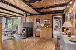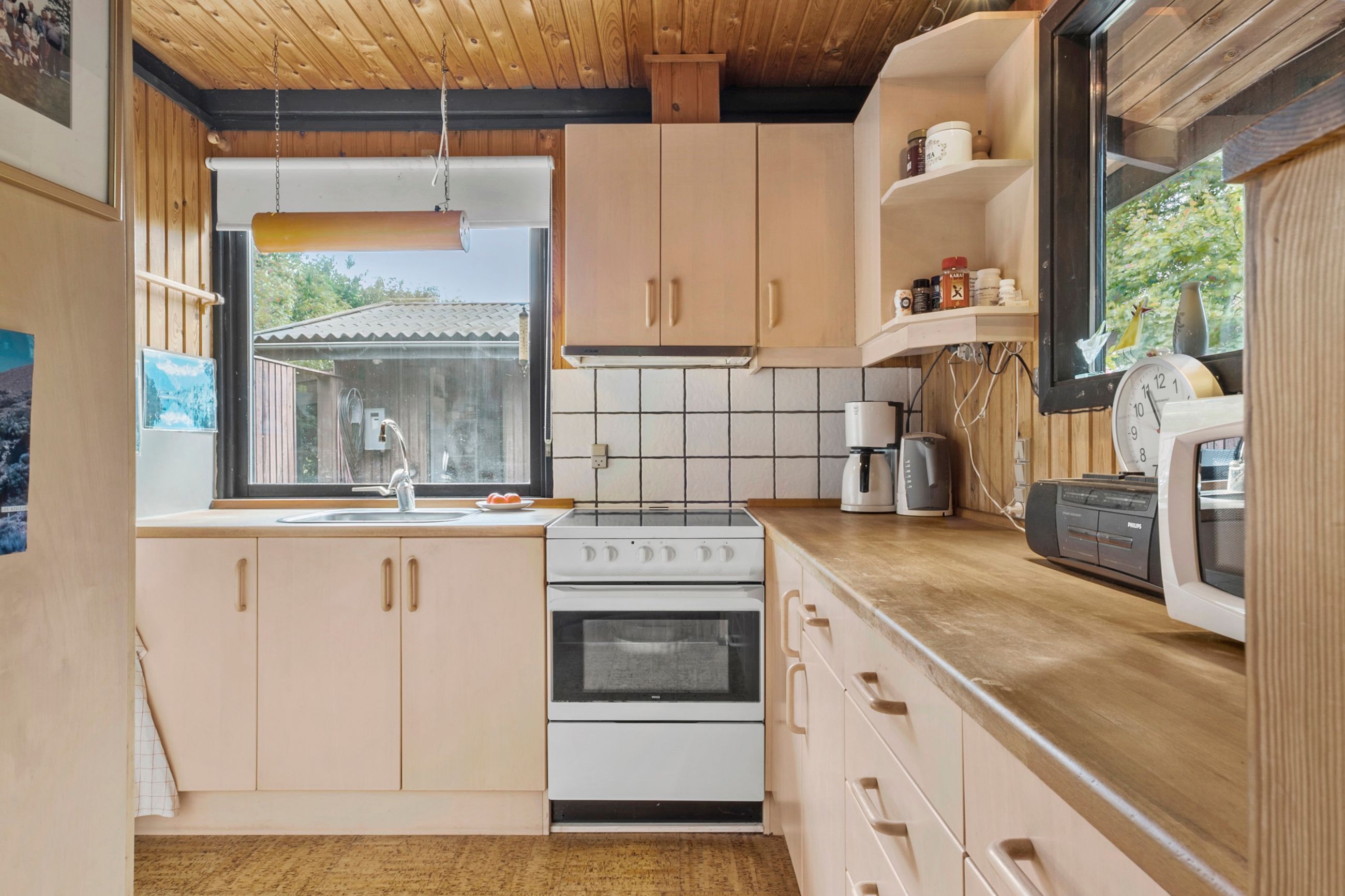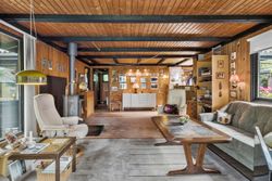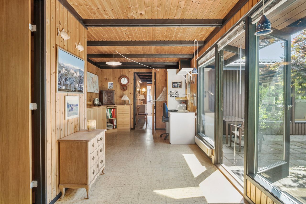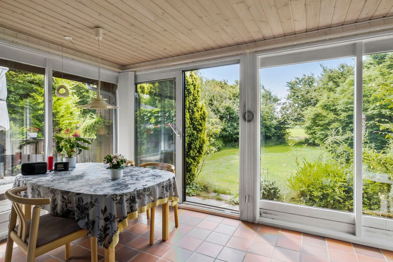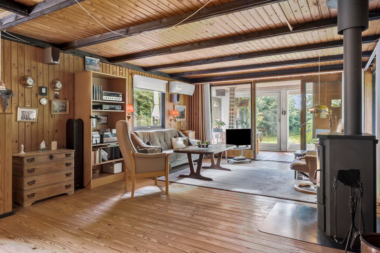 Herfra træder du videre ind i et lyst og hyggeligt køkken, som ligger i delvis åben forbindelse med den første af husets to stuer. Denne stue fungerer som husets hjerte og har direkte udgang til både en charmerende udestue og en ekstra tilbygget opholdsstue – perfekt til afslapning året rundt og til hyggelige stunder med familie og venner.