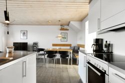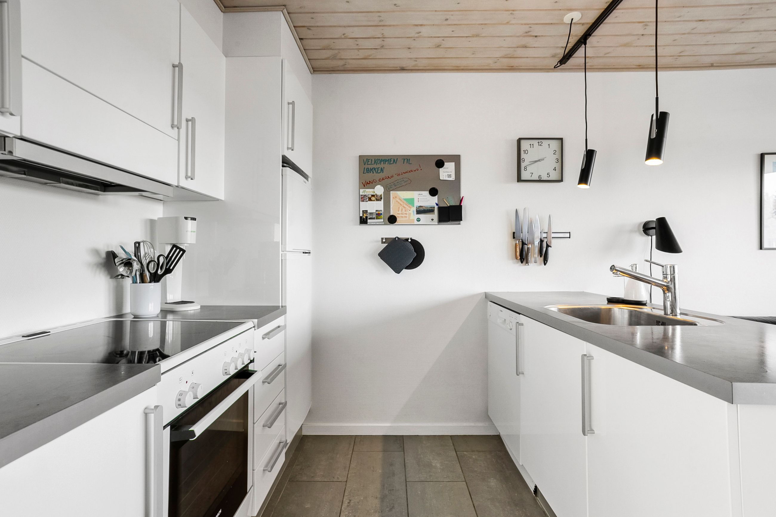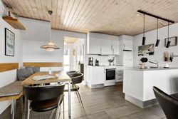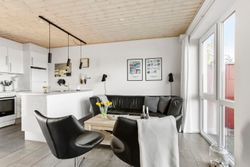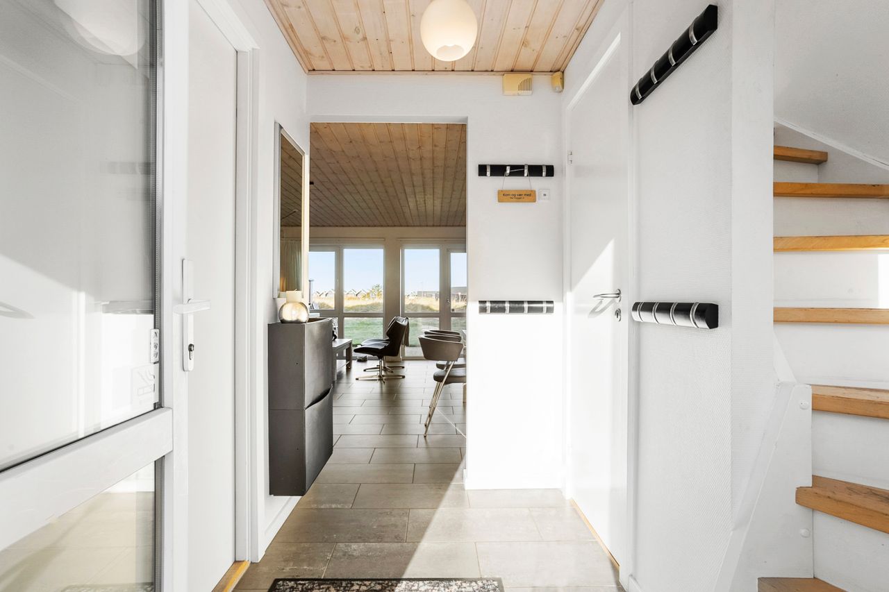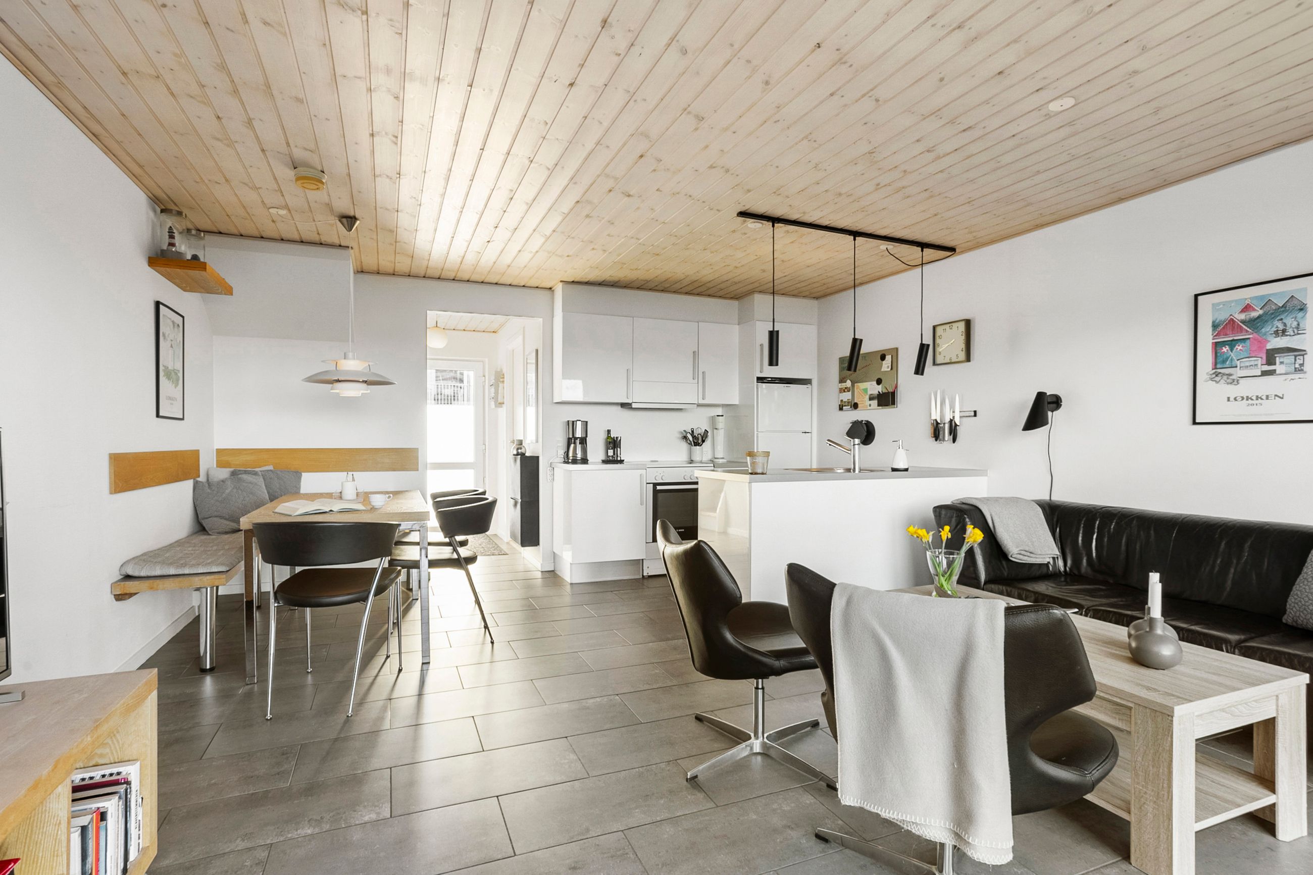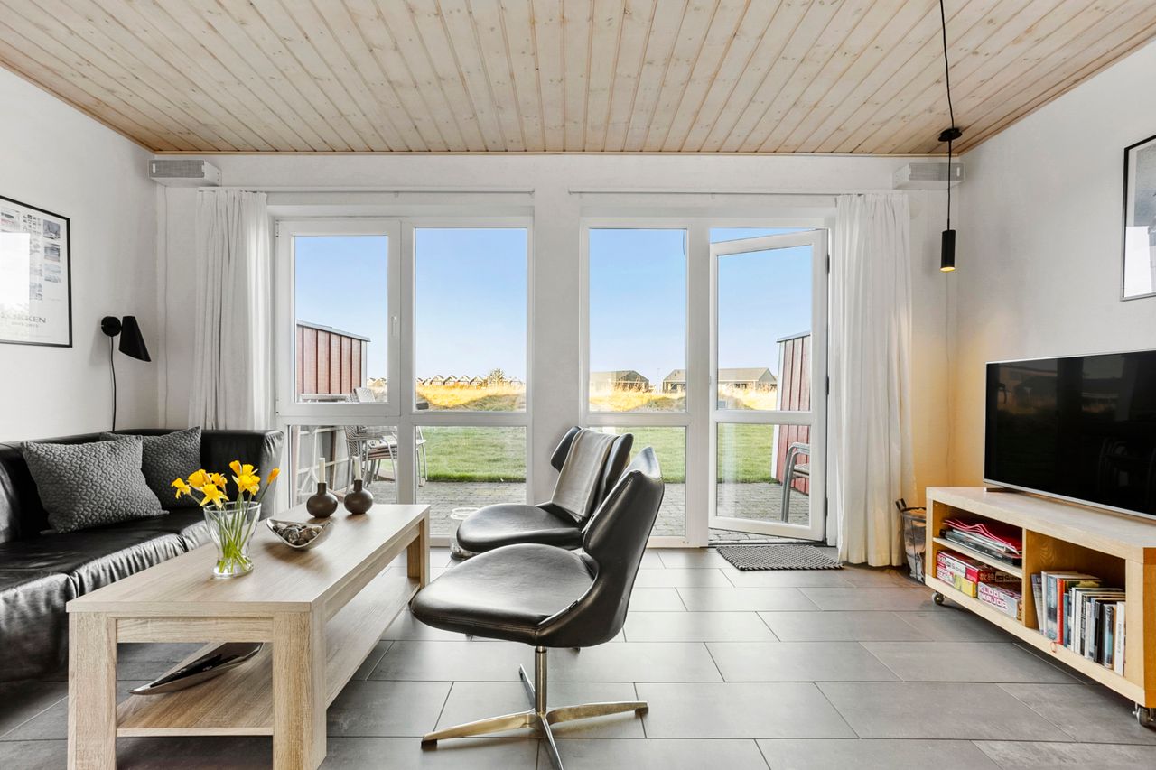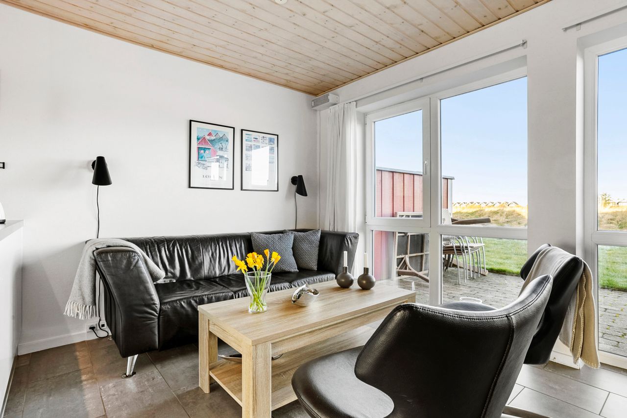 Det åbne opholdsrum kombinerer køkken og stue i ét og skaber en varm og afslappet atmosfære – perfekt til samvær og feriehygge. Herfra er der direkte udgang til en skøn, afskærmet terrasse og en lille græsplæne, hvor solen og udelivet kan nydes i rolige omgivelser.