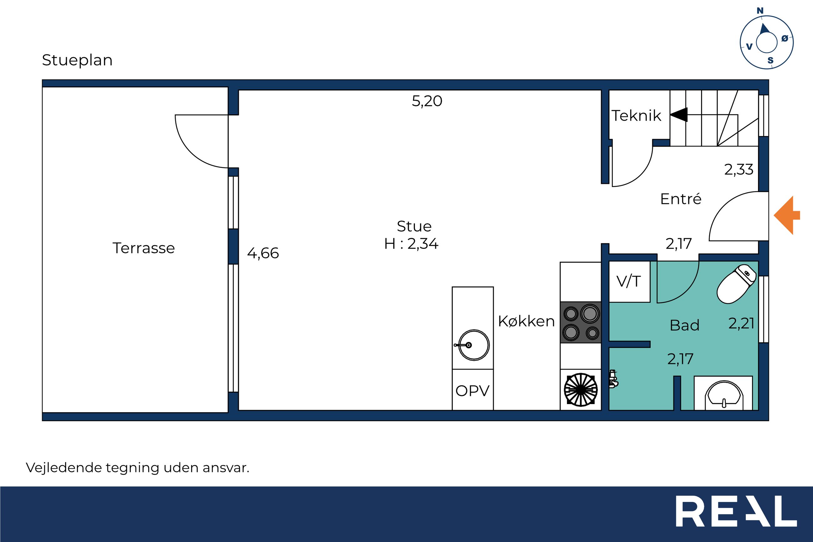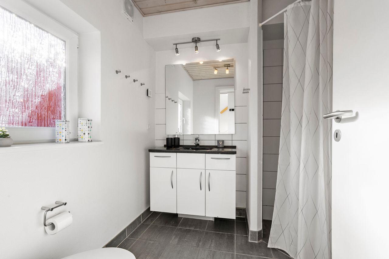 Boligen byder på privat parkering lige foran huset, og når du træder indenfor, mødes du af en lys og indbydende entré med adgang til badeværelse, førstesal og det åbne køkken-alrum. Badeværelset er rummeligt og funktionelt, med separat bruseniche og god opbevaringsplads samt vaskemaskine og tørretumbler.