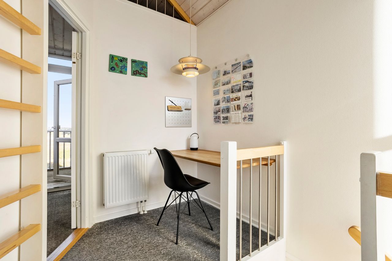 På førstesalen venter to gode værelser og en stor hems, der giver ekstra sove- eller opbevaringsplads. Det ene værelse har fin udsigt til golfbanen, mens det andet har udgang til en dejlig, overdækket altan – et oplagt sted til morgenkaffen eller en rolig stund i aftensolen.