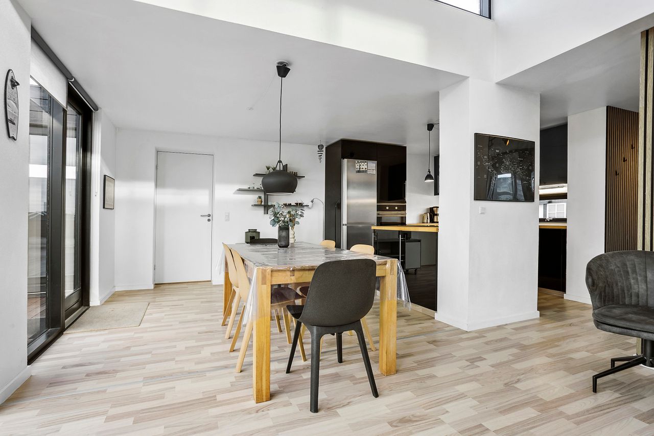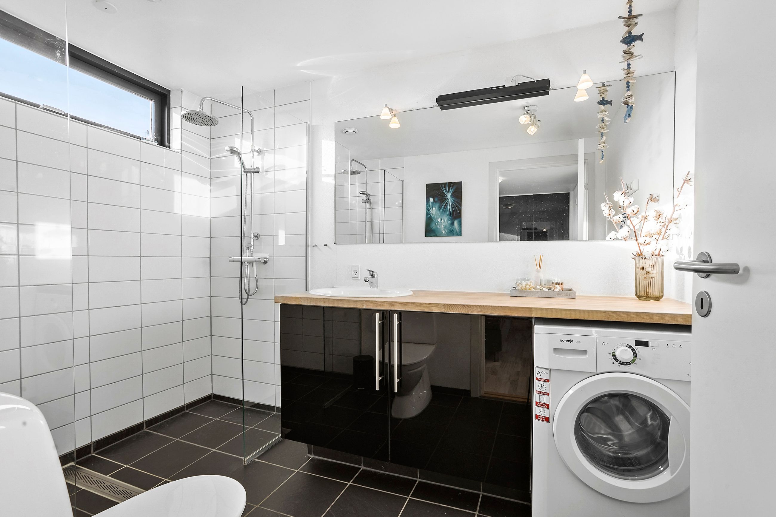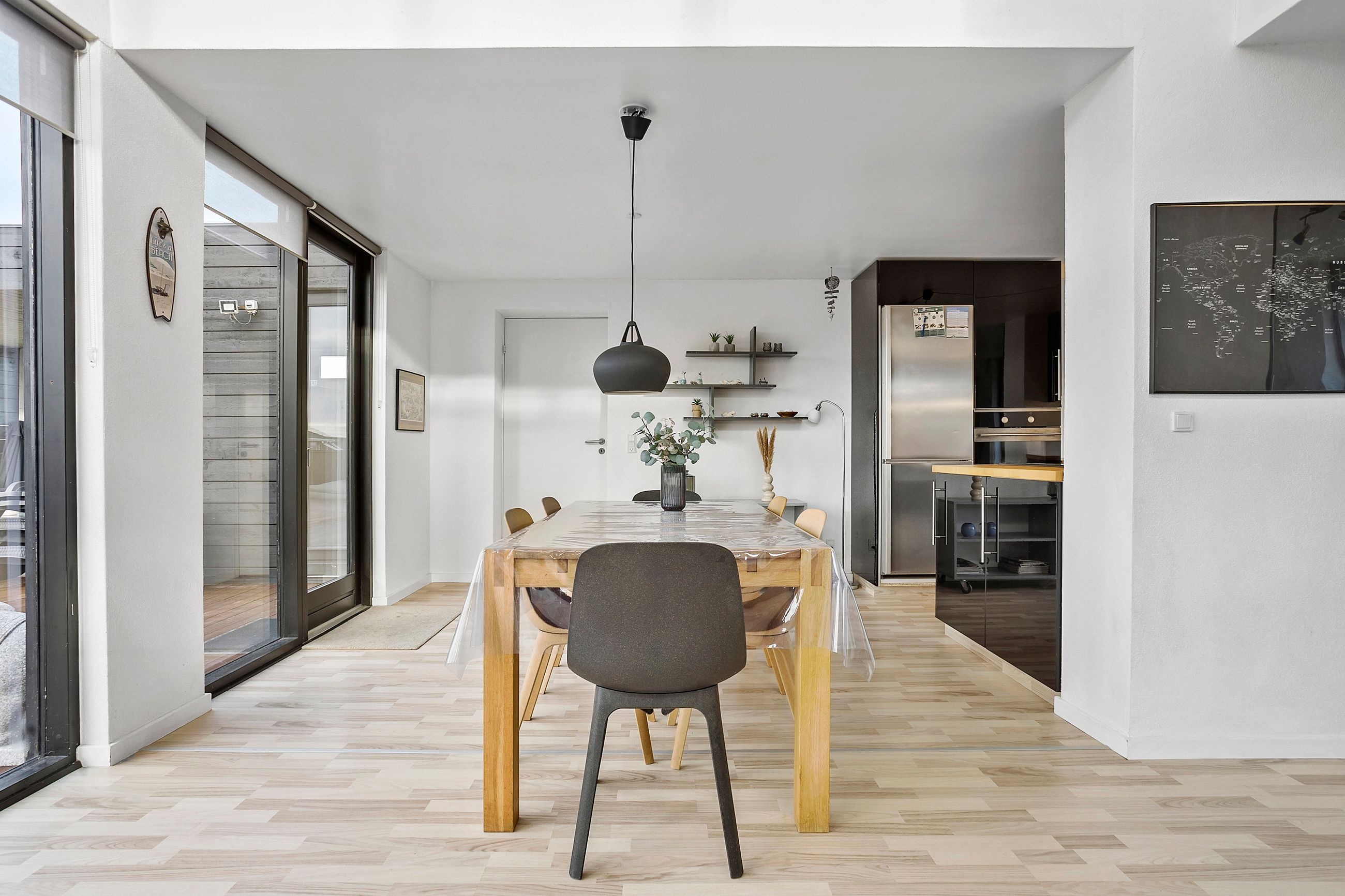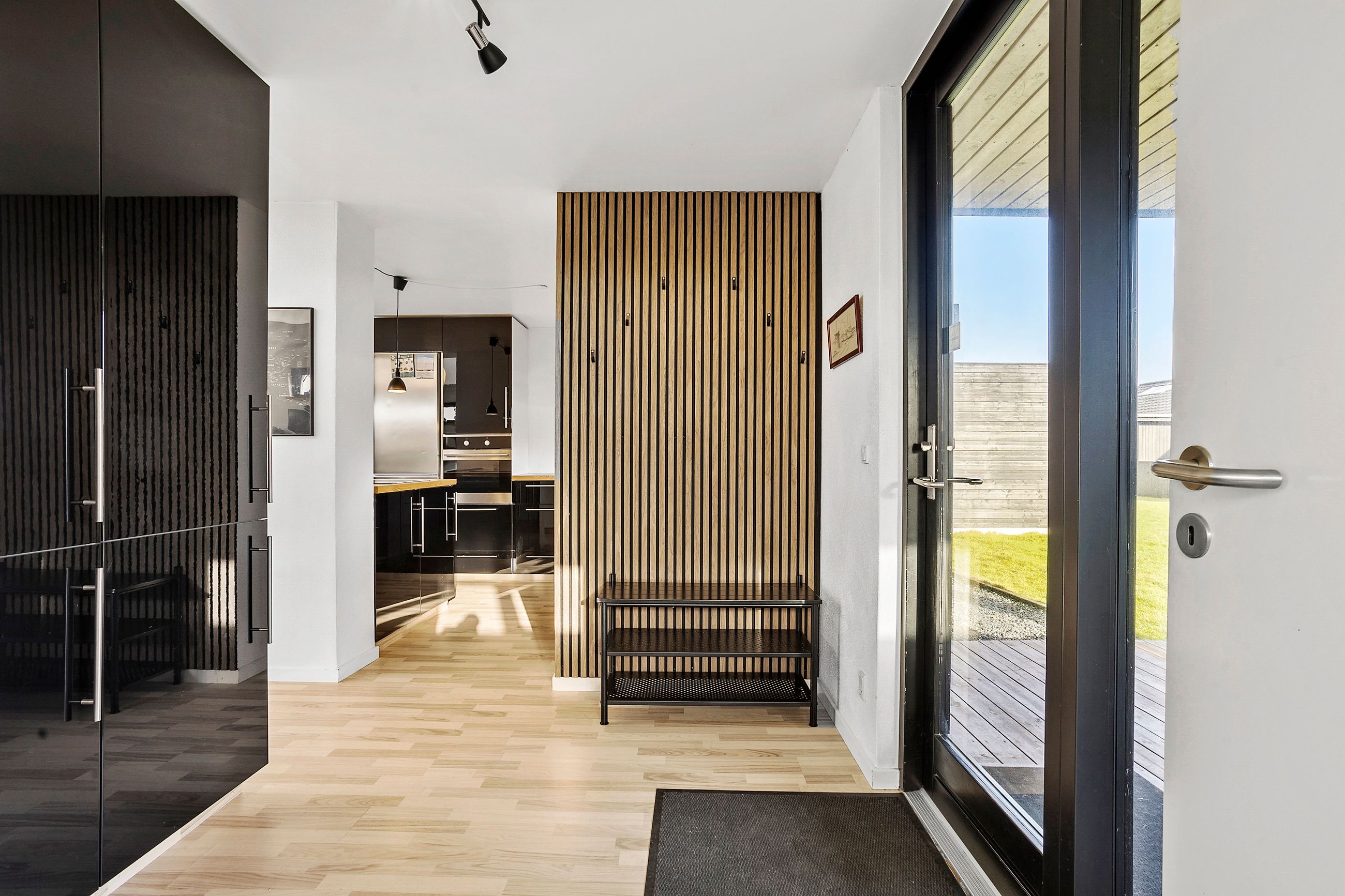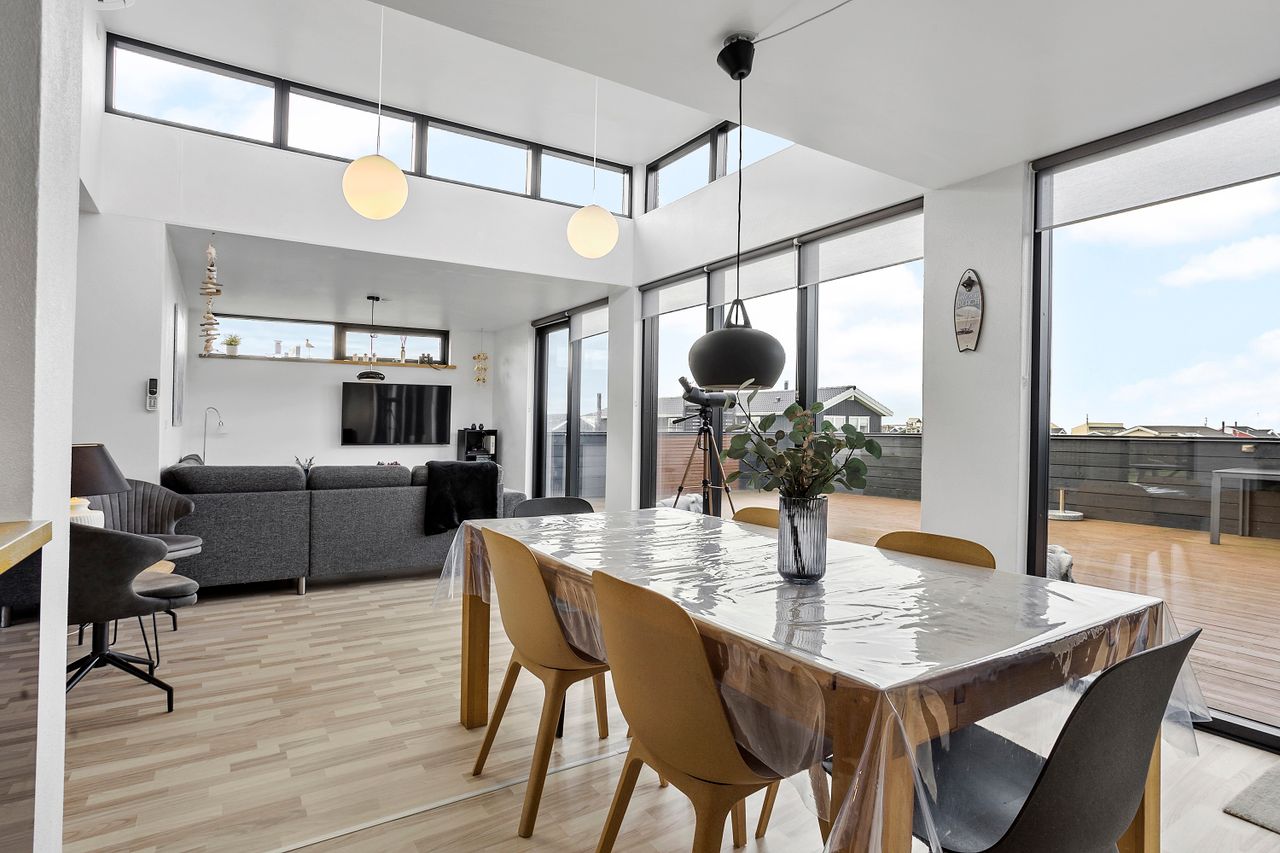 Huset imponerer med sin stilrene og moderne indretning, hvor lys og rummelighed er i fokus. Her finder du et stort og indbydende køkken-alrum med direkte udgang til de skønne terrassearealer, der elegant slynger sig omkring huset – perfekt til afslapning og hyggelige stunder under åben himmel.