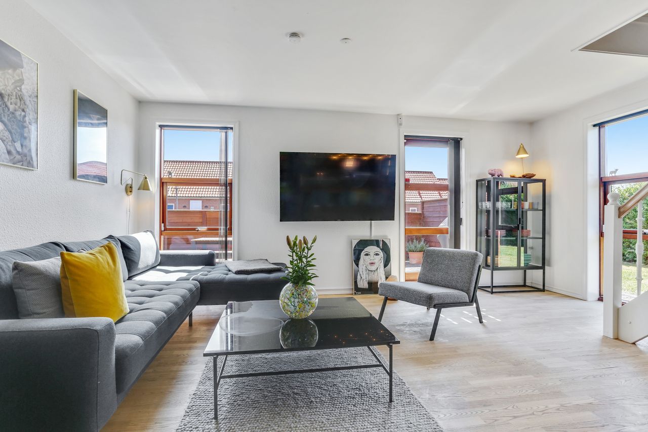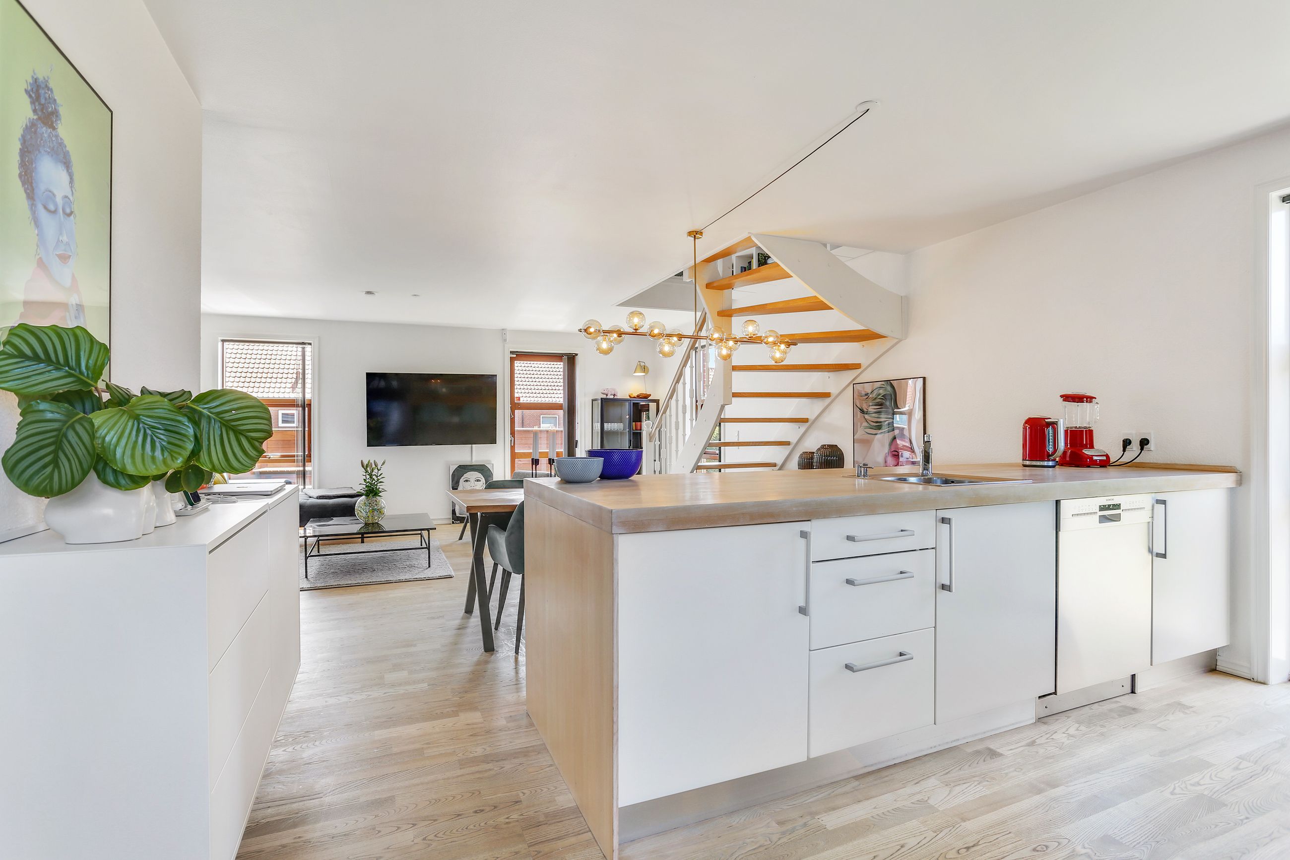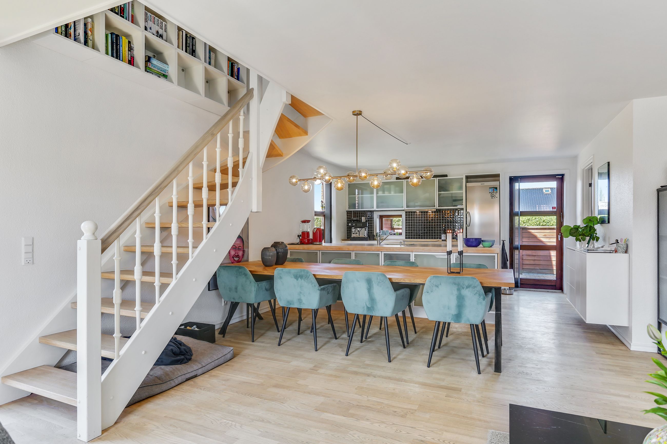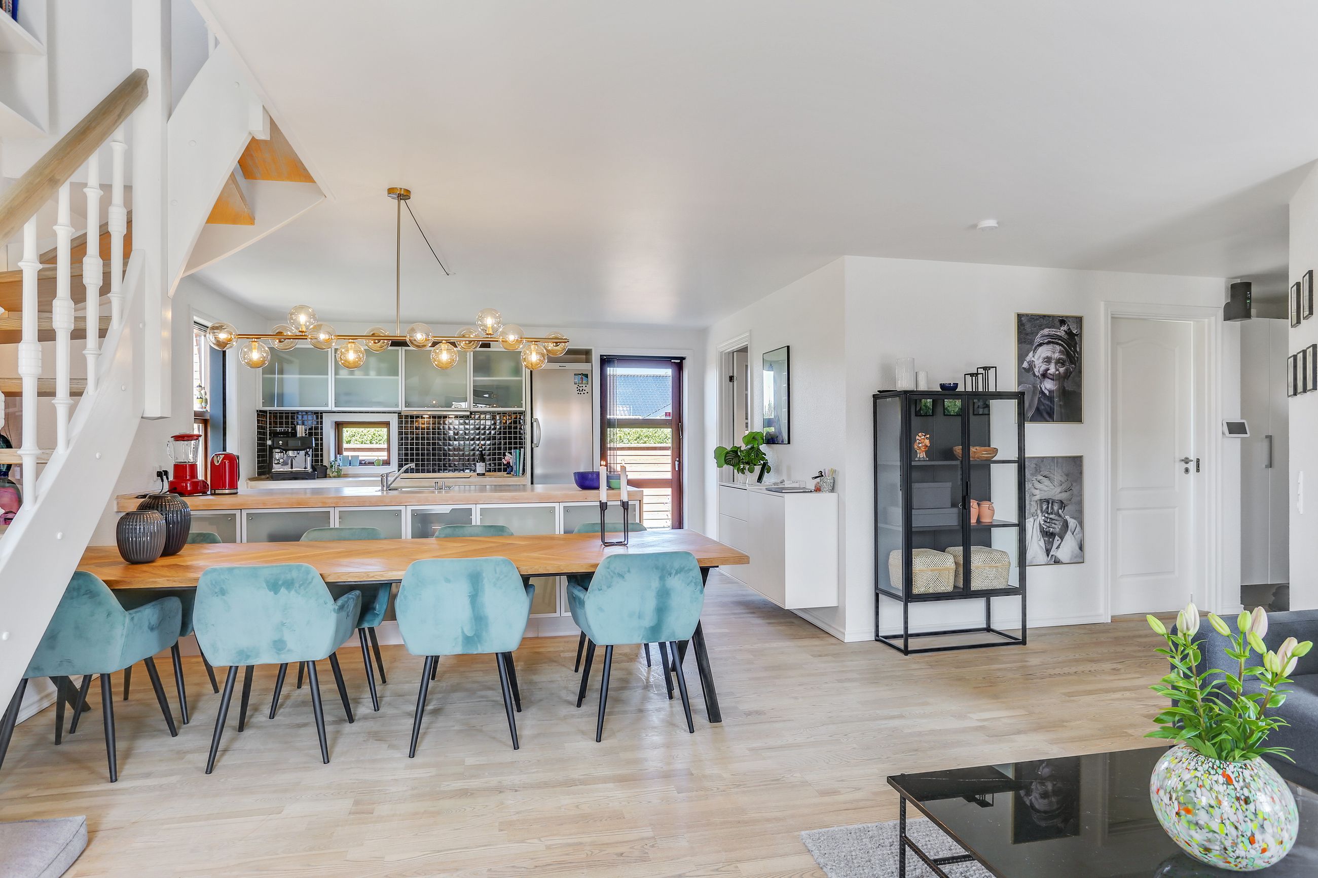 I stueplan finder du et lyst værelse, et stilfuldt badeværelse samt et praktisk bryggers. Hjertet af hjemmet er det åbne køkken-alrum, der indbyder til hyggelige stunder med familie og venner. Herfra er der direkte udgang til en skøn, lukket have med solrige kroge og læfyldte opholdspladser – ideel til både afslapning og udendørs samvær.