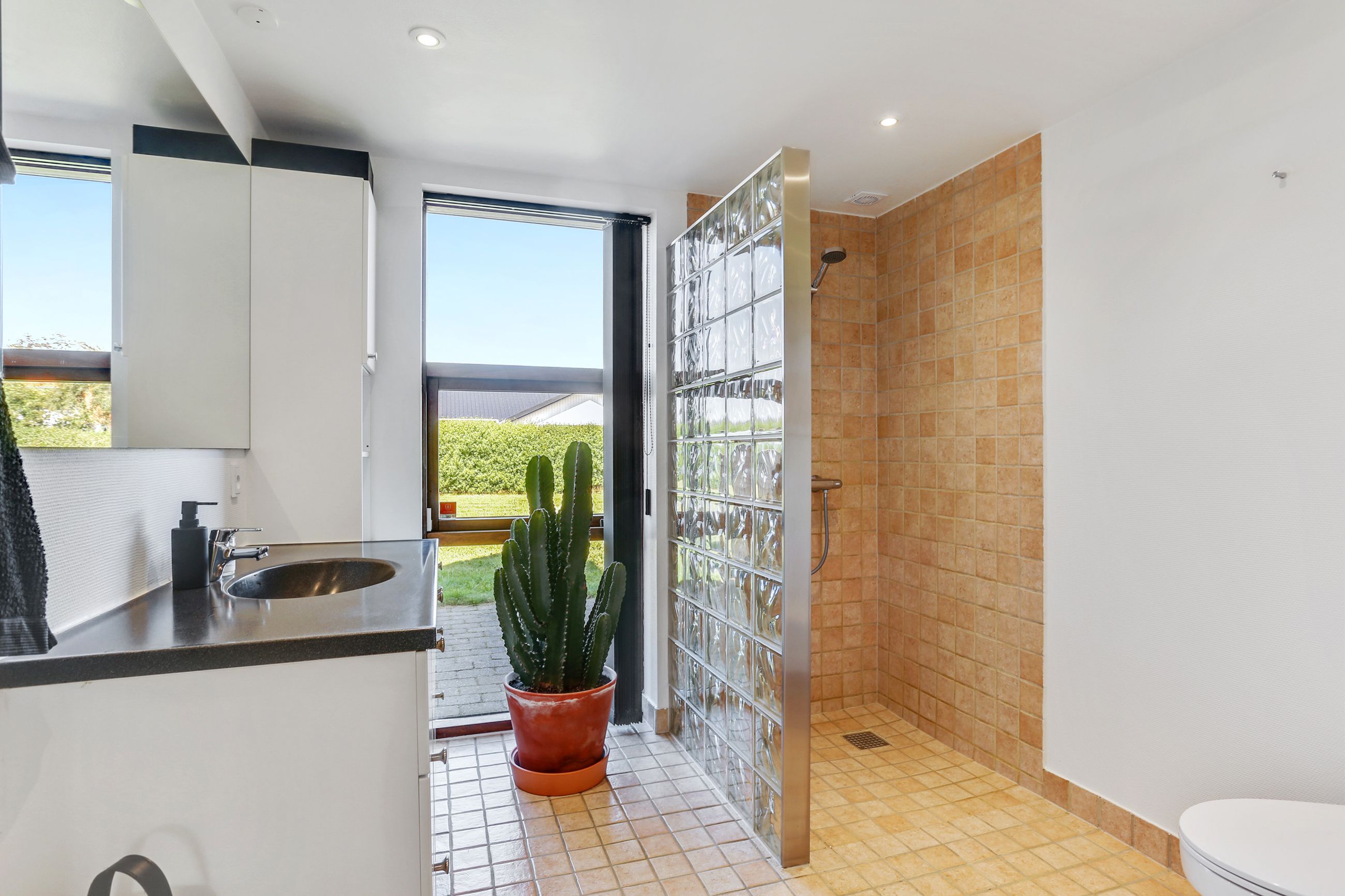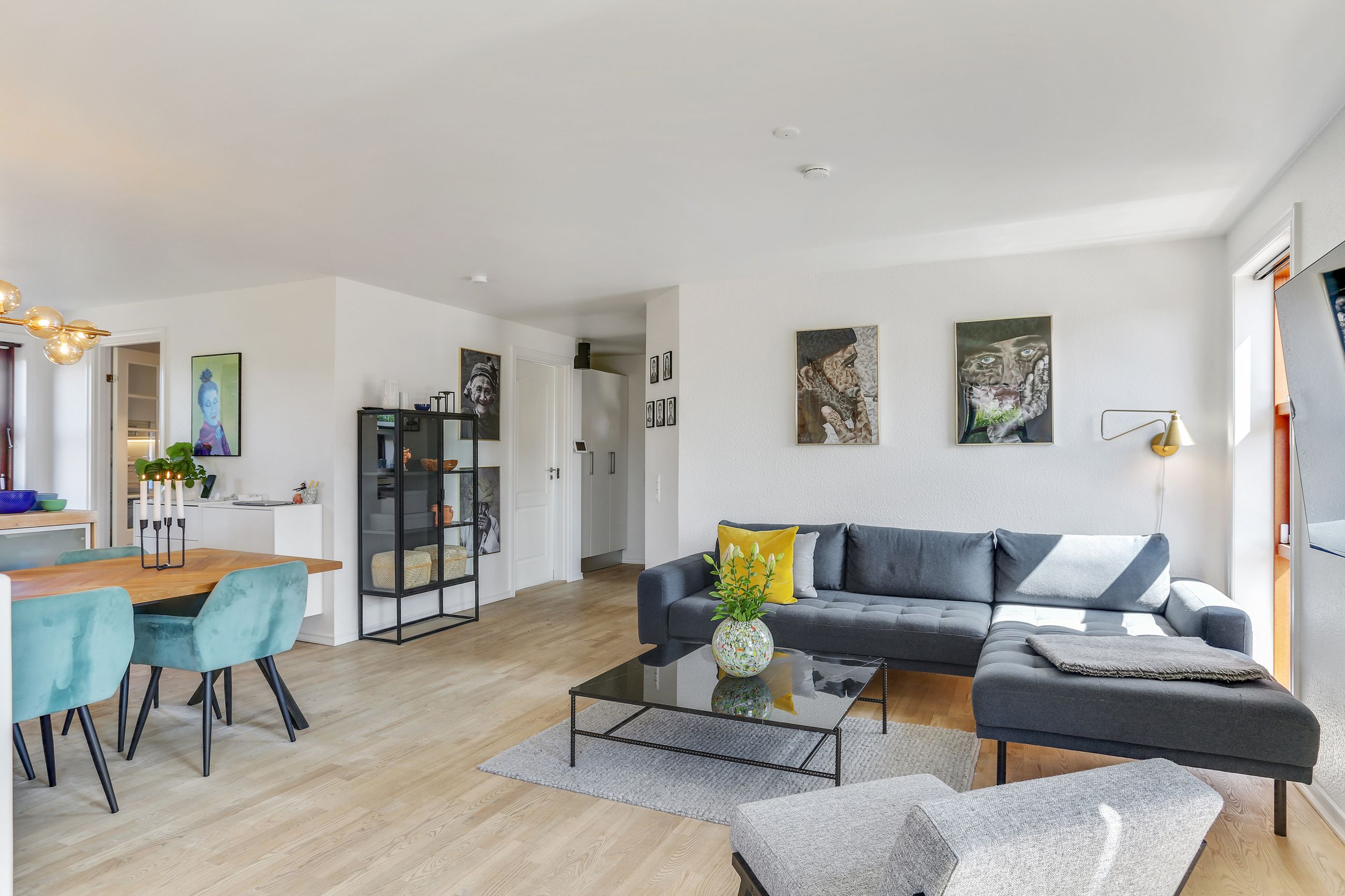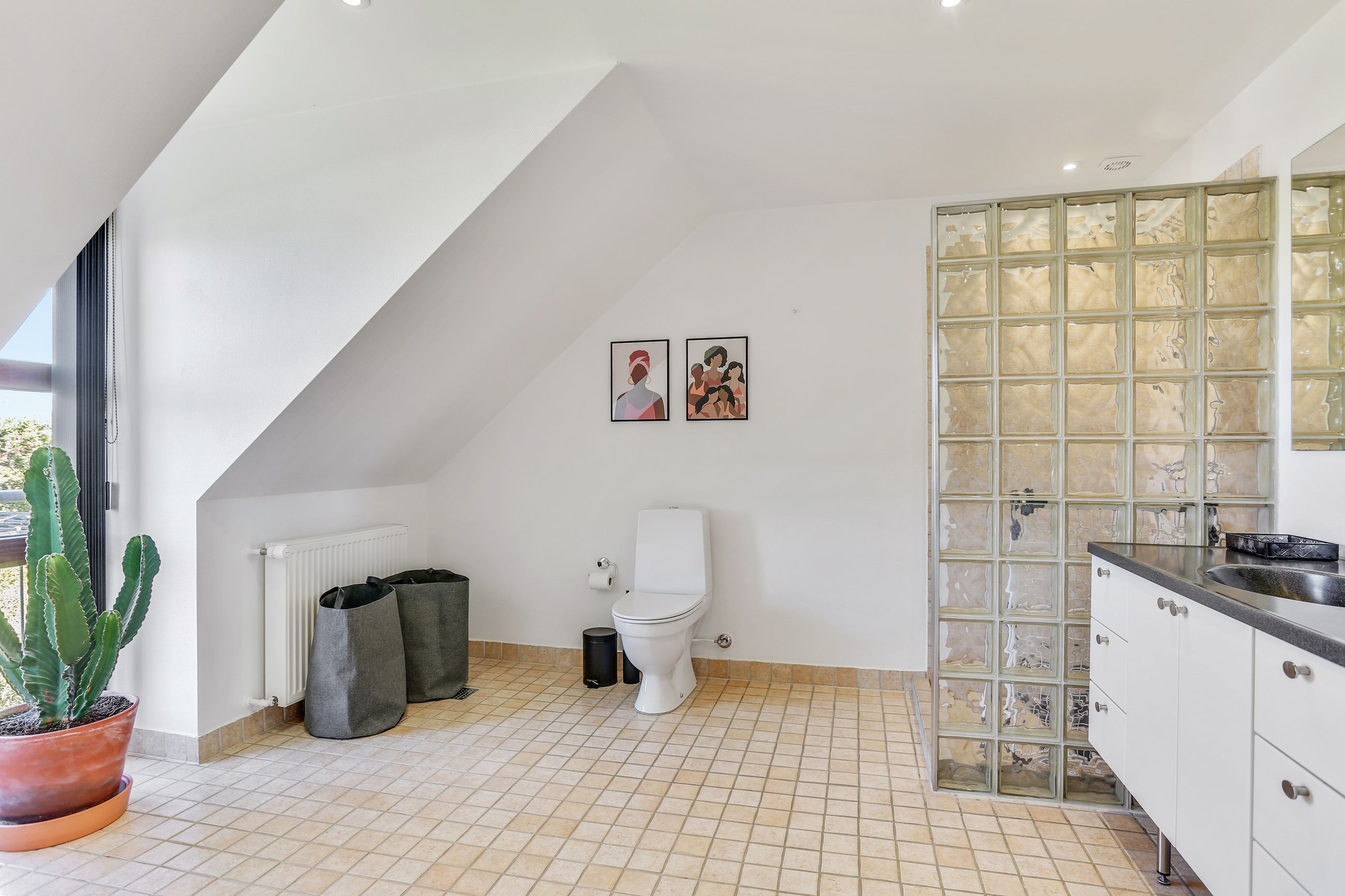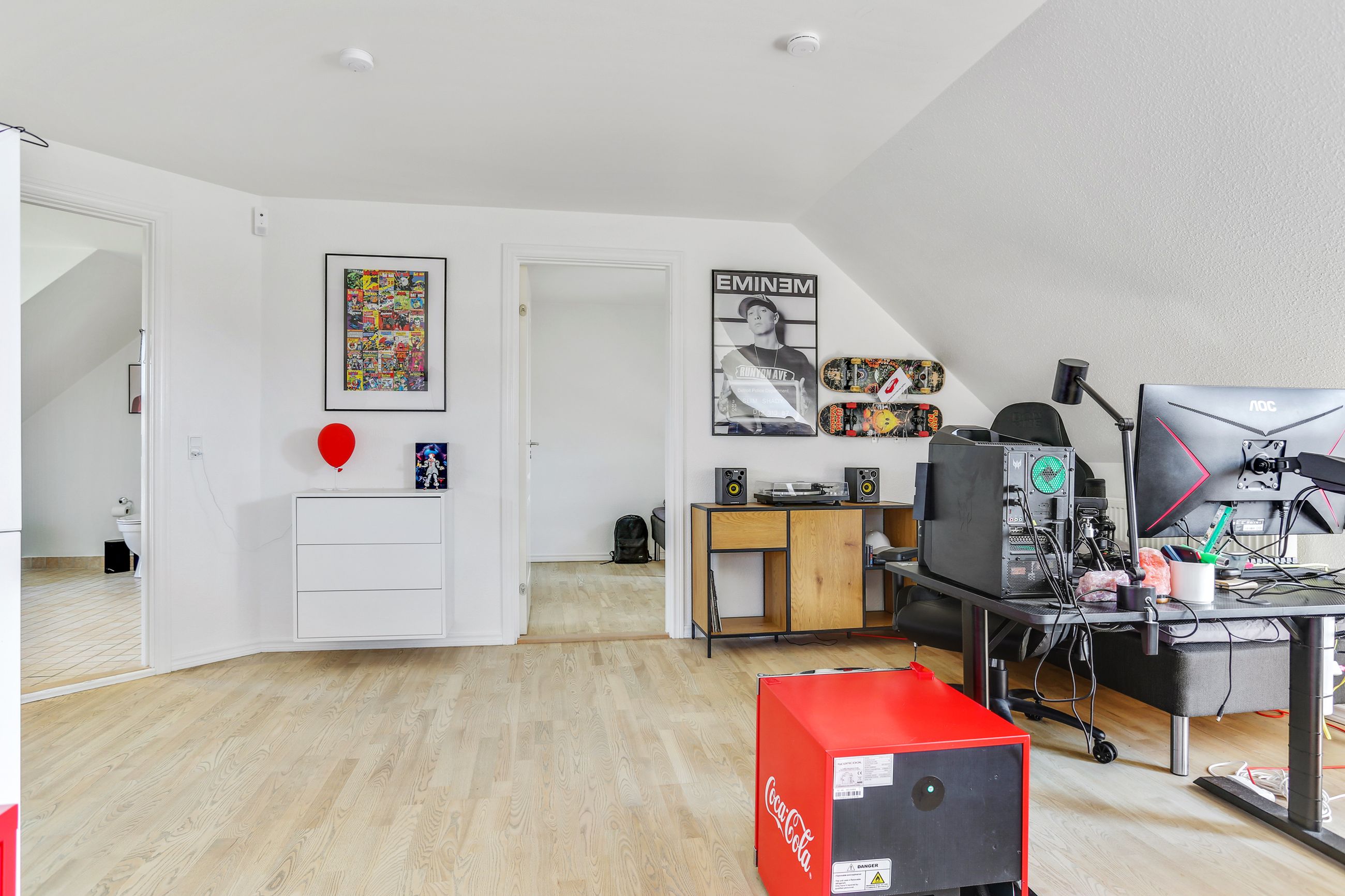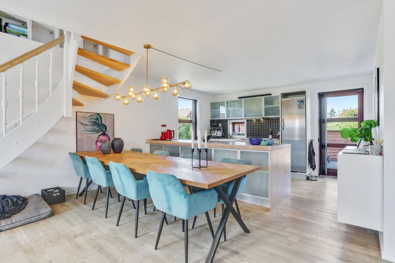 I stueplan finder du et lyst værelse, et stilfuldt badeværelse samt et praktisk bryggers. Hjertet af hjemmet er det åbne køkken-alrum, der indbyder til hyggelige stunder med familie og venner. Herfra er der direkte udgang til en skøn, lukket have med solrige kroge og læfyldte opholdspladser – ideel til både afslapning og udendørs samvær.