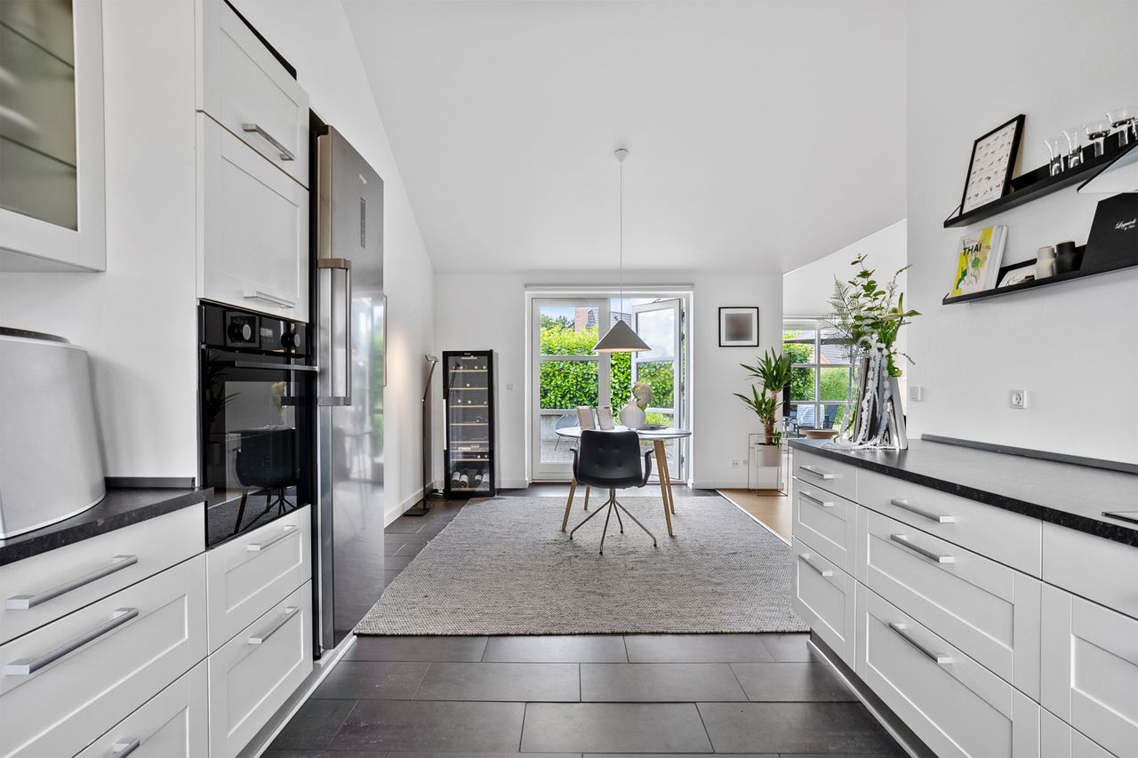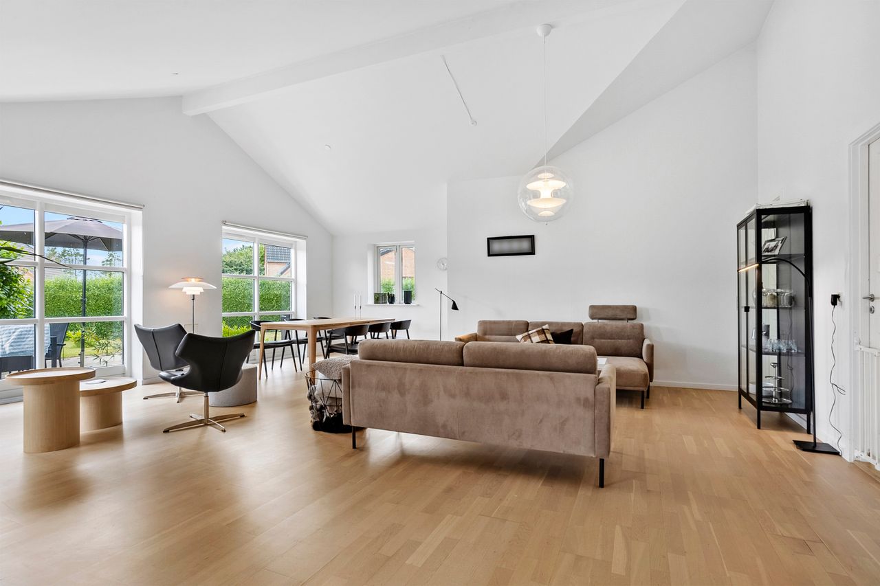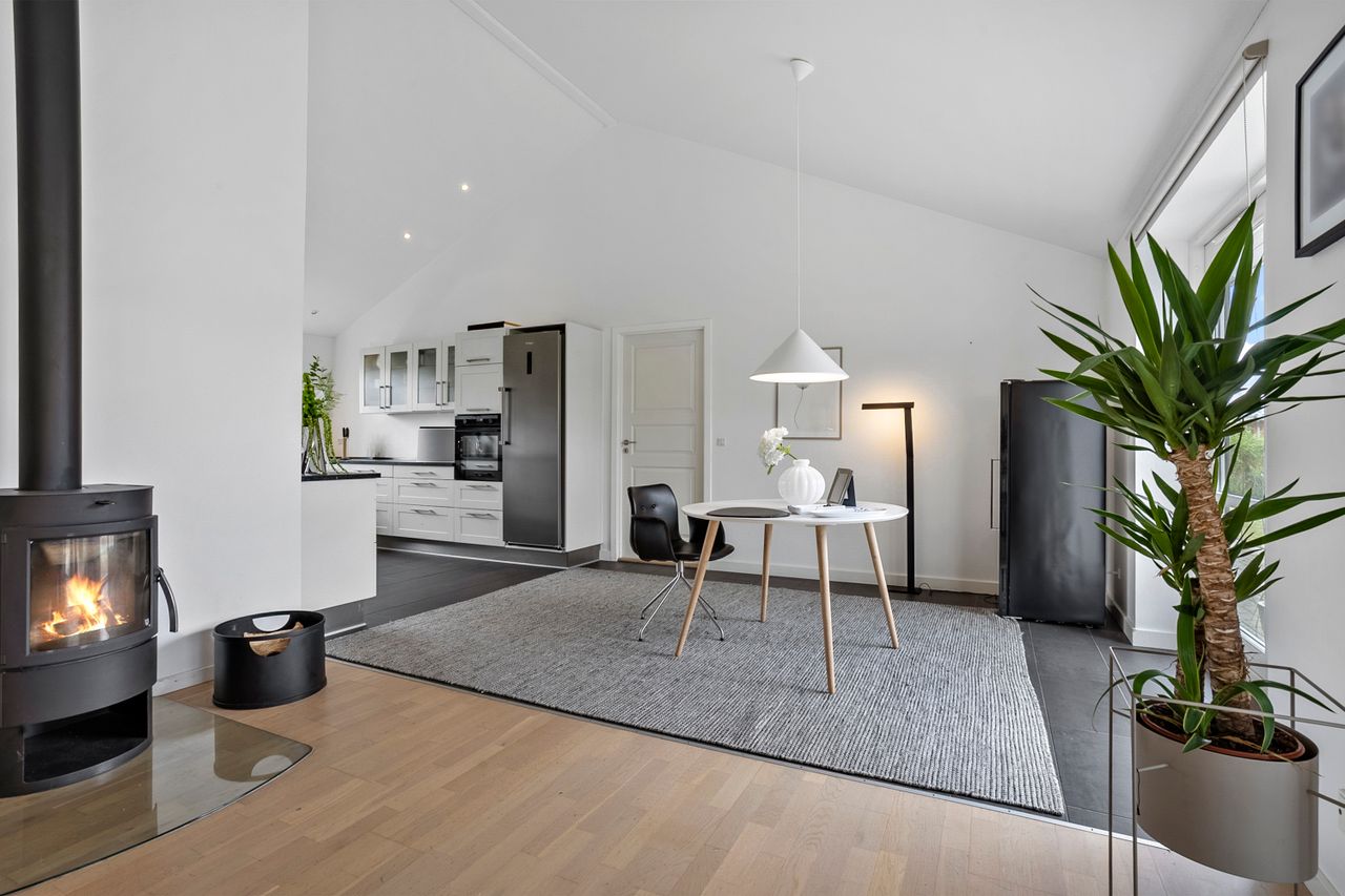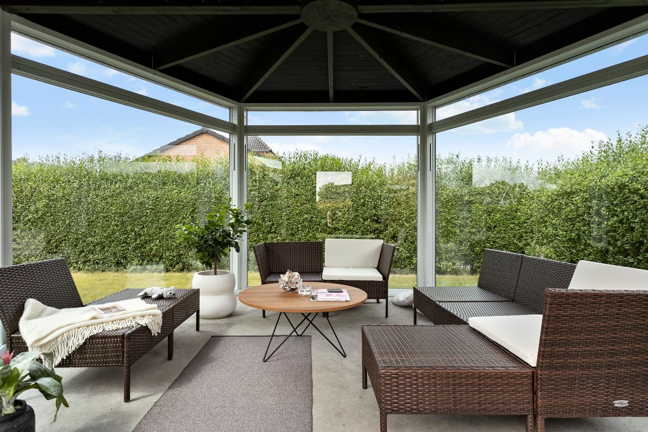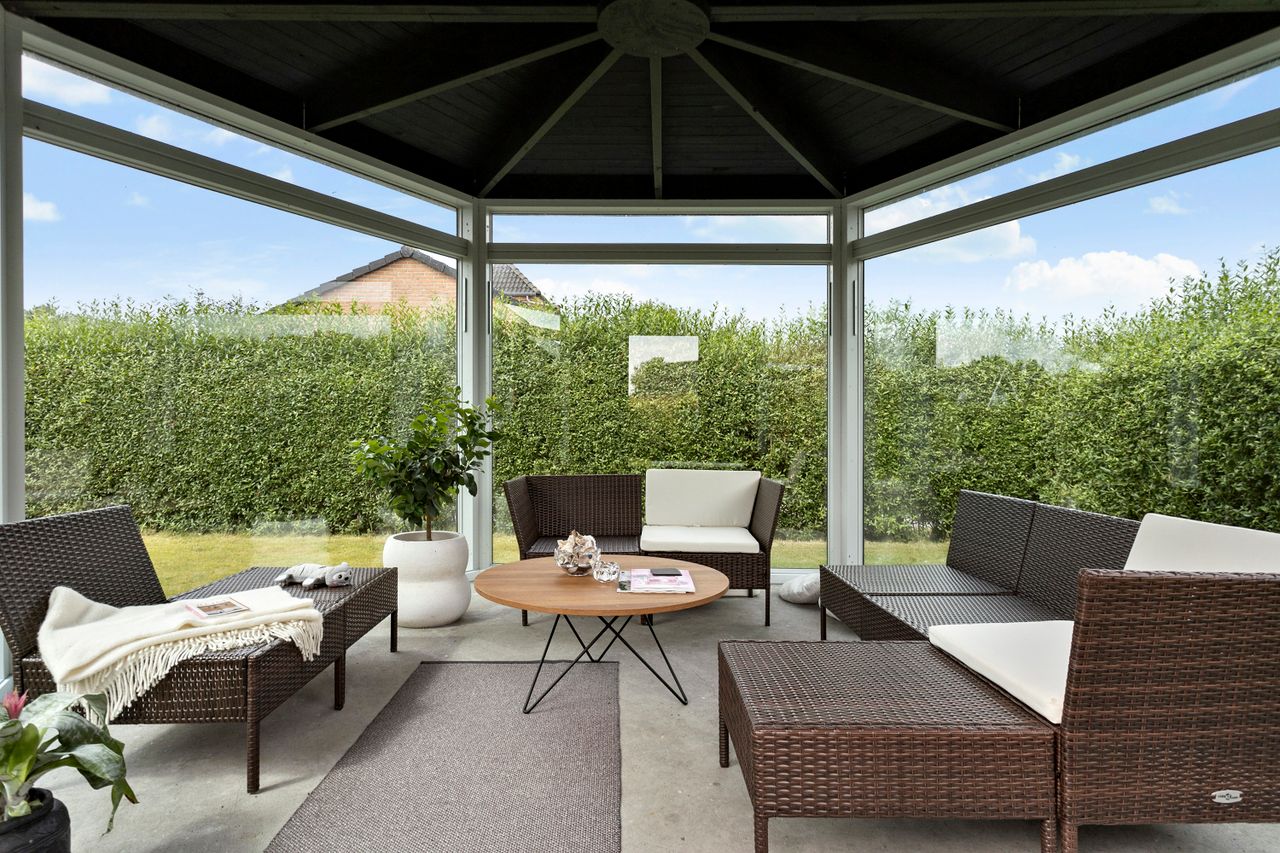 Fra alrummet er der direkte udgang til de skønne terrassearealer og den ugenerte have, som er omkranset af en høj hæk, der giver masser af privatliv. I haven finder du også en hyggelig udestue, ideel til sene aftentimer eller som ekstra opholdsrum året rundt.
