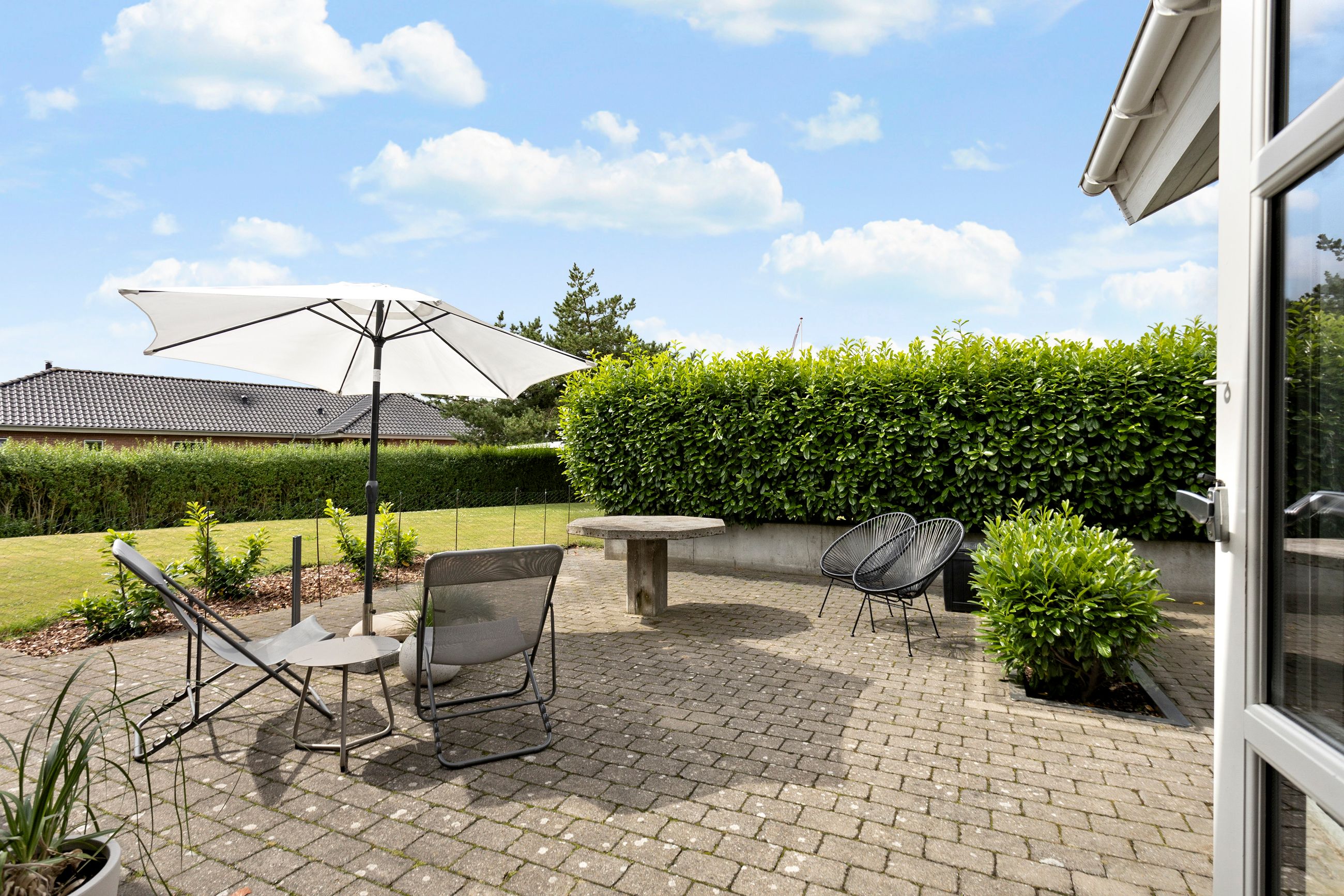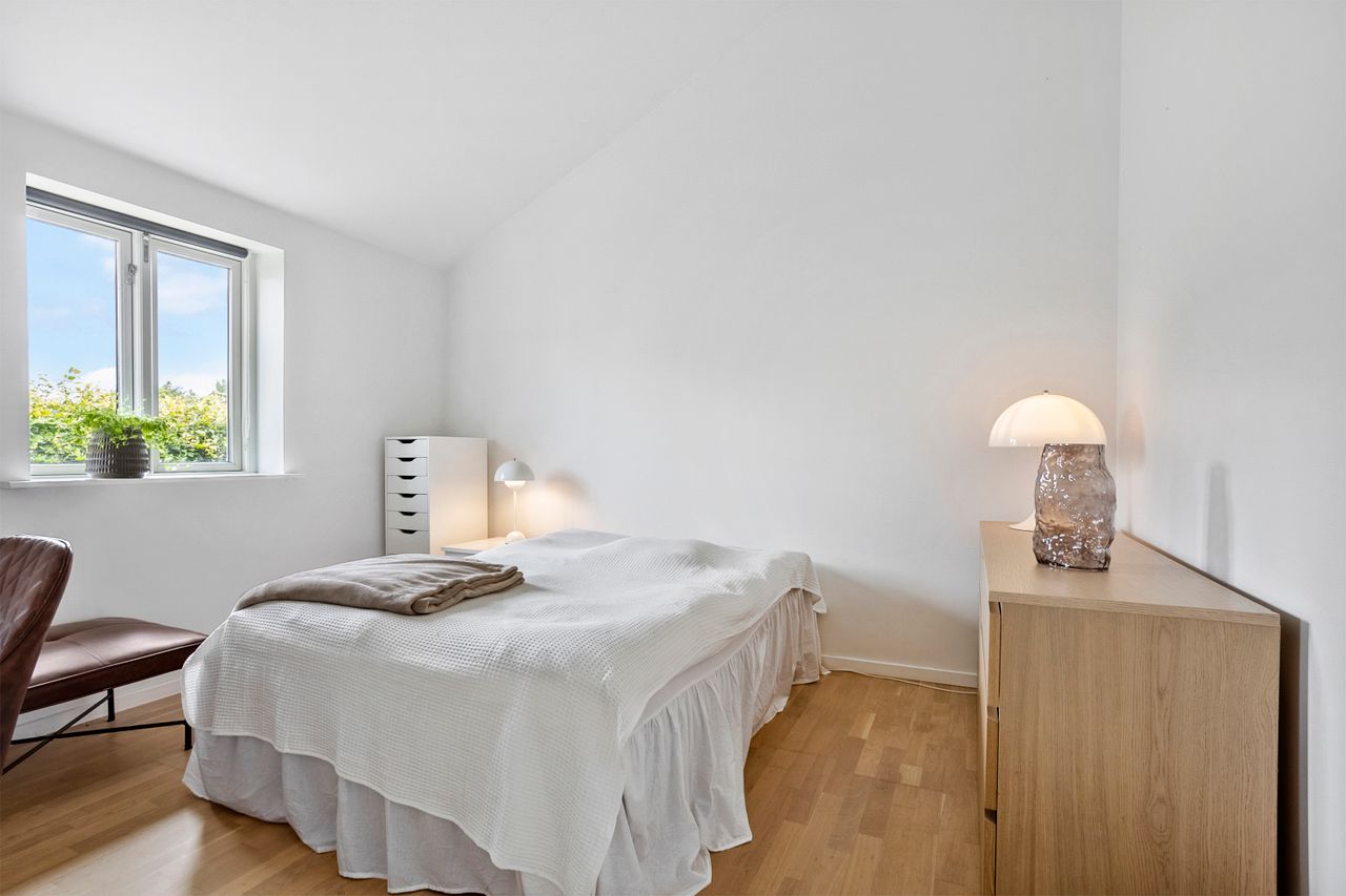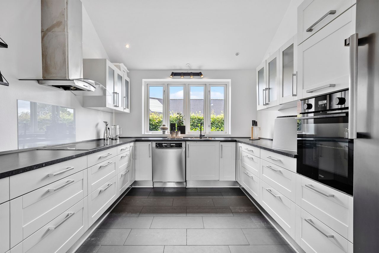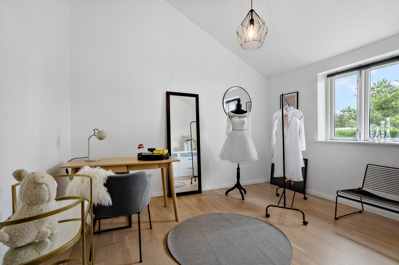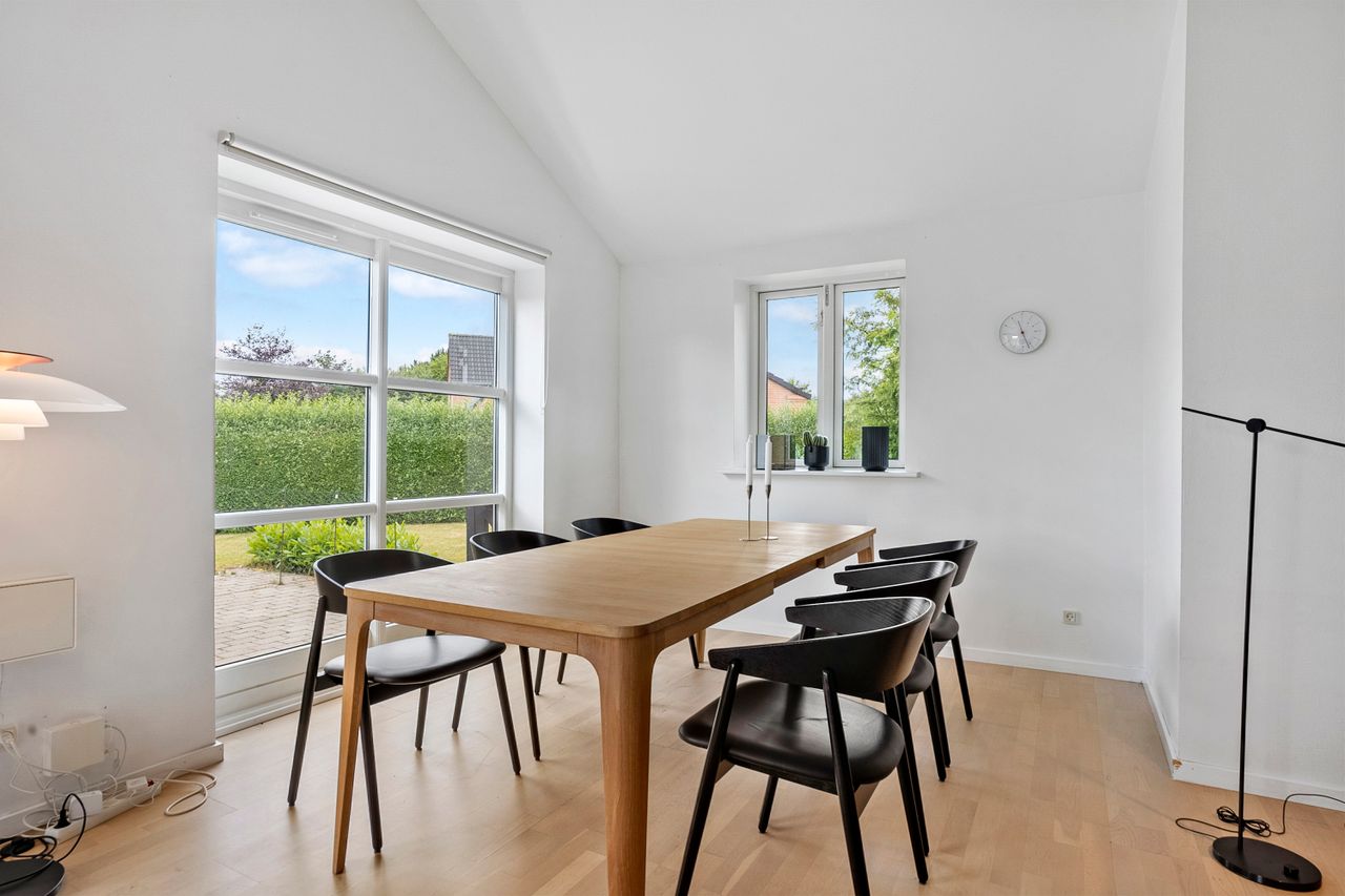 Fra alrummet er der direkte udgang til de skønne terrassearealer og den ugenerte have, som er omkranset af en høj hæk, der giver masser af privatliv. I haven finder du også en hyggelig udestue, ideel til sene aftentimer eller som ekstra opholdsrum året rundt.