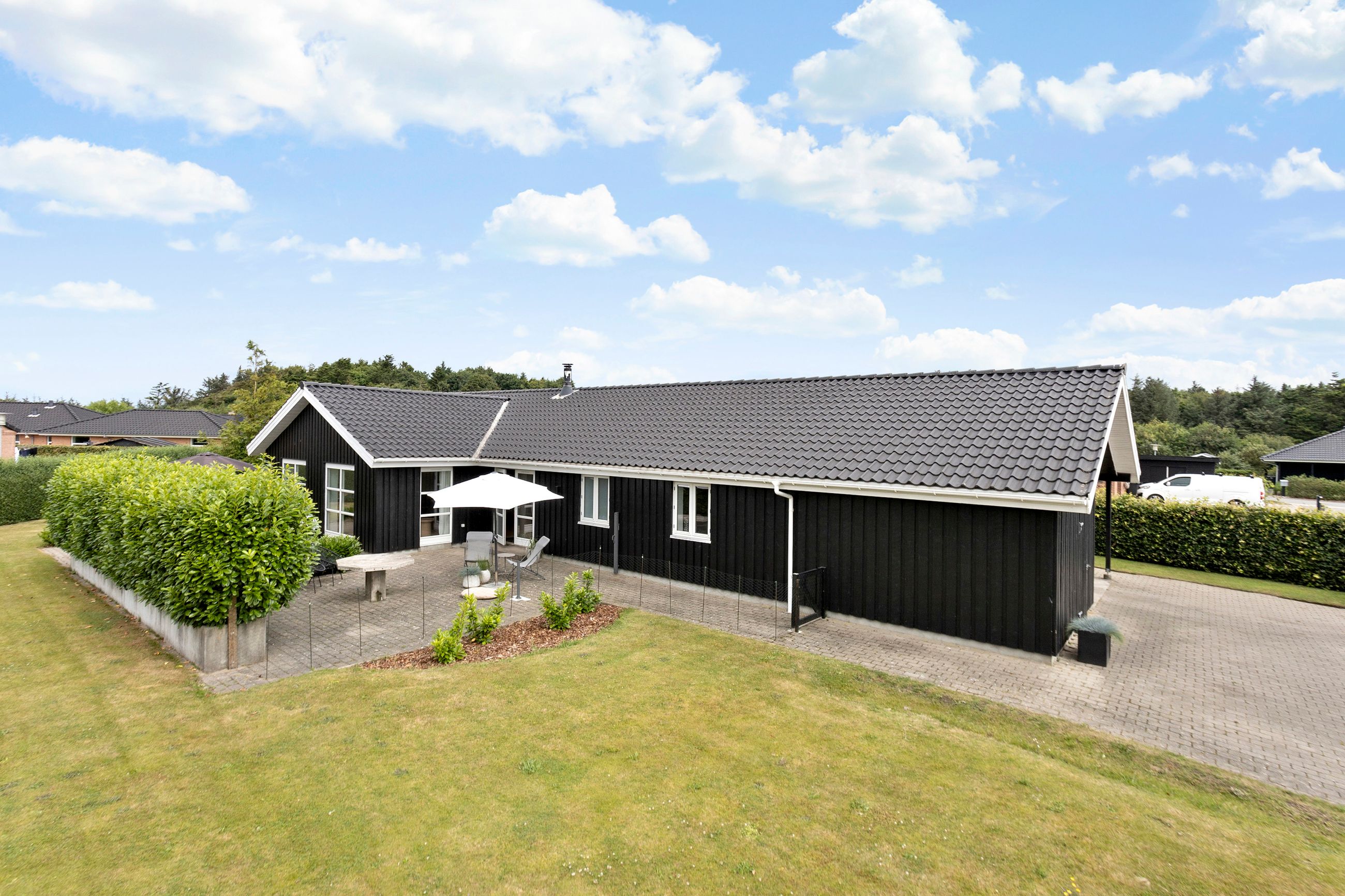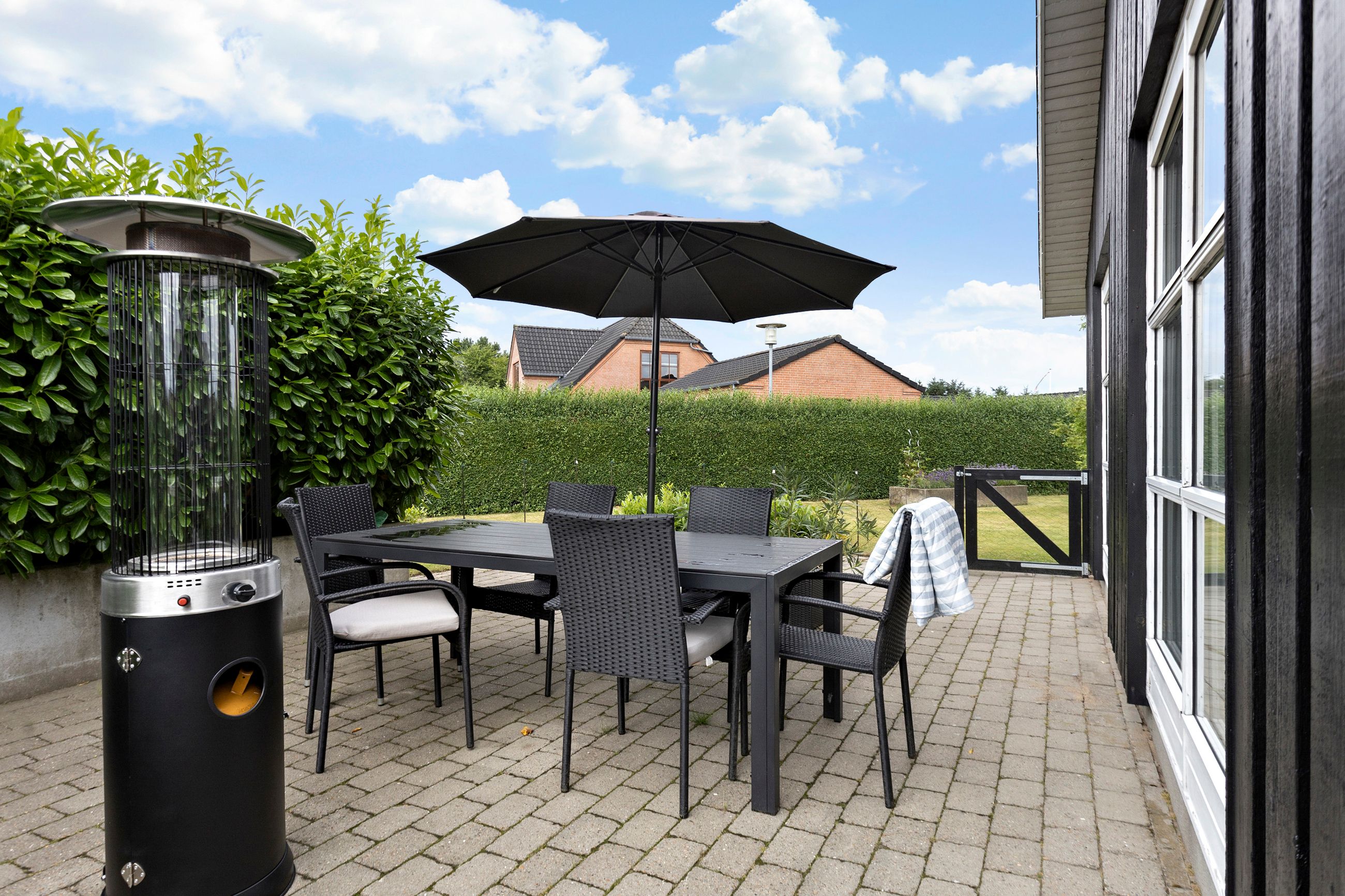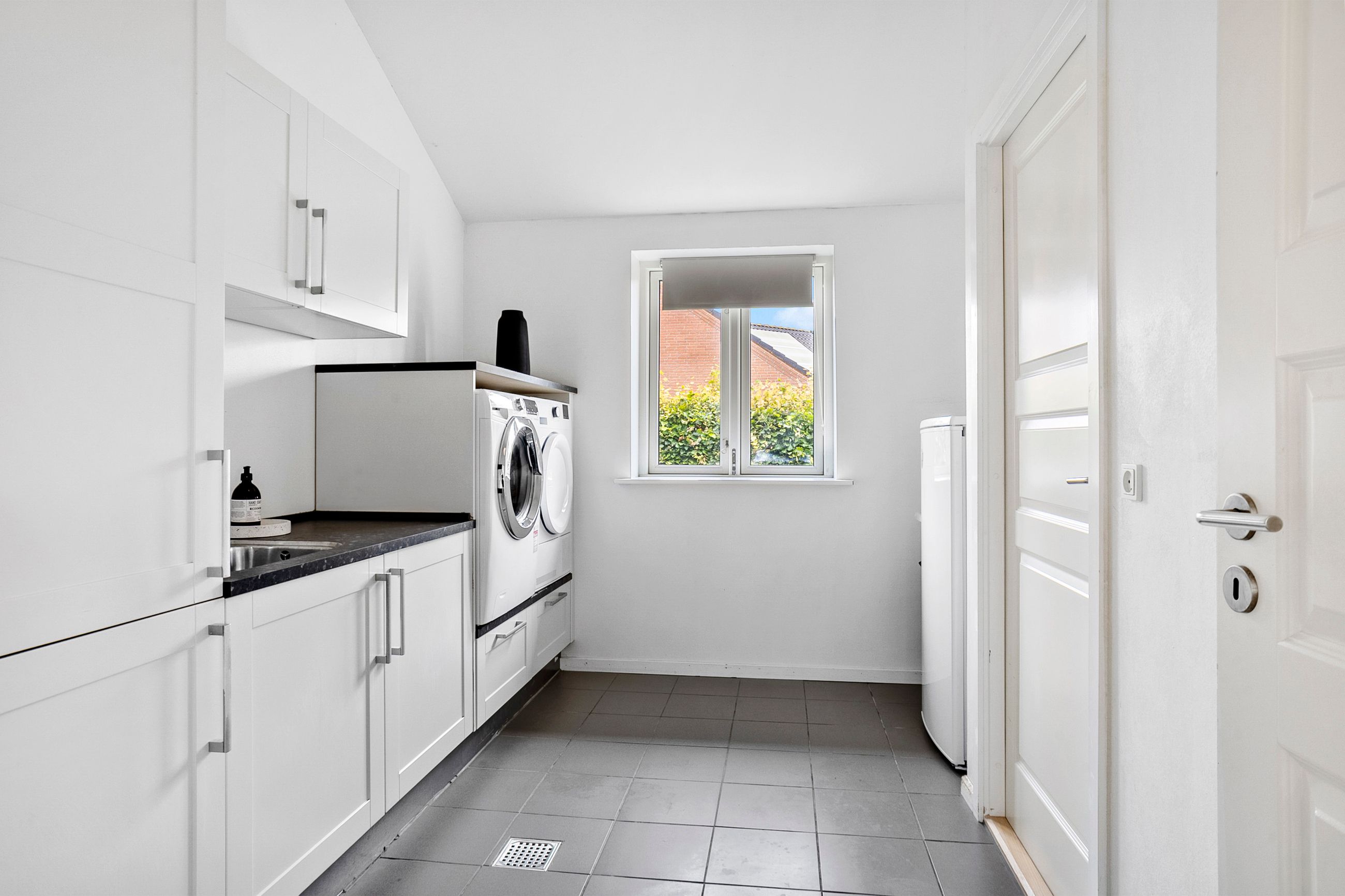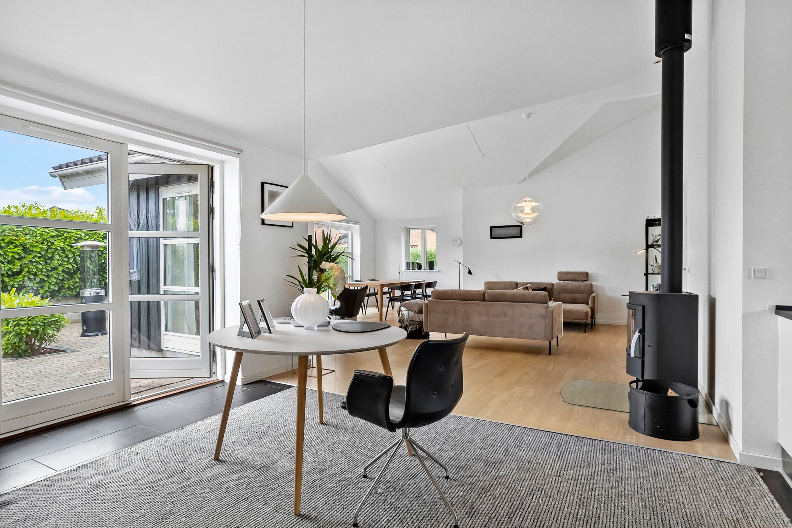 Fra alrummet er der direkte udgang til de skønne terrassearealer og den ugenerte have, som er omkranset af en høj hæk, der giver masser af privatliv. I haven finder du også en hyggelig udestue, ideel til sene aftentimer eller som ekstra opholdsrum året rundt.