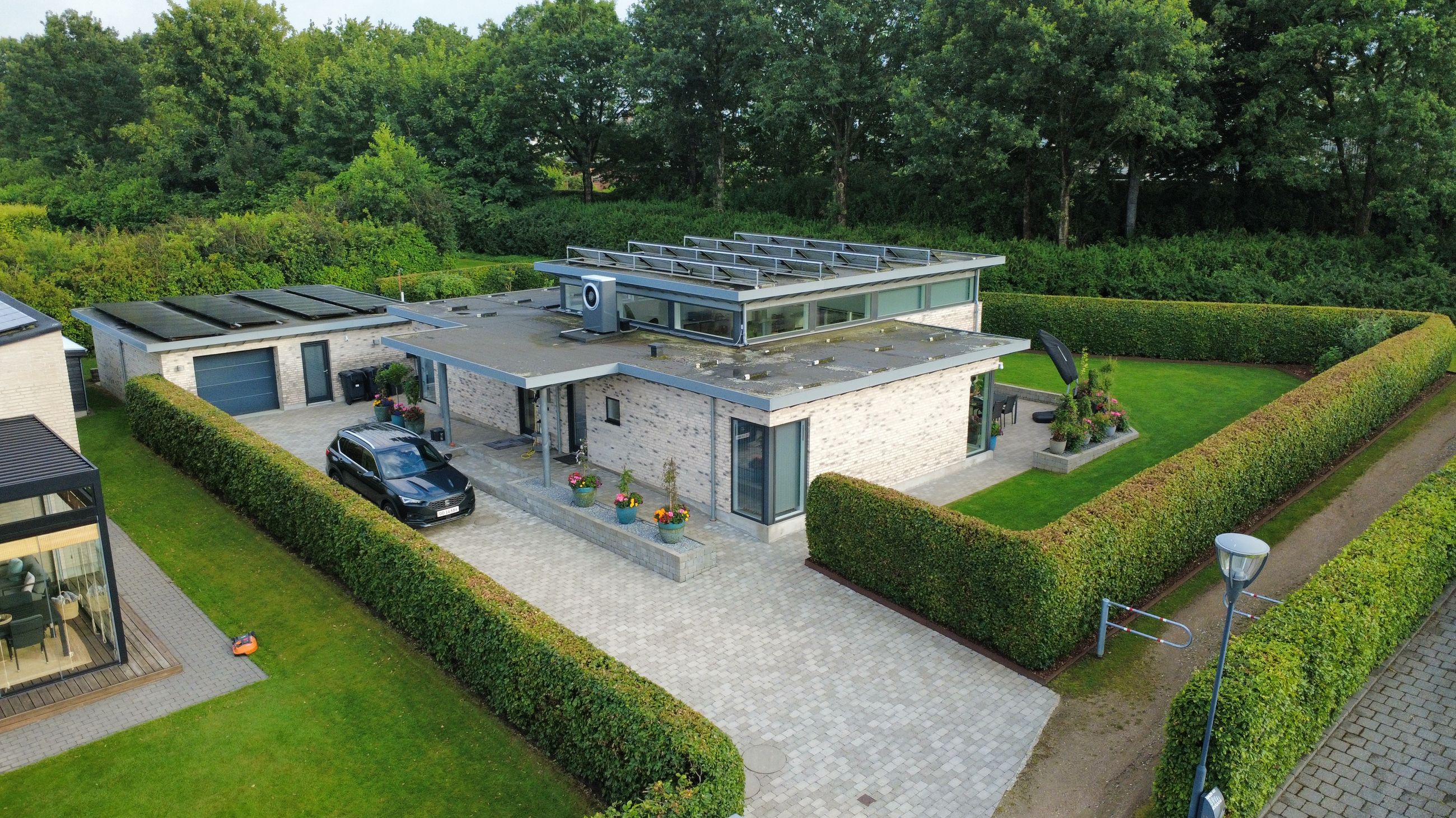 Denne unikke funkisvilla ligger ugeneret for enden af en lukket vej og byder på en eksklusiv kombination af moderne design og funktionalitet. Haven er anlagt med cortenstål og indfarvet træflis, hvilket skaber et stilrent udtryk og kræver minimal vedligeholdelse – perfekt til den travle familie.