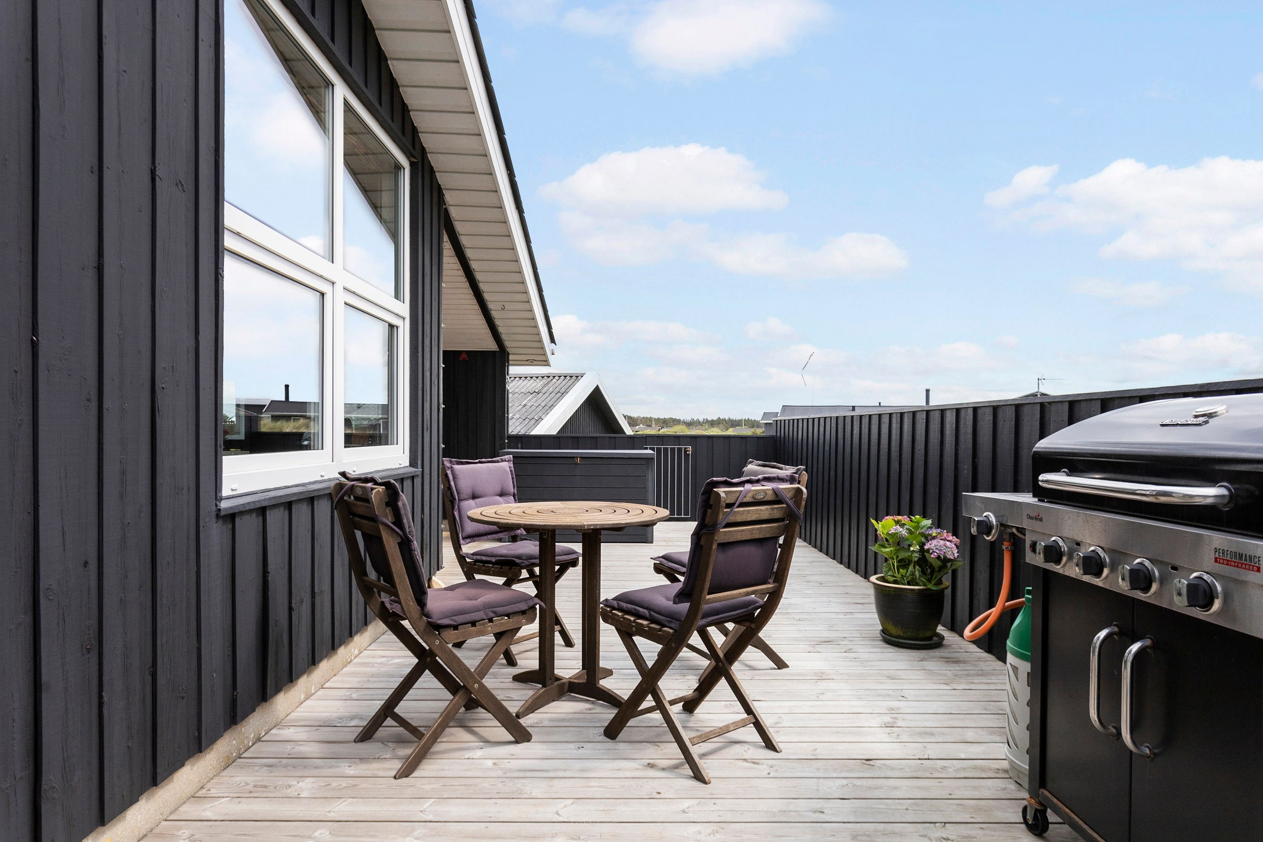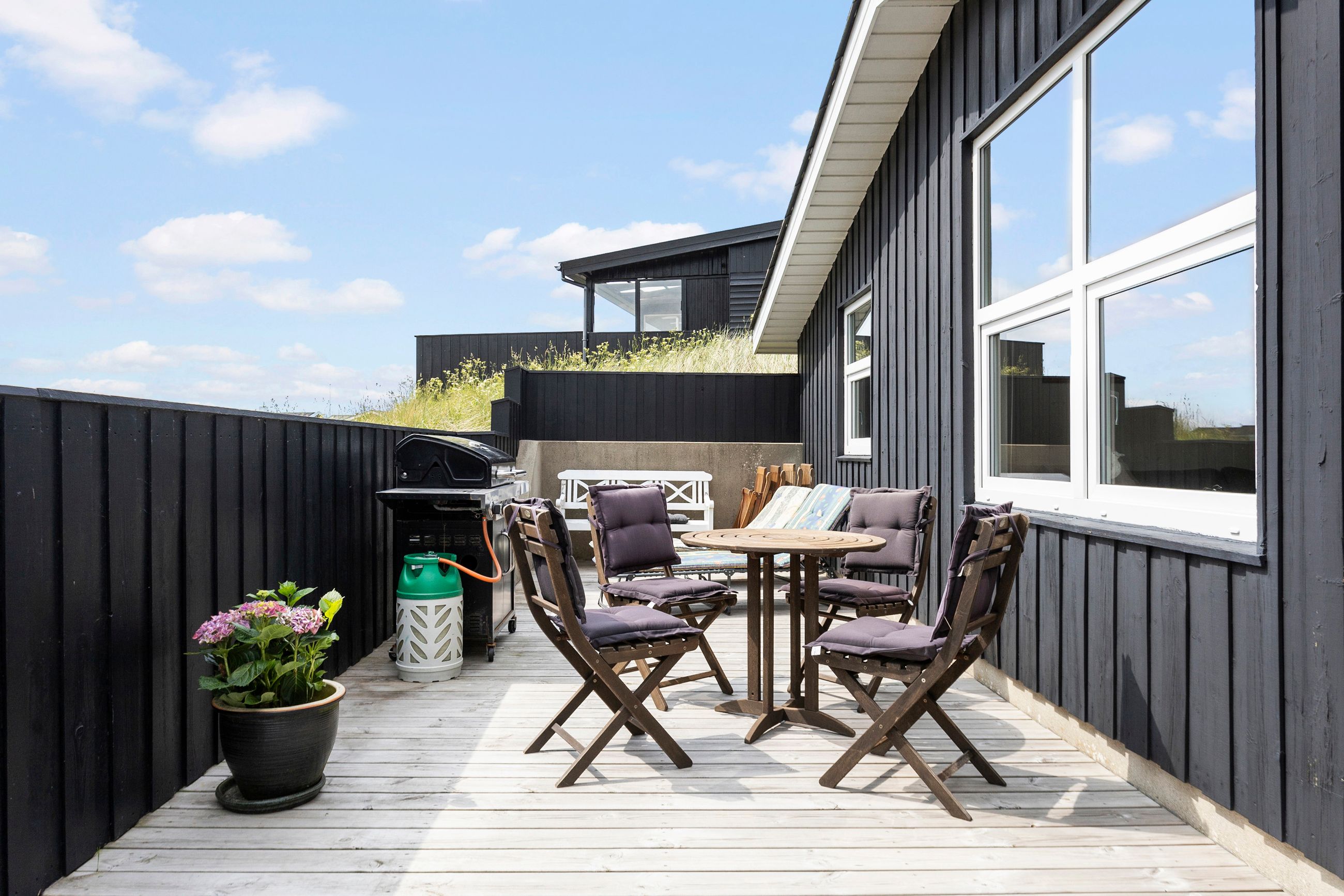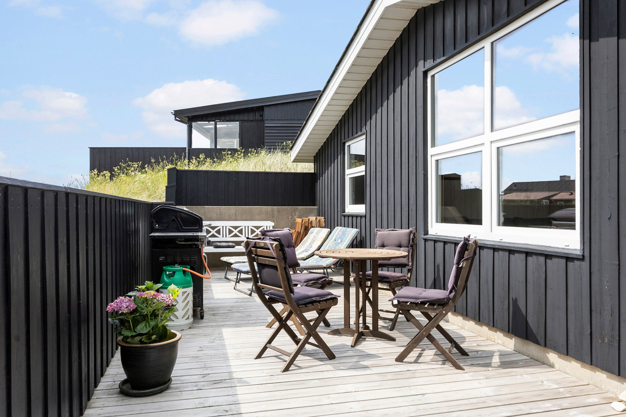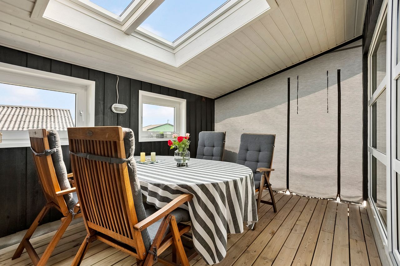 En af husets helt særlige kvaliteter er den overdækkede terrasse, hvor et speciallavet sejl giver en udestue-fornemmelse og forlænger udesæsonen markant. Her kan du nyde både morgenkaffen og de lune sommeraftener, uanset vejret. Dertil kommer flere skønne terrassearealer omkring huset – ideelle til solbadning, grill og hygge under åben himmel.