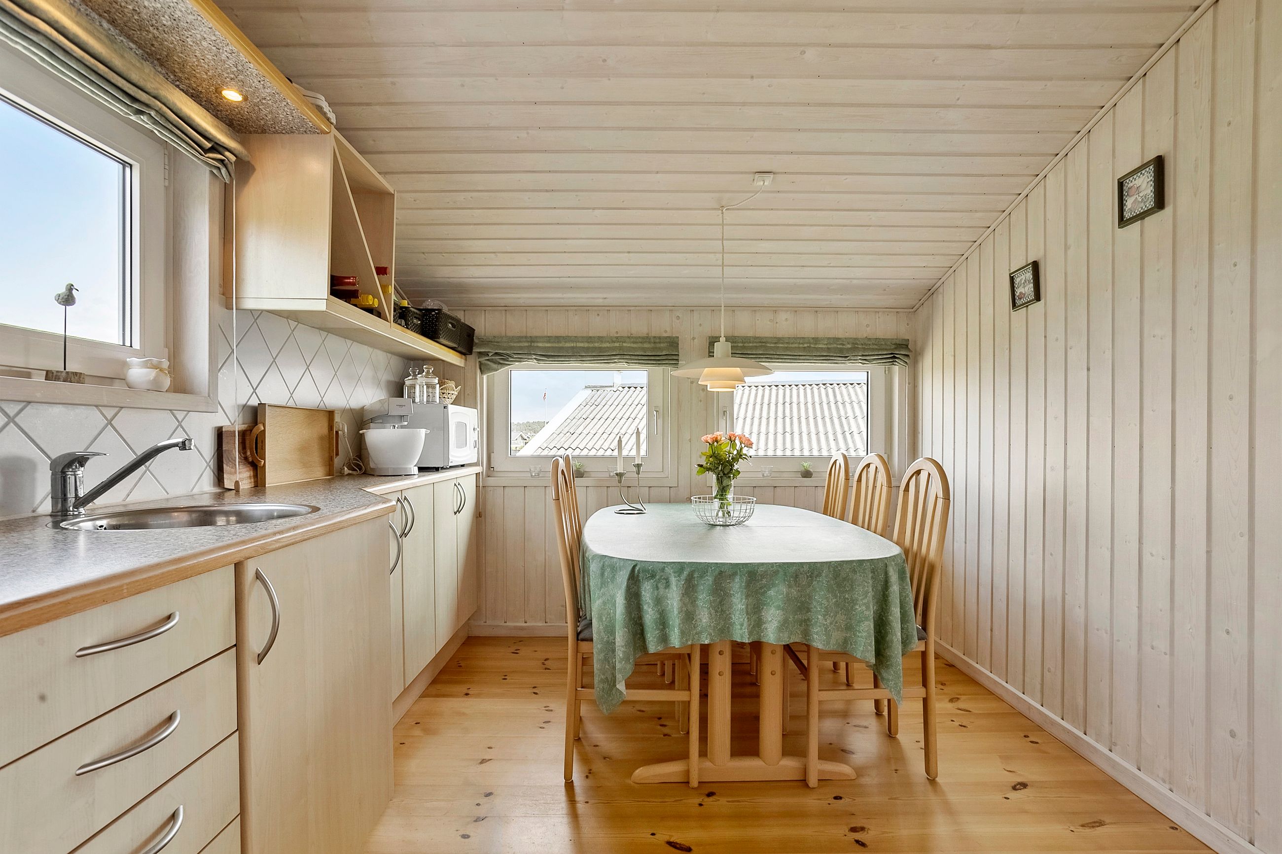Huset rummer 59 veludnyttede kvadratmeter med en varm og indbydende atmosfære. Her er to gode værelser, et rummeligt badeværelse samt et dejligt opholdsrum, hvor køkken og stue smelter sammen i en åben og lys planløsning – perfekt til både afslapning og samvær.