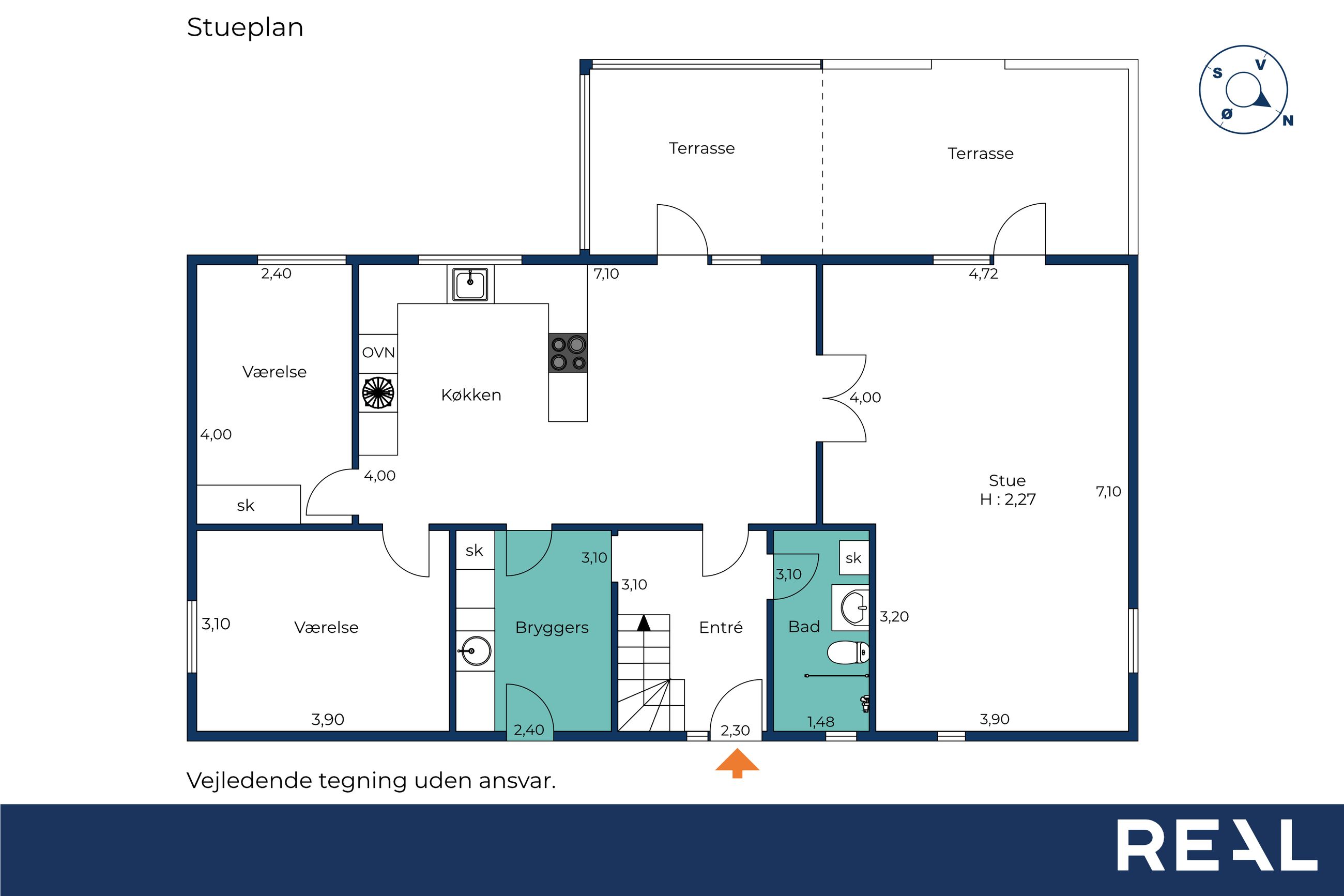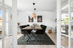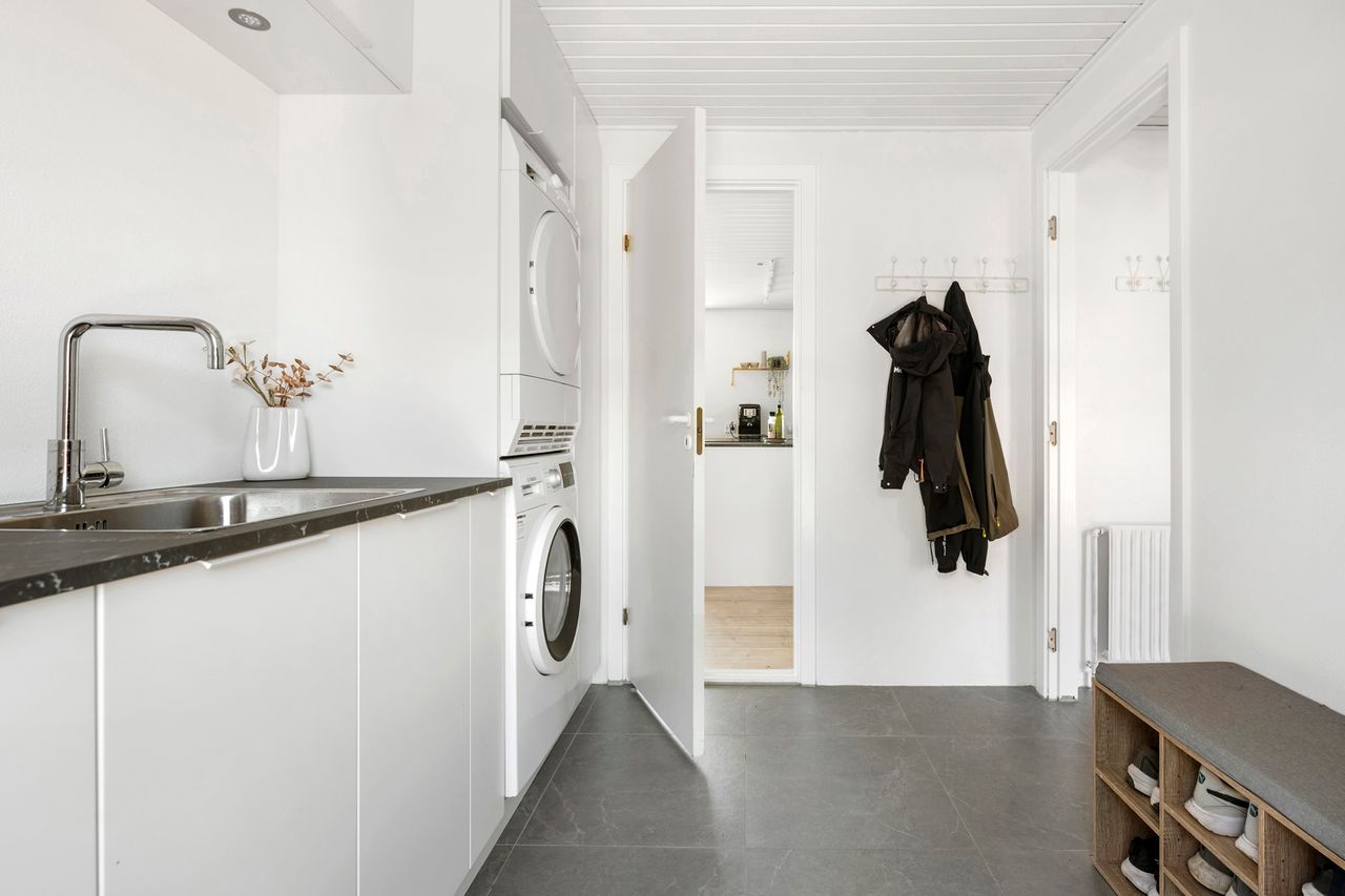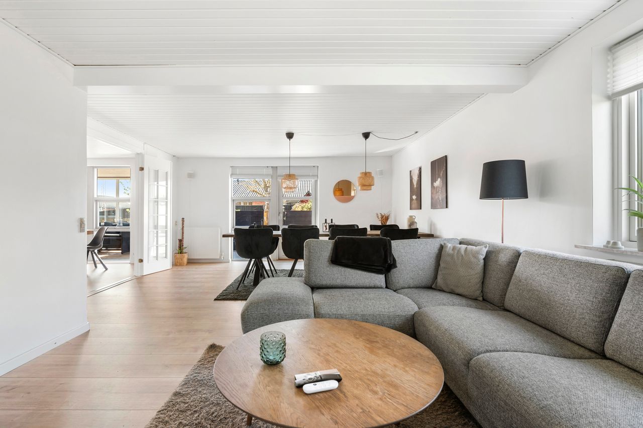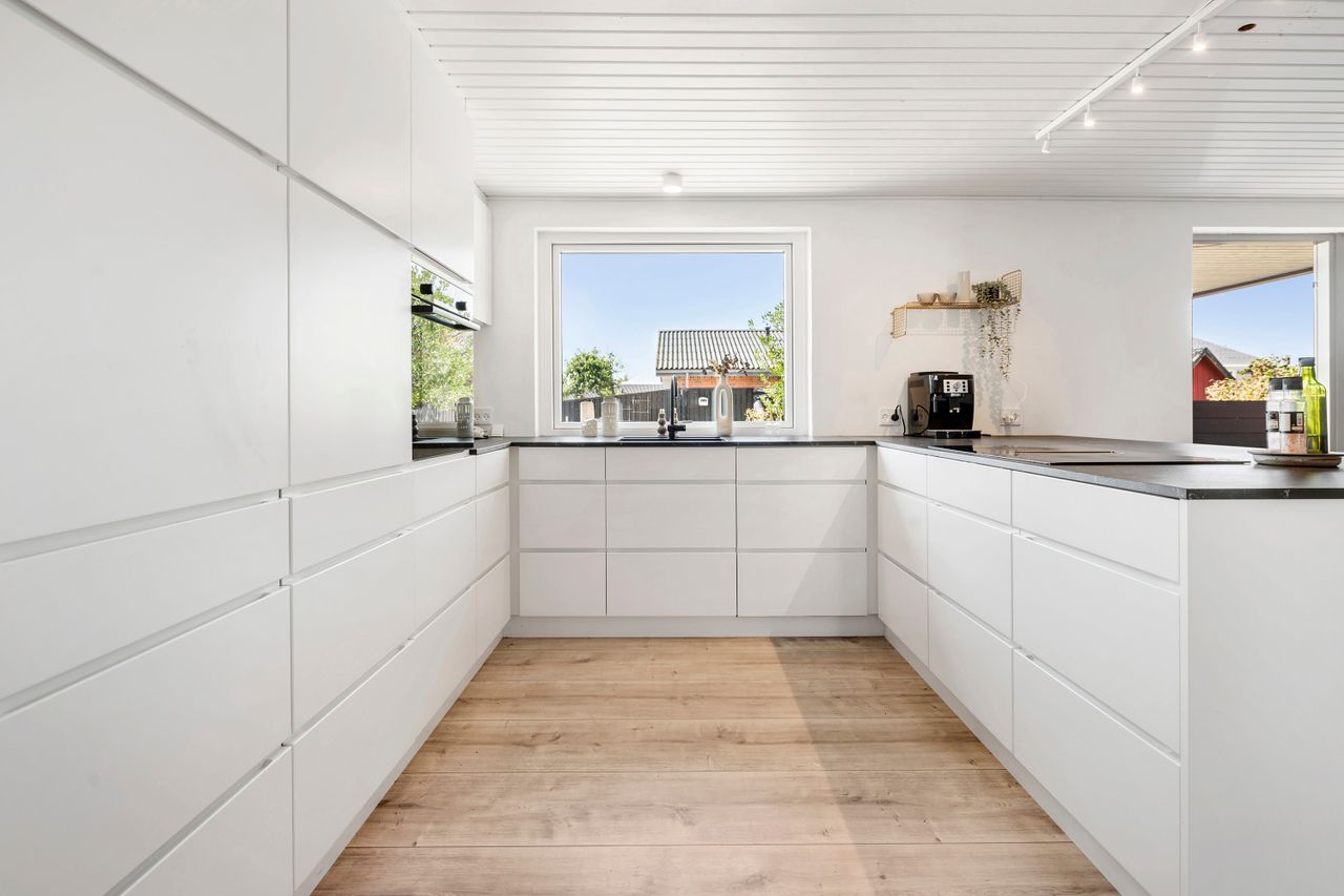 I stueplan bydes du velkommen i det store køkken-alrum, som fungerer som husets naturlige samlingspunkt. Det skønne lysindfald og udgangen til terrassen gør rummet ideelt til både hverdagsliv og hyggelige middage.