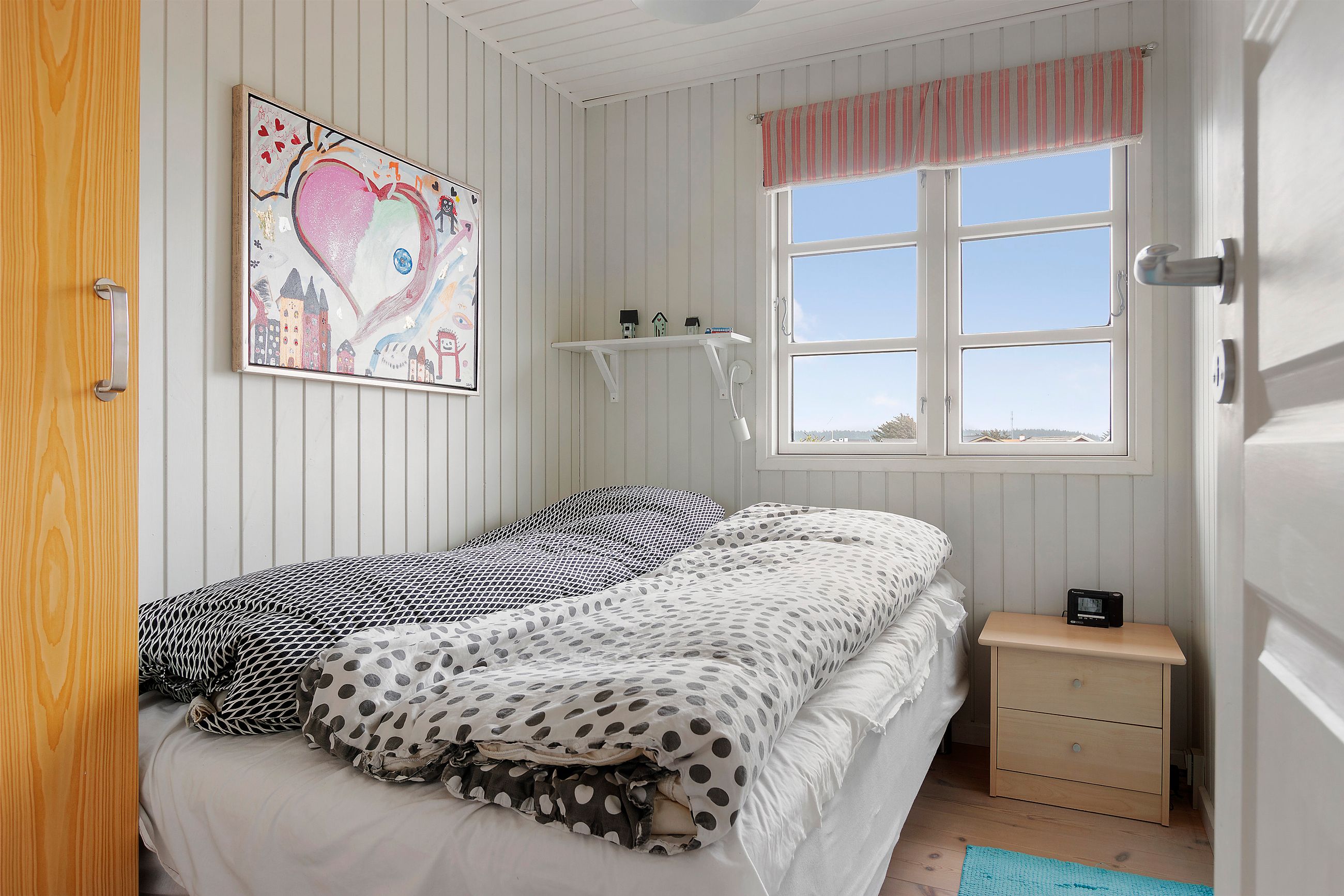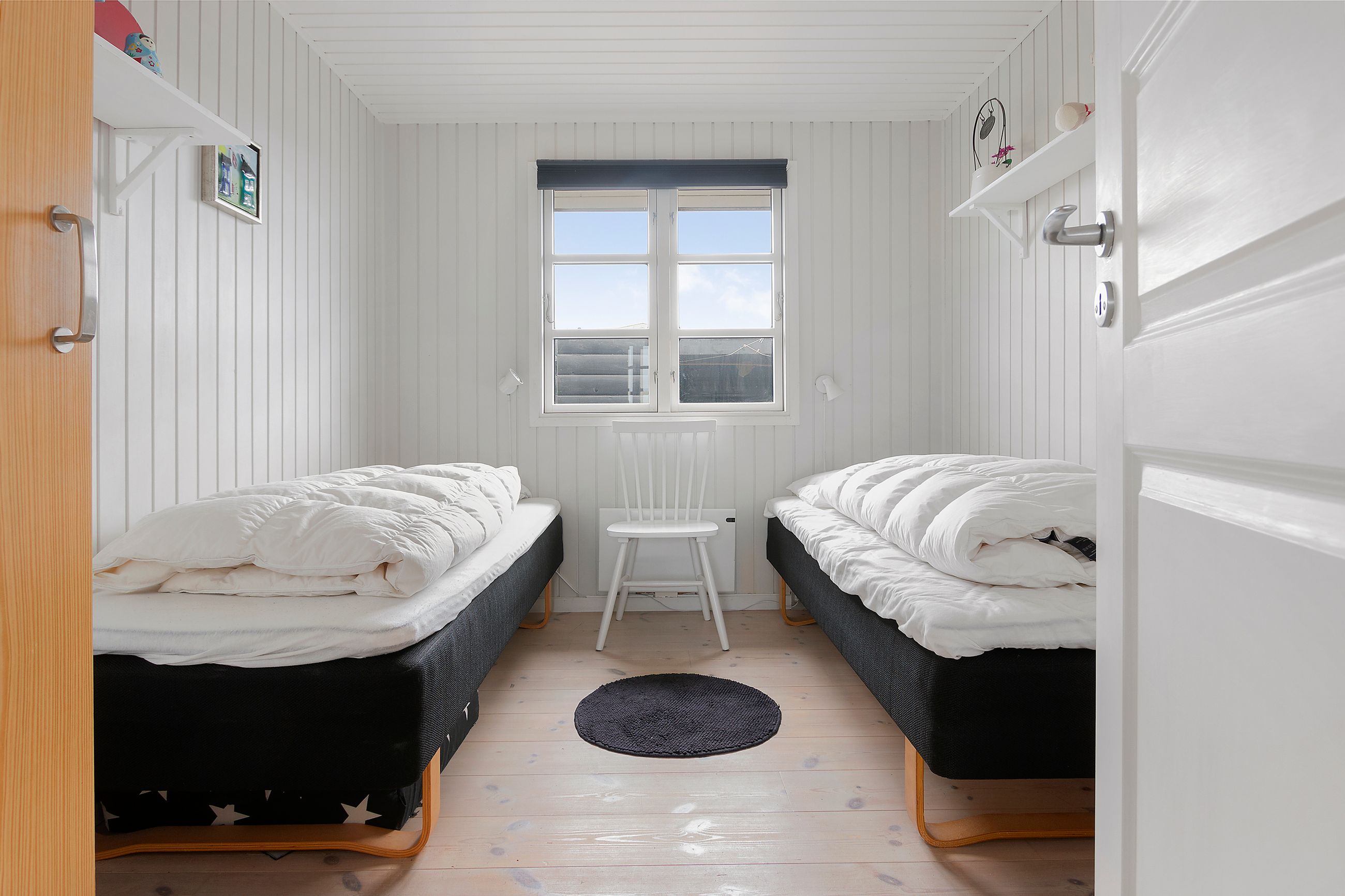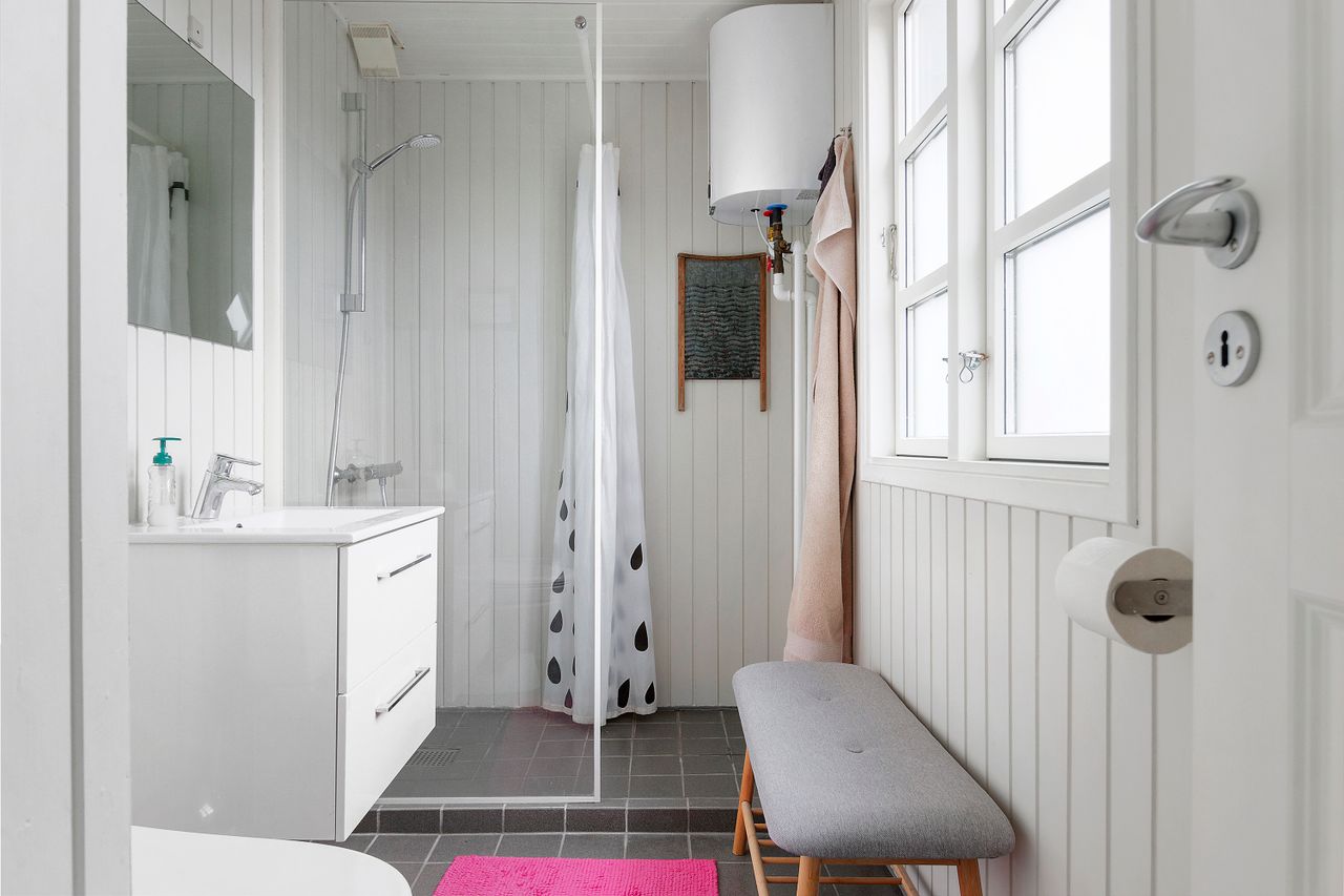 Boligens to soveværelser er enkelt og funktionelt indrettede med god opbevaringsplads, og badeværelset er stilrent med brus, vask og toilet – alt holdt i en rolig og enkel stil.
