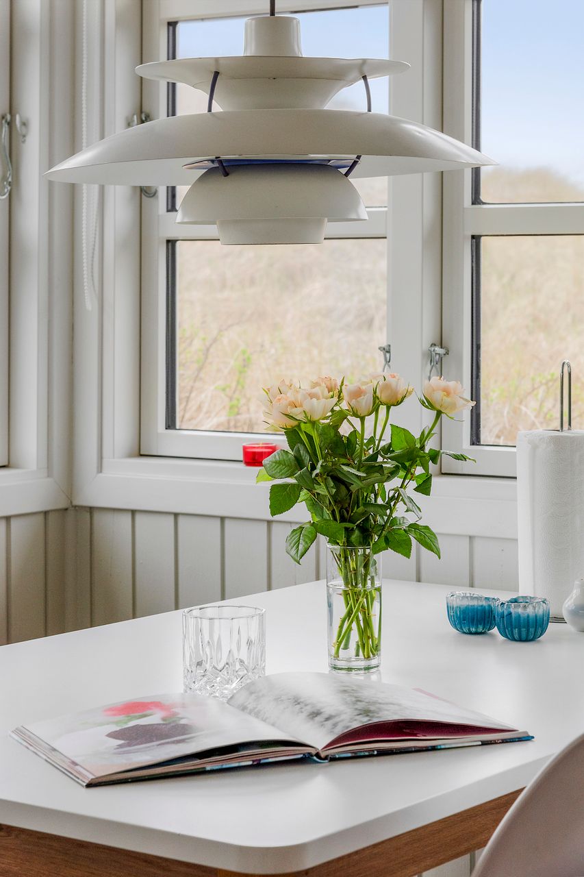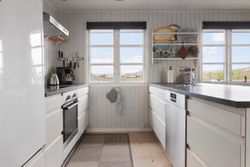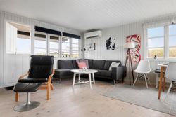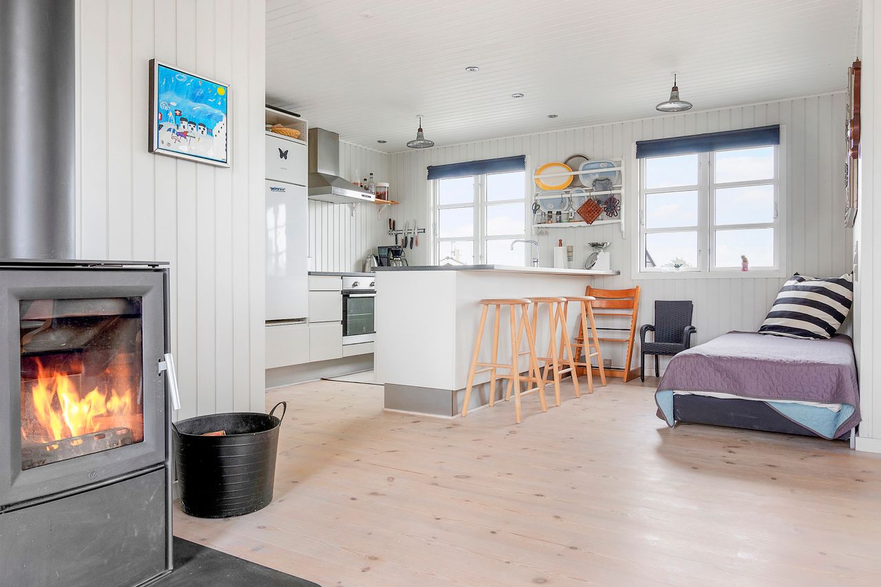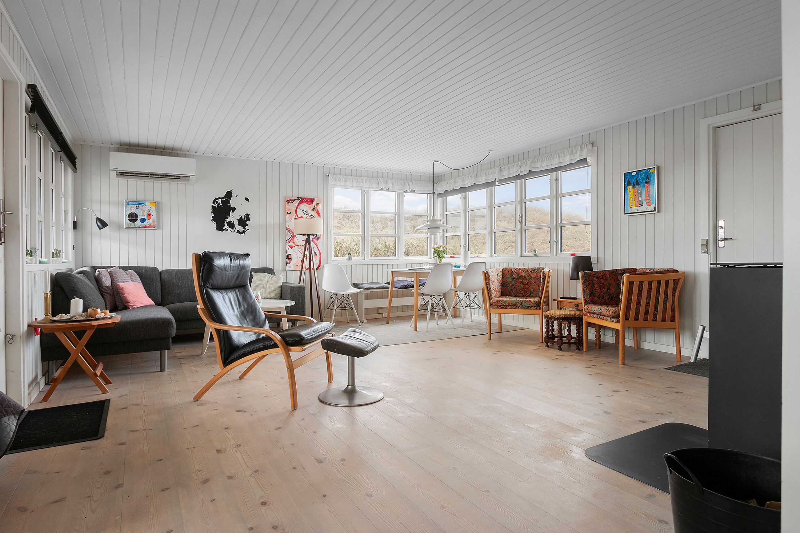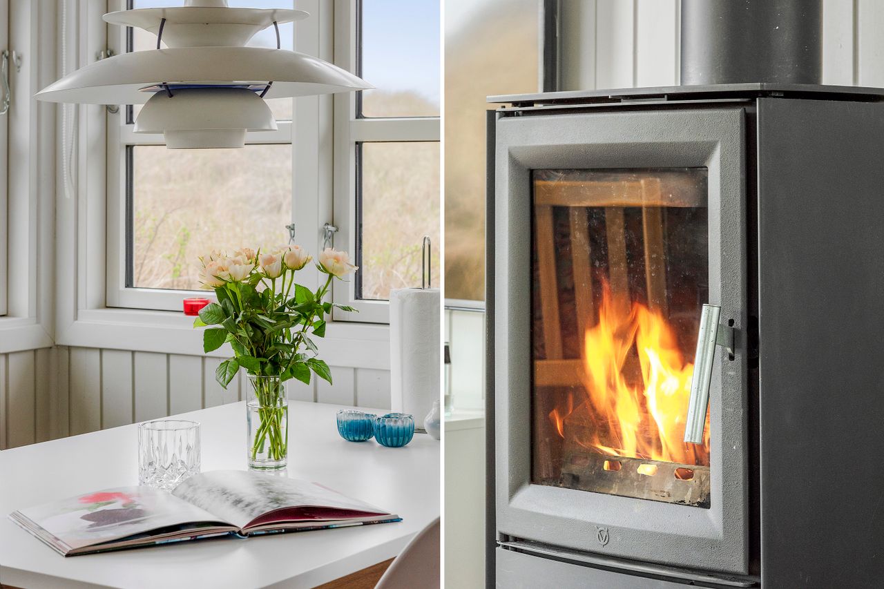 Sommerhuset emmer af varme og personlighed. Den rummelige stue med store vinduespartier og brændeovn danner rammen om både hverdagsro og feriestemning. Her er lys, luft og plads til både stille stunder og livlige familietimer.