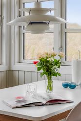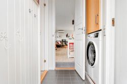 Køkkenet ligger i åben forbindelse med stuen og har en praktisk indretning med god skabsplads og alle nødvendige hårde hvidevarer. En lille halvmur adskiller det fra spiseområdet, hvor et langbord indbyder til lange middage og hyggelige spil- og snakkestunder.