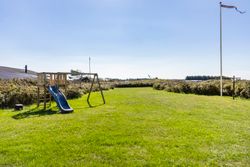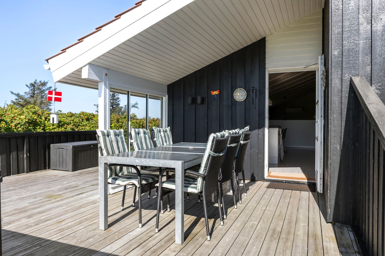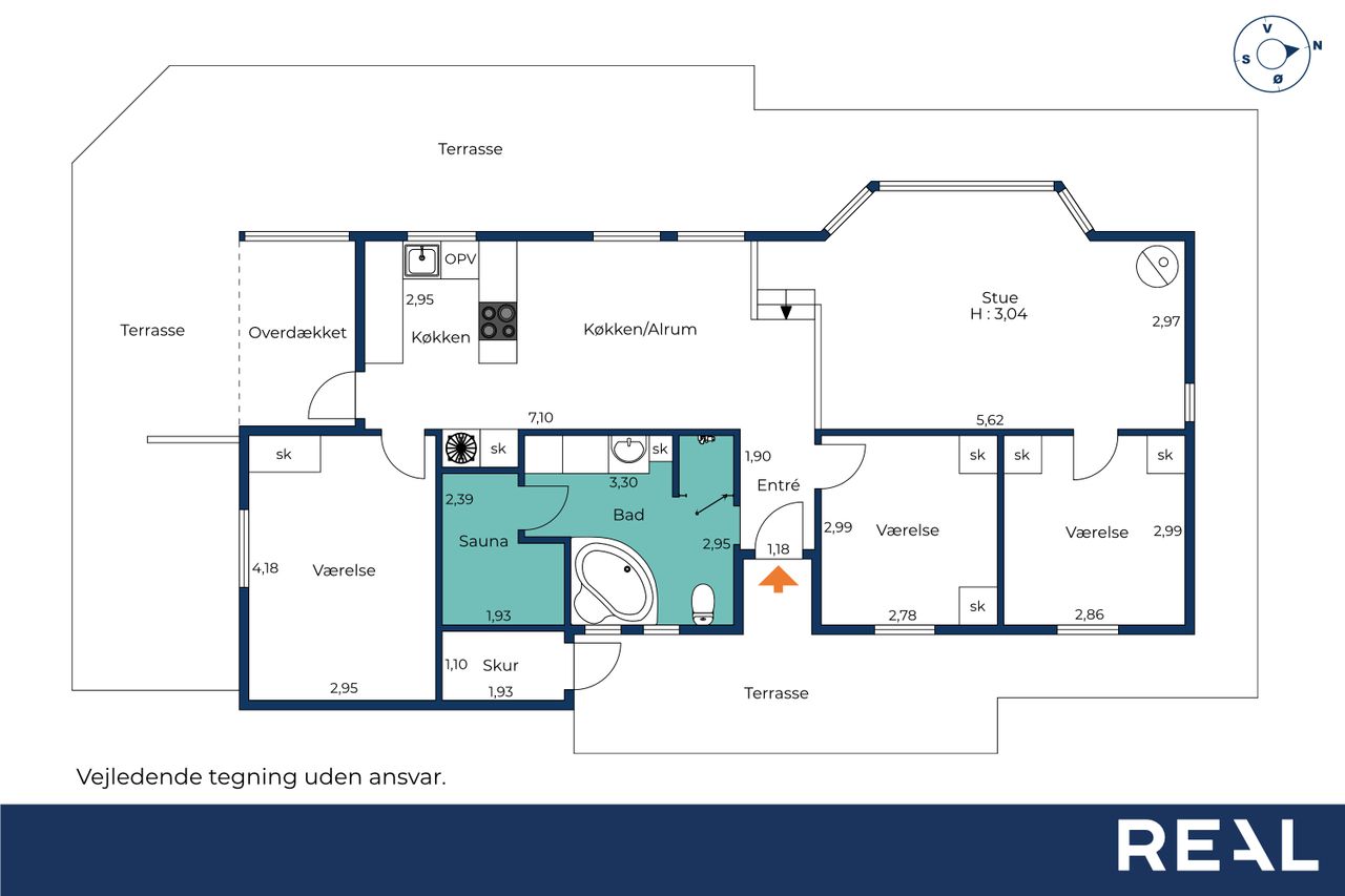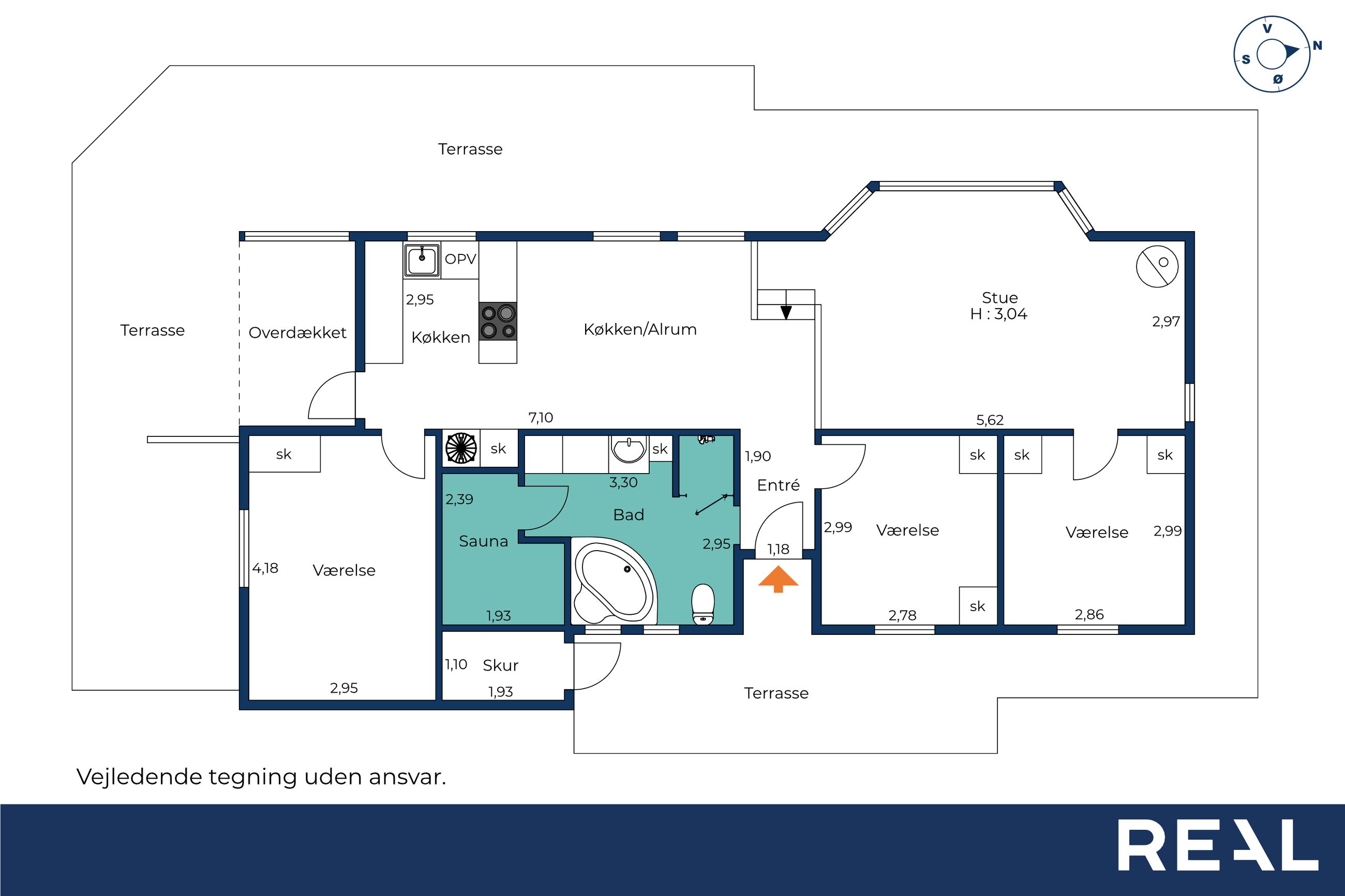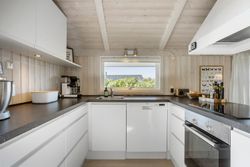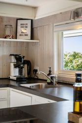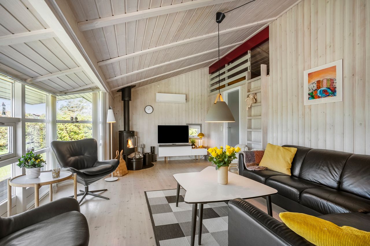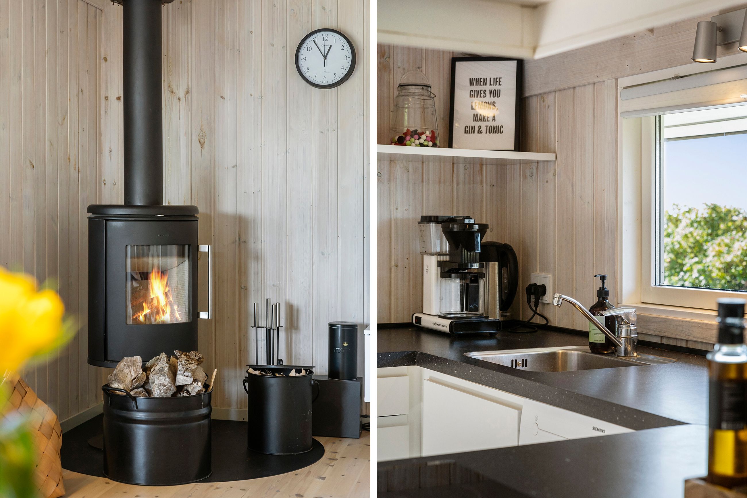 I husets hjerte ligger det store køkken-alrum med brændeovn, der skaber varme og hygge på kølige aftener. Herfra er der direkte udgang til en skøn overdækket terrasse, hvor du kan sidde længe og nyde udelivet – uanset vejr og vind. Grunden er helt lukket og privat, så børnene kan lege frit, og du selv kan nyde solen hele dagen.
