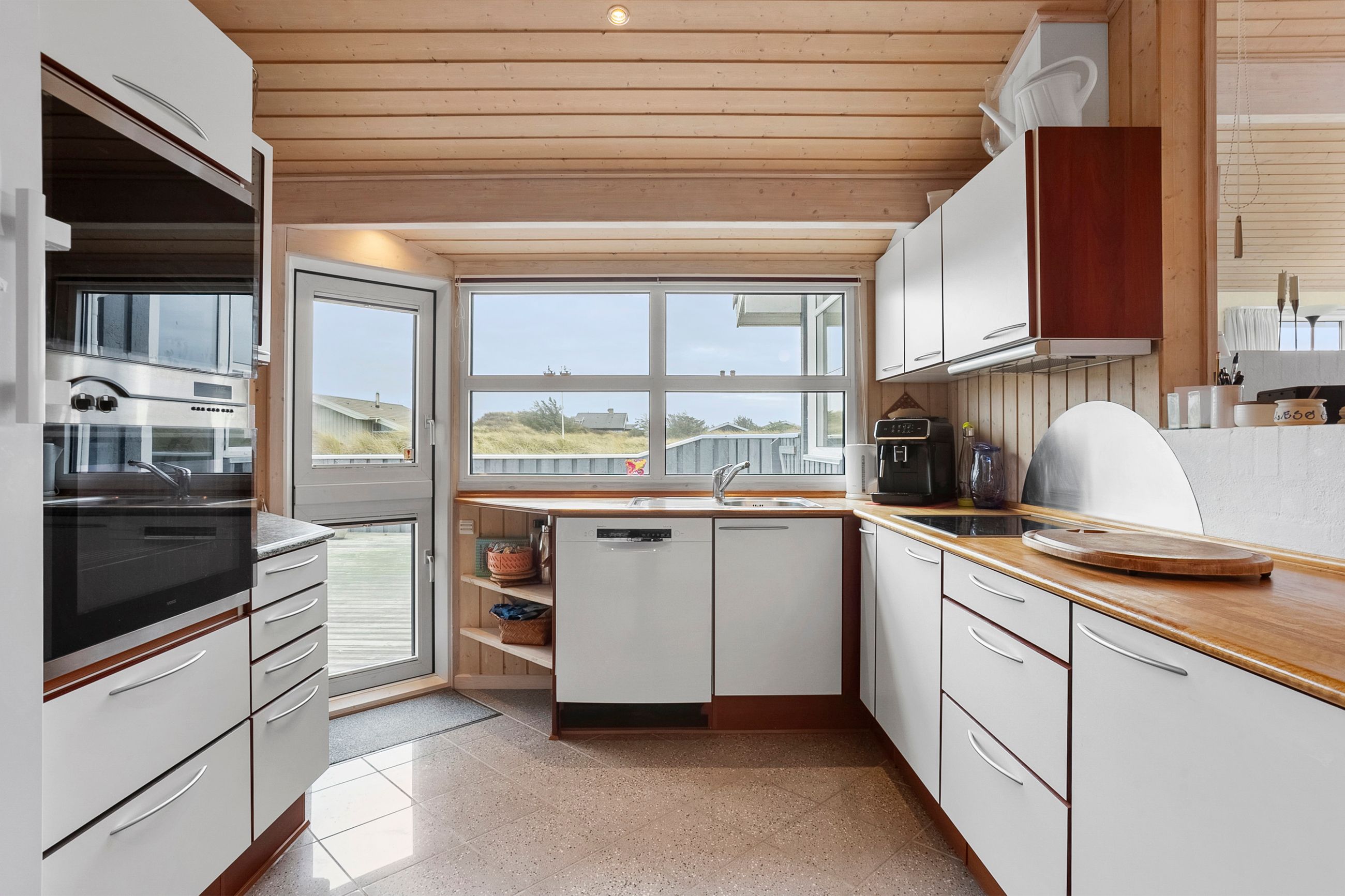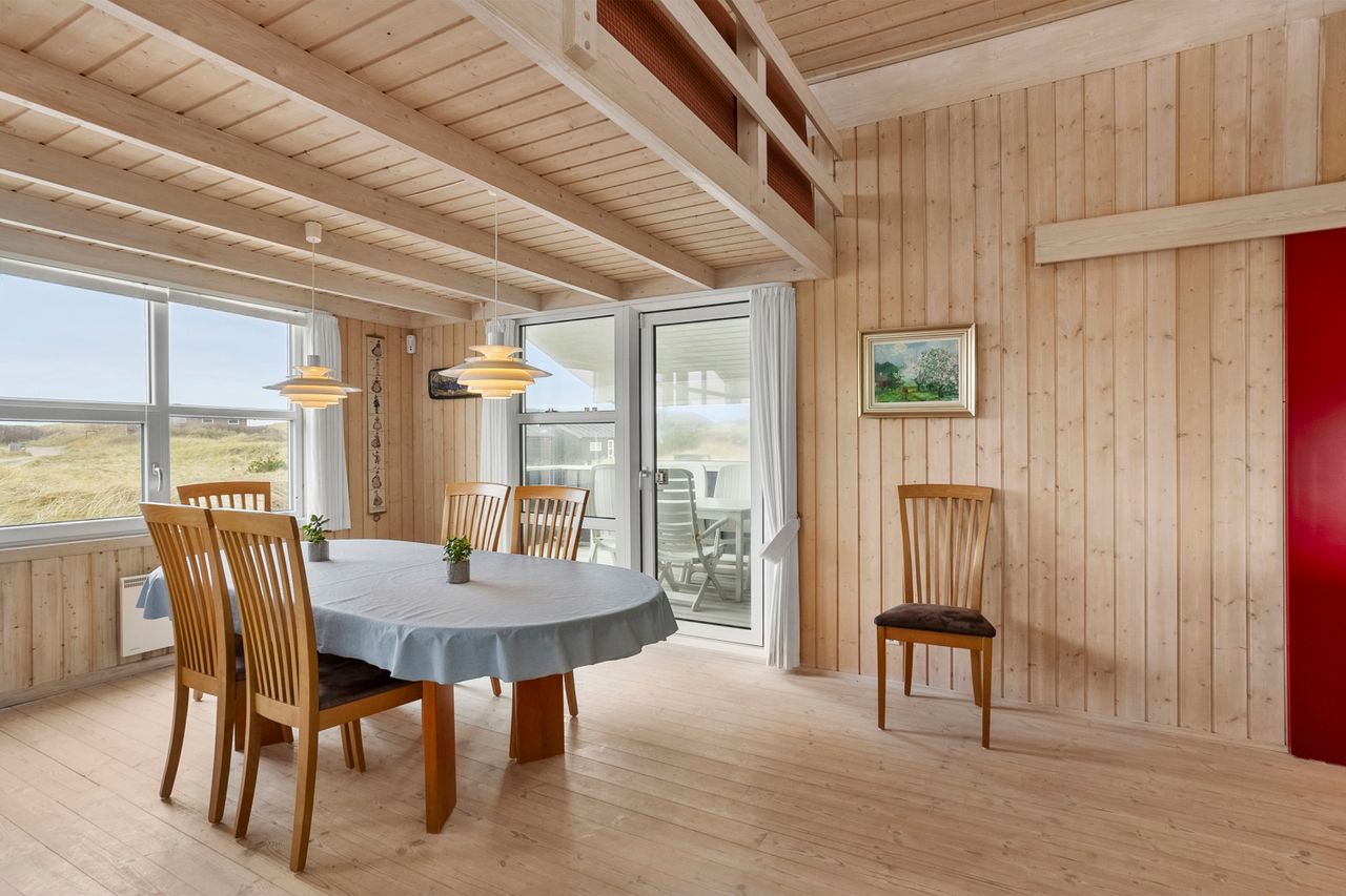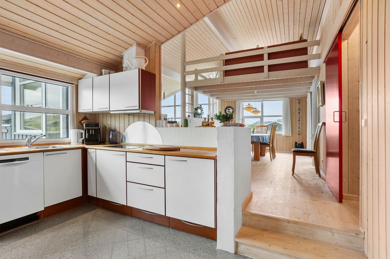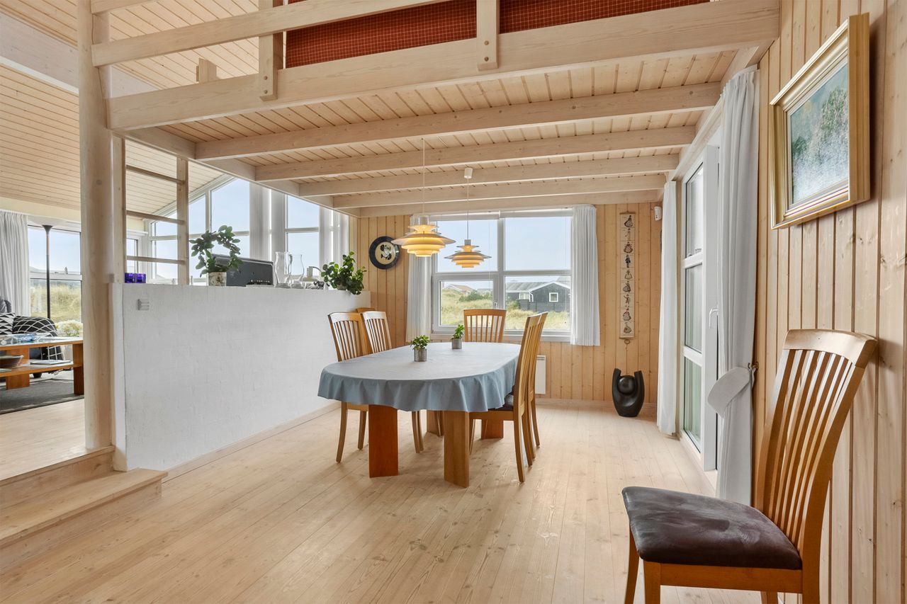 Husets hjerte er det lyse og indbydende køkken i åben forbindelse med spisestuen, hvor samvær og feriehygge er i fokus. Den rummelige stue imponerer med et skønt lysindfald fra de store vinduespartier og en dejlig udsigt til det omkringliggende klitlandskab – naturen bliver en naturlig del af indretningen.