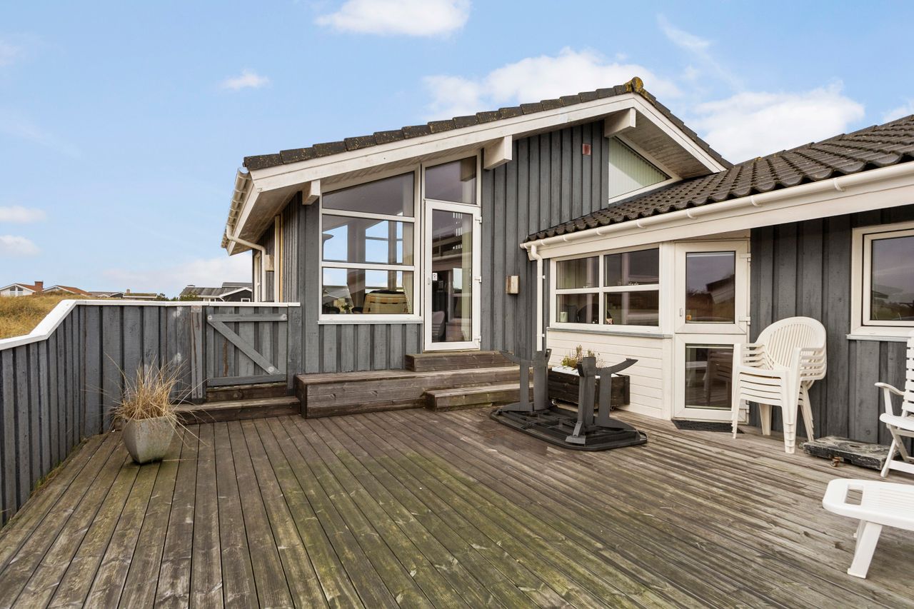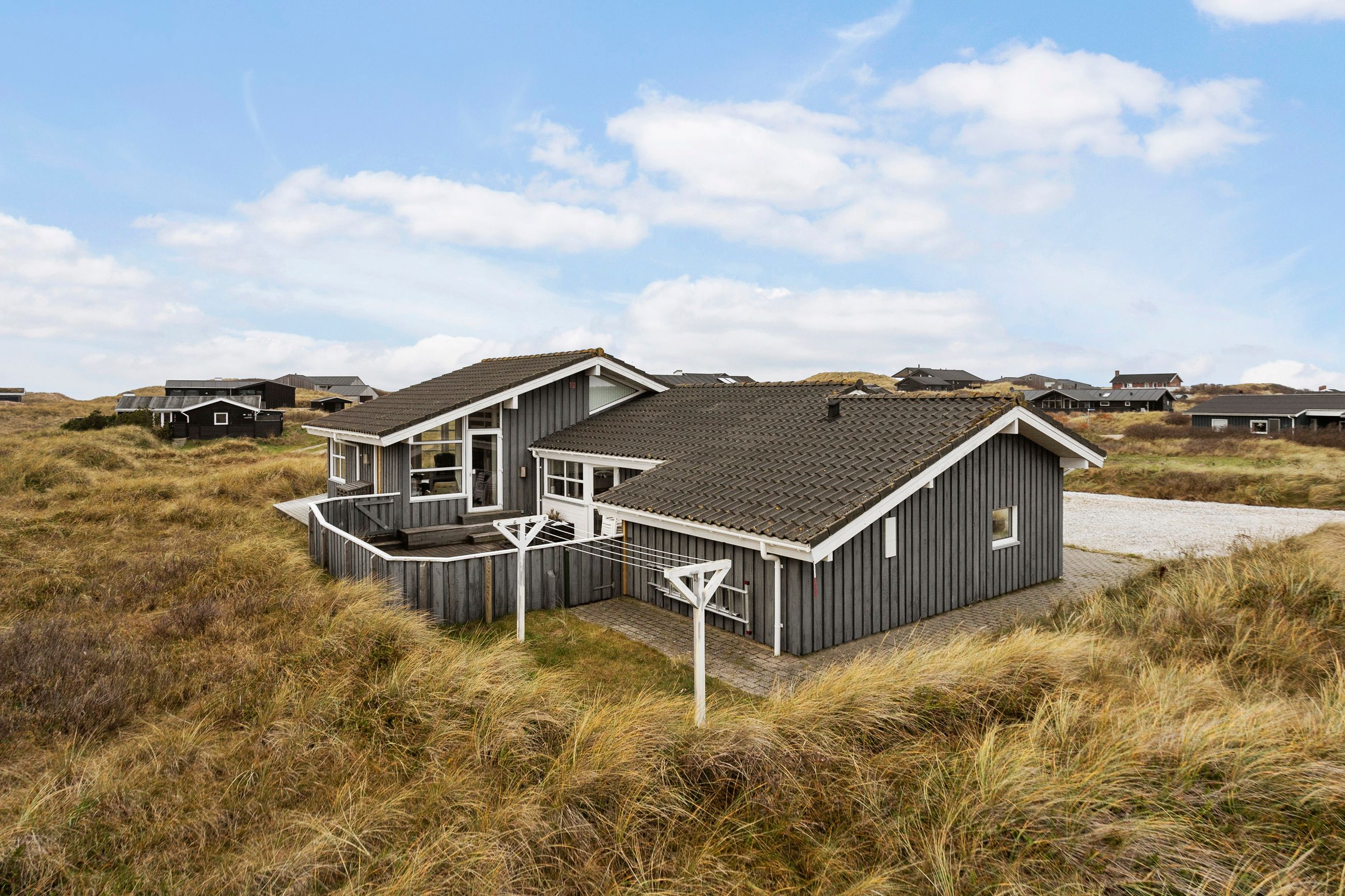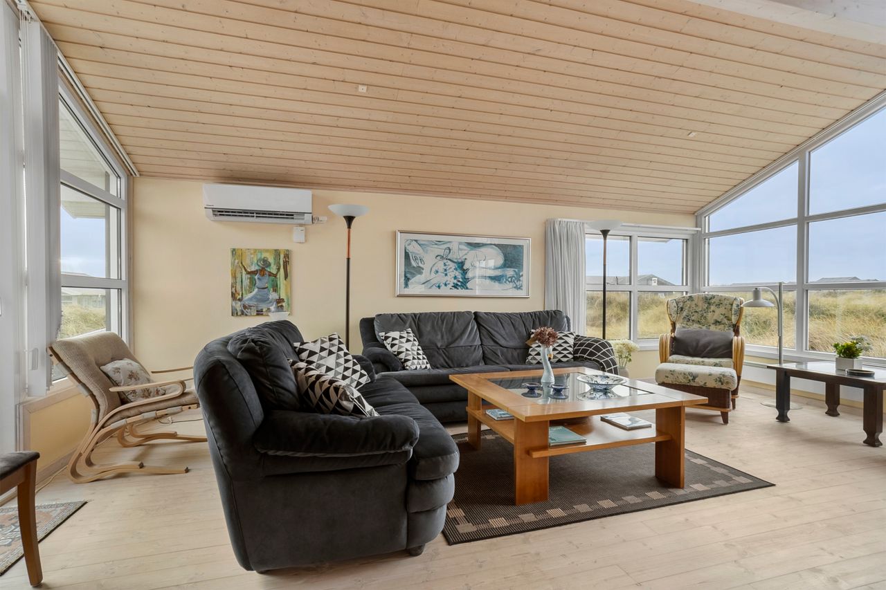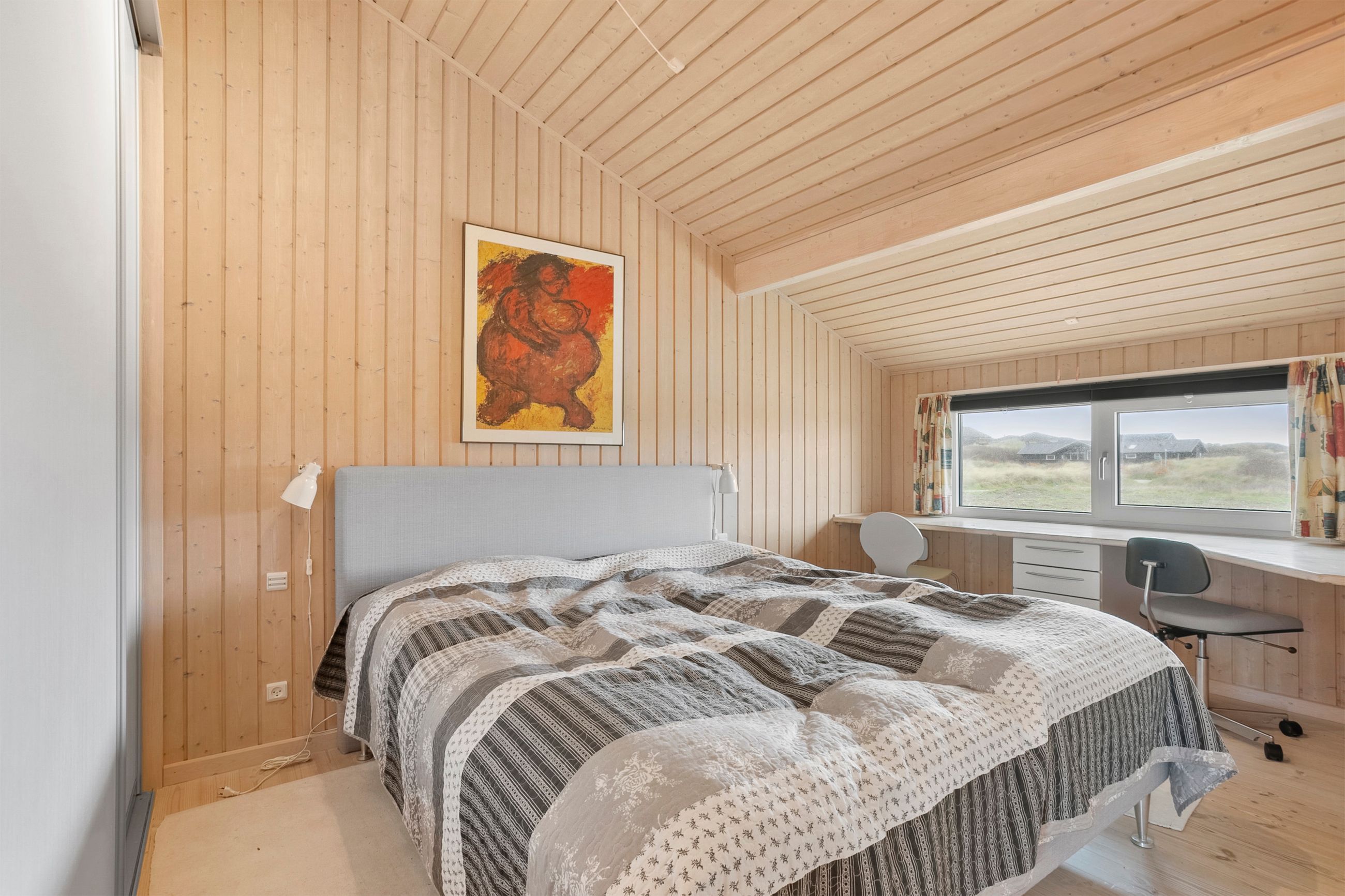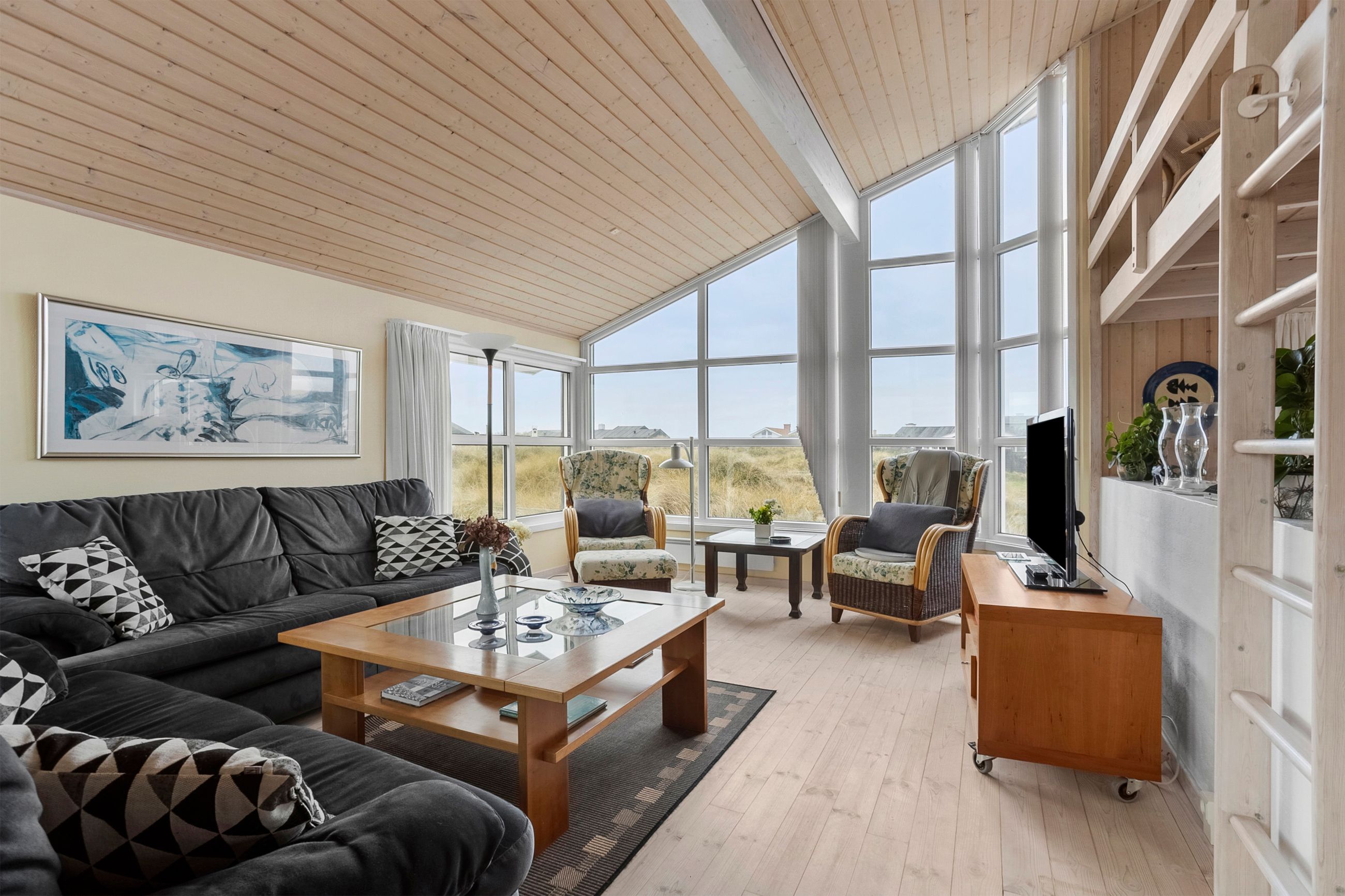 Husets hjerte er det lyse og indbydende køkken i åben forbindelse med spisestuen, hvor samvær og feriehygge er i fokus. Den rummelige stue imponerer med et skønt lysindfald fra de store vinduespartier og en dejlig udsigt til det omkringliggende klitlandskab – naturen bliver en naturlig del af indretningen.