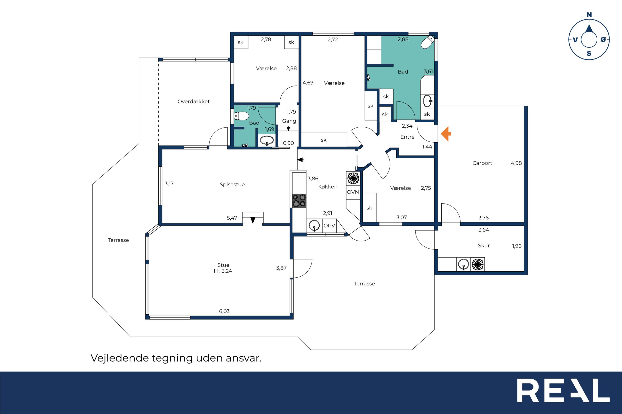 Sommerhuset byder på en gennemtænkt planløsning med tre gode værelser, alle med praktisk skabsplads, samt to badeværelser, hvilket gør huset særdeles velegnet til både familie og gæster. Derudover er der en hems, som kan anvendes til ekstra sovepladser, hyggekrog eller opbevaring.