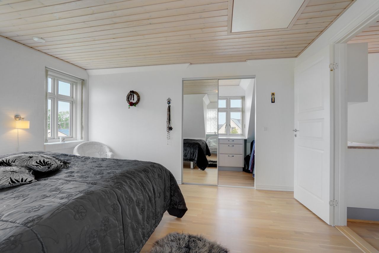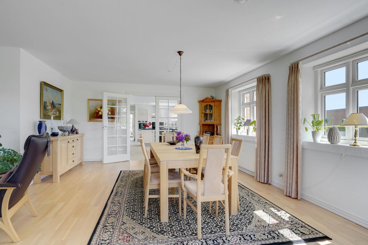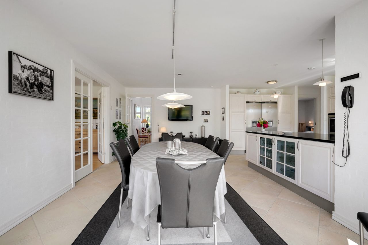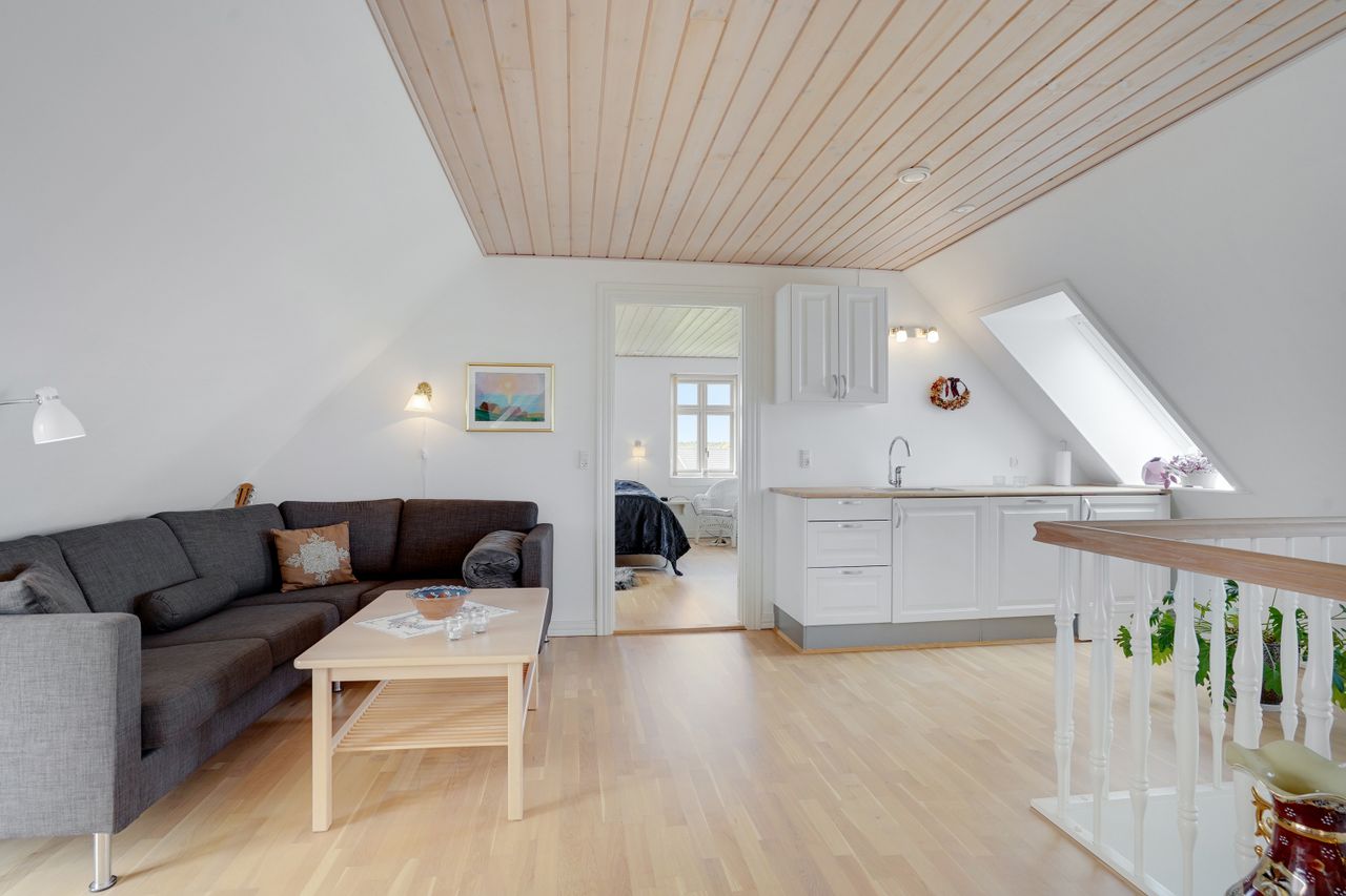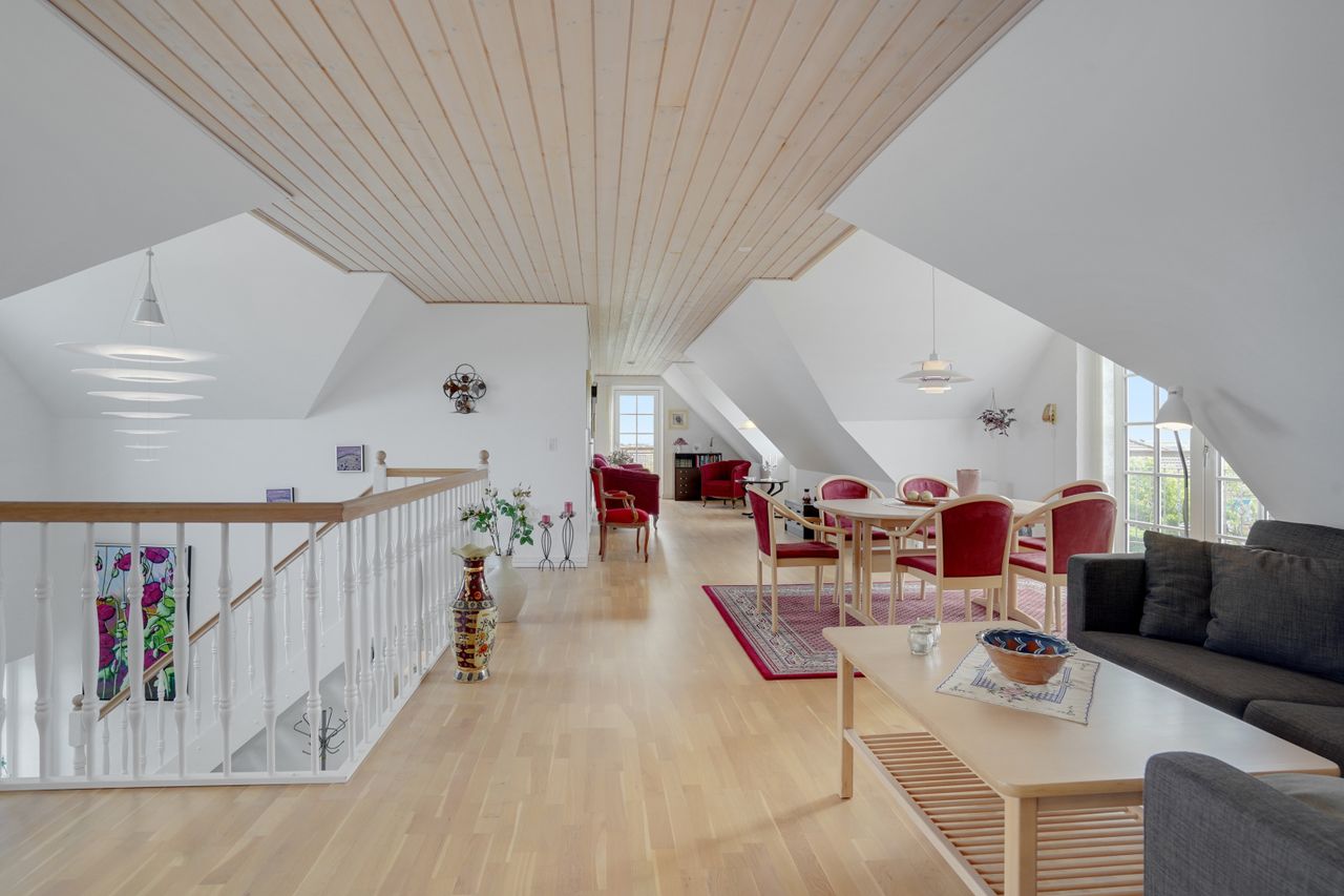 Man kommer ind i en dejlig stor hall, hvor der er adgang til husets store køkken/alrum, som er hjertet i huset. Stor dejlig opholdsstue med trægulv og adgang til haven. Gode værelser. Dejligt rummeligt badeværelse. 1. salen indeholder lyst stue, tekøkken. Stort soveværelse med waæl in skab. Dejlig badeværelse. Værelse/kontor med udgang til altan, herfra flot udsigt over marker, enge mv.