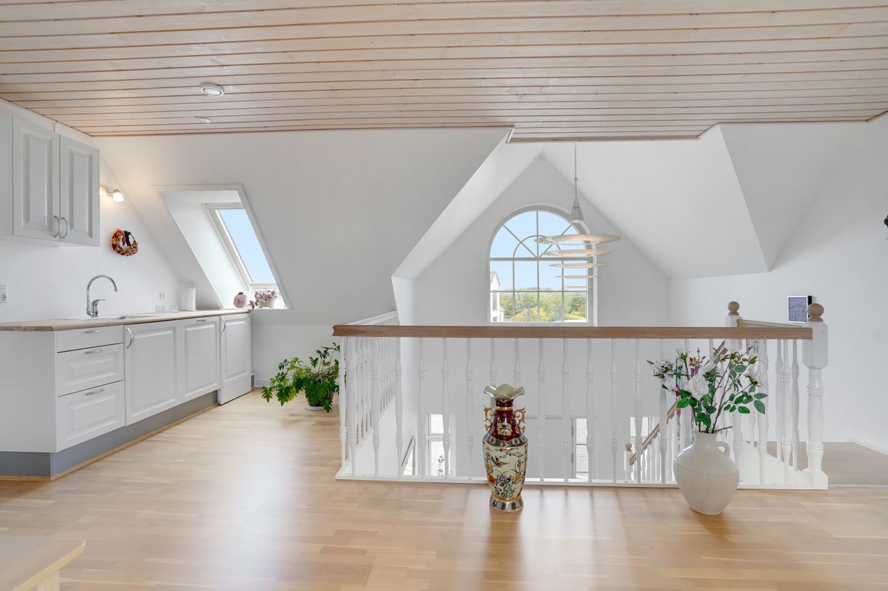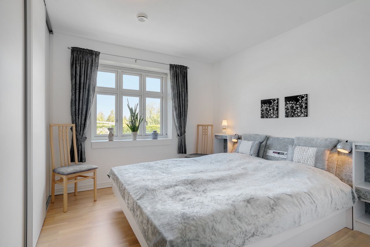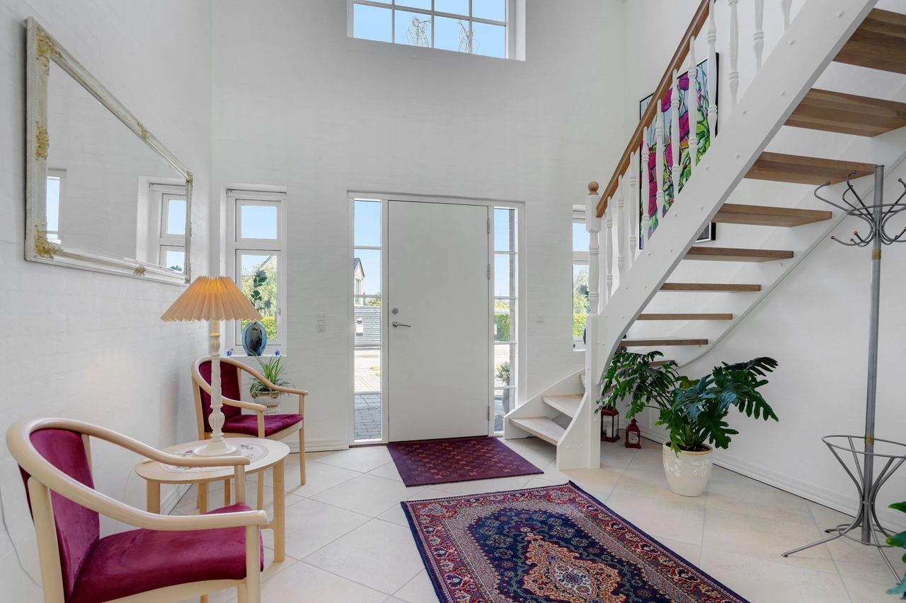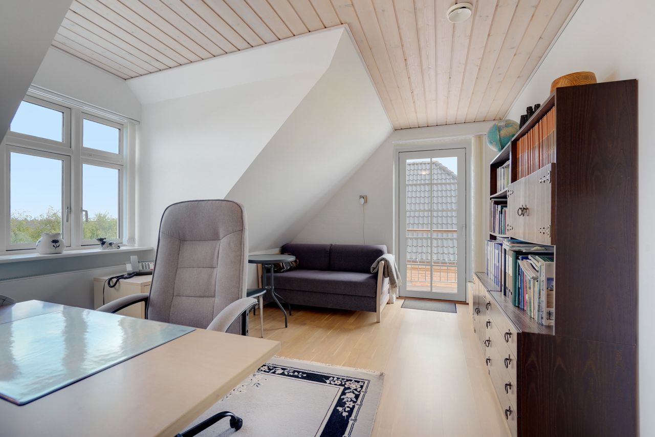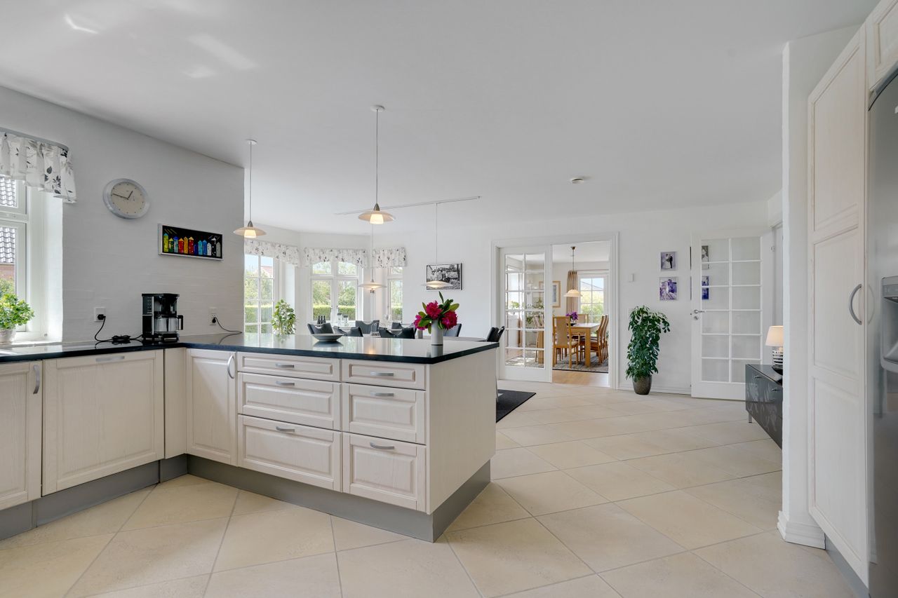 Man kommer ind i en dejlig stor hall, hvor der er adgang til husets store køkken/alrum, som er hjertet i huset. Stor dejlig opholdsstue med trægulv og adgang til haven. Gode værelser. Dejligt rummeligt badeværelse. 1. salen indeholder lyst stue, tekøkken. Stort soveværelse med waæl in skab. Dejlig badeværelse. Værelse/kontor med udgang til altan, herfra flot udsigt over marker, enge mv.