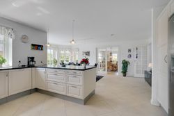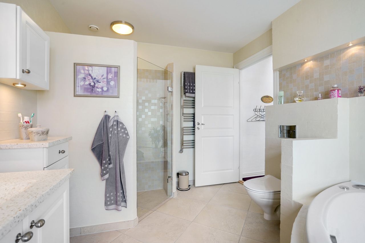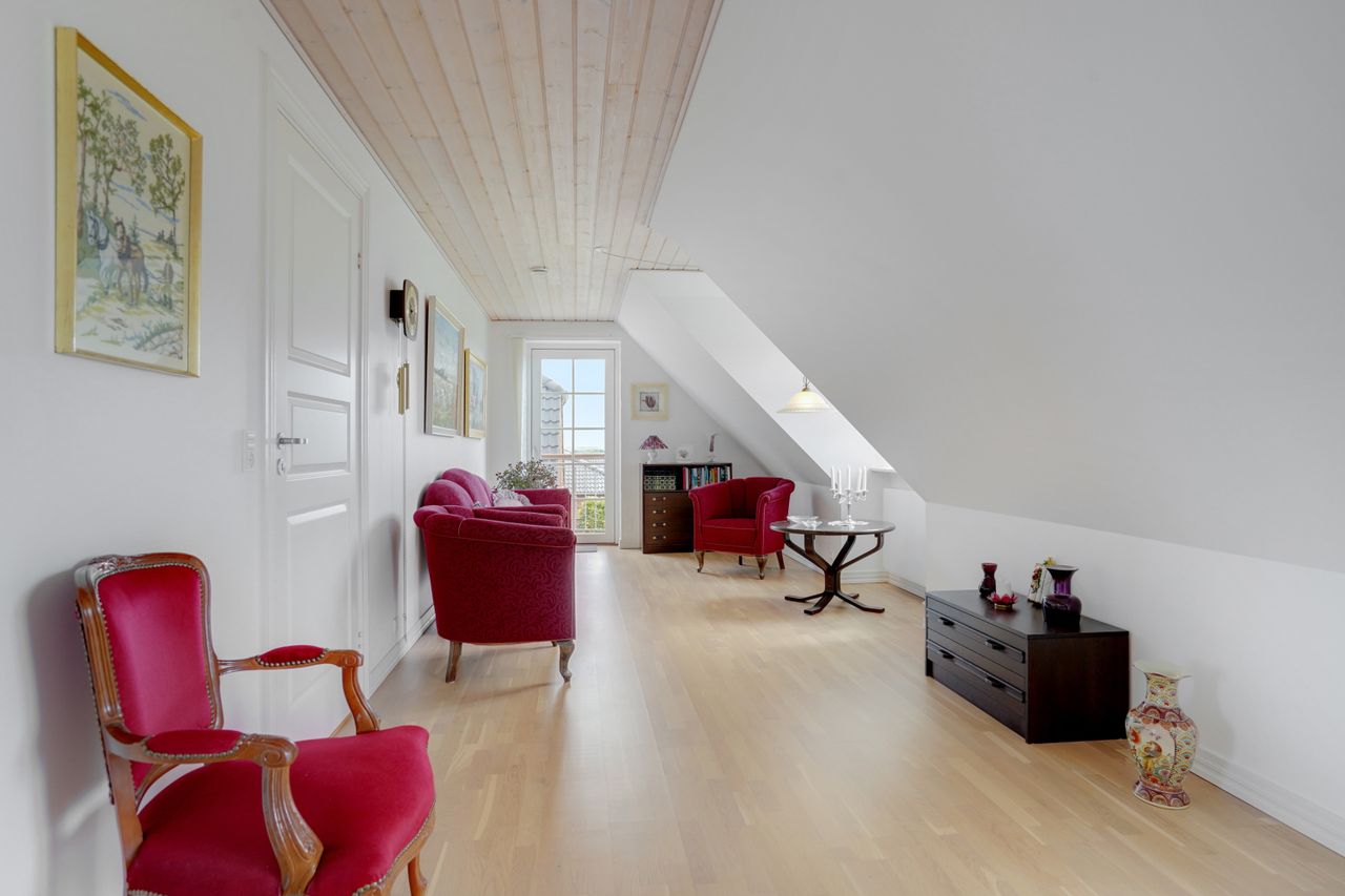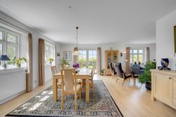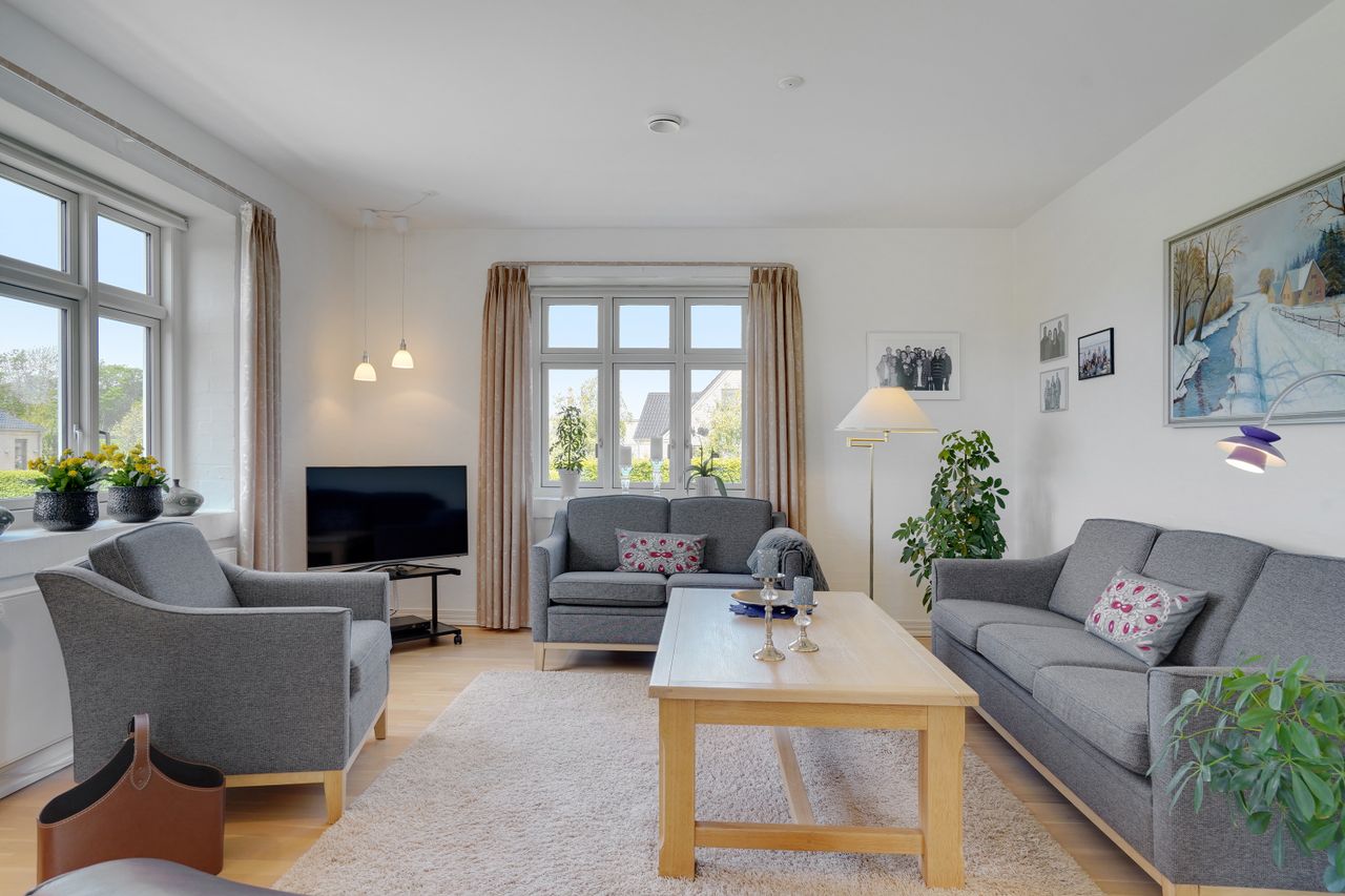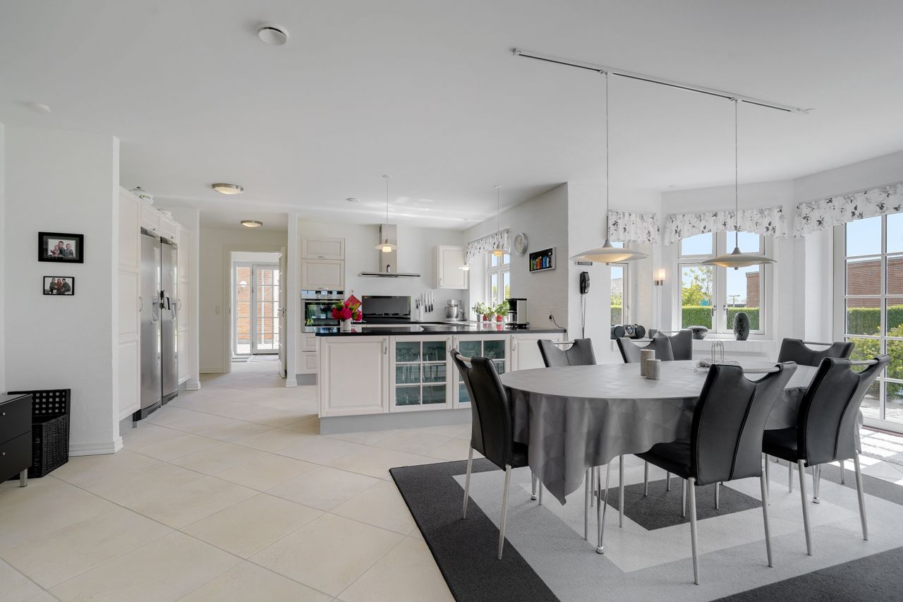 Man kommer ind i en dejlig stor hall, hvor der er adgang til husets store køkken/alrum, som er hjertet i huset. Stor dejlig opholdsstue med trægulv og adgang til haven. Gode værelser. Dejligt rummeligt badeværelse. 1. salen indeholder lyst stue, tekøkken. Stort soveværelse med waæl in skab. Dejlig badeværelse. Værelse/kontor med udgang til altan, herfra flot udsigt over marker, enge mv.
