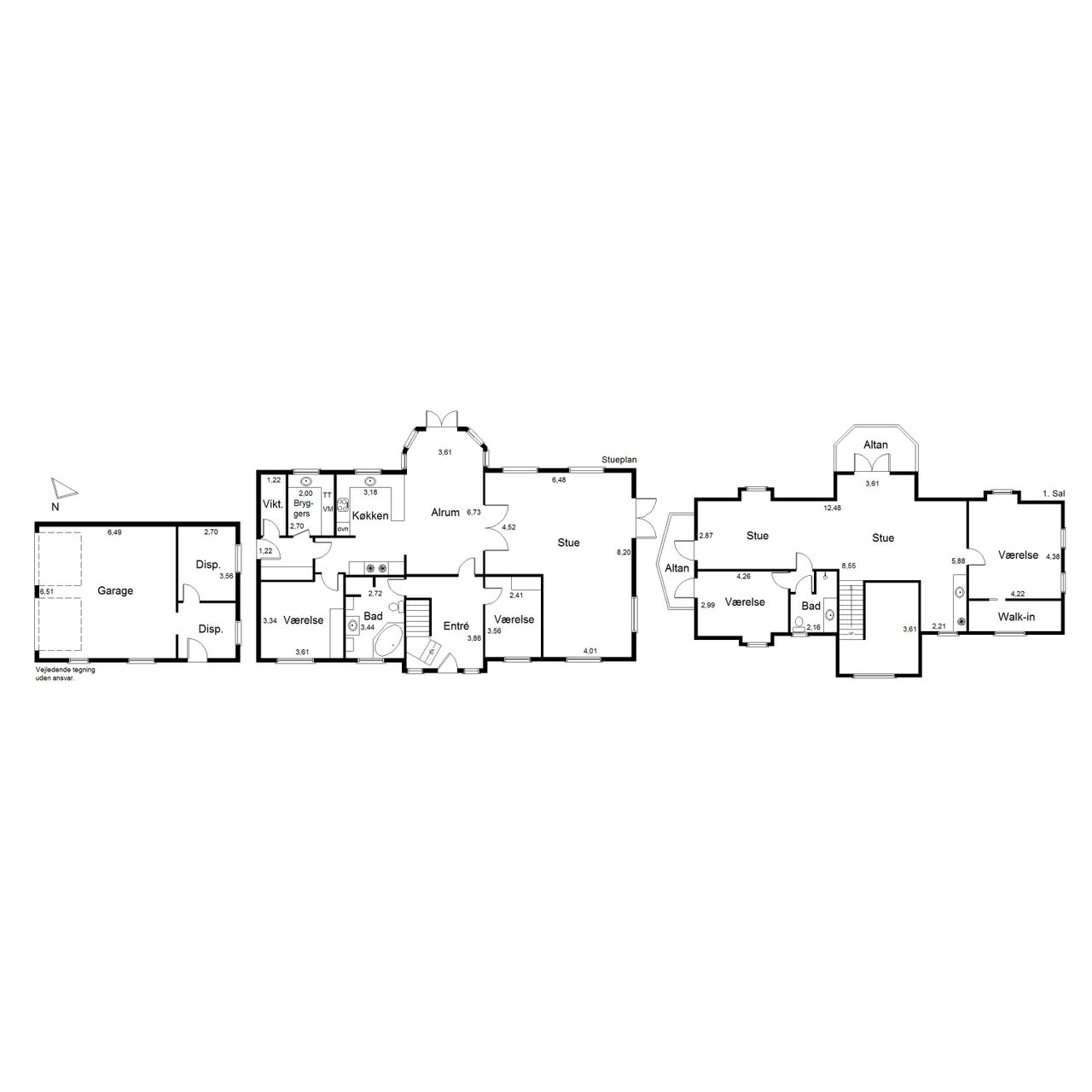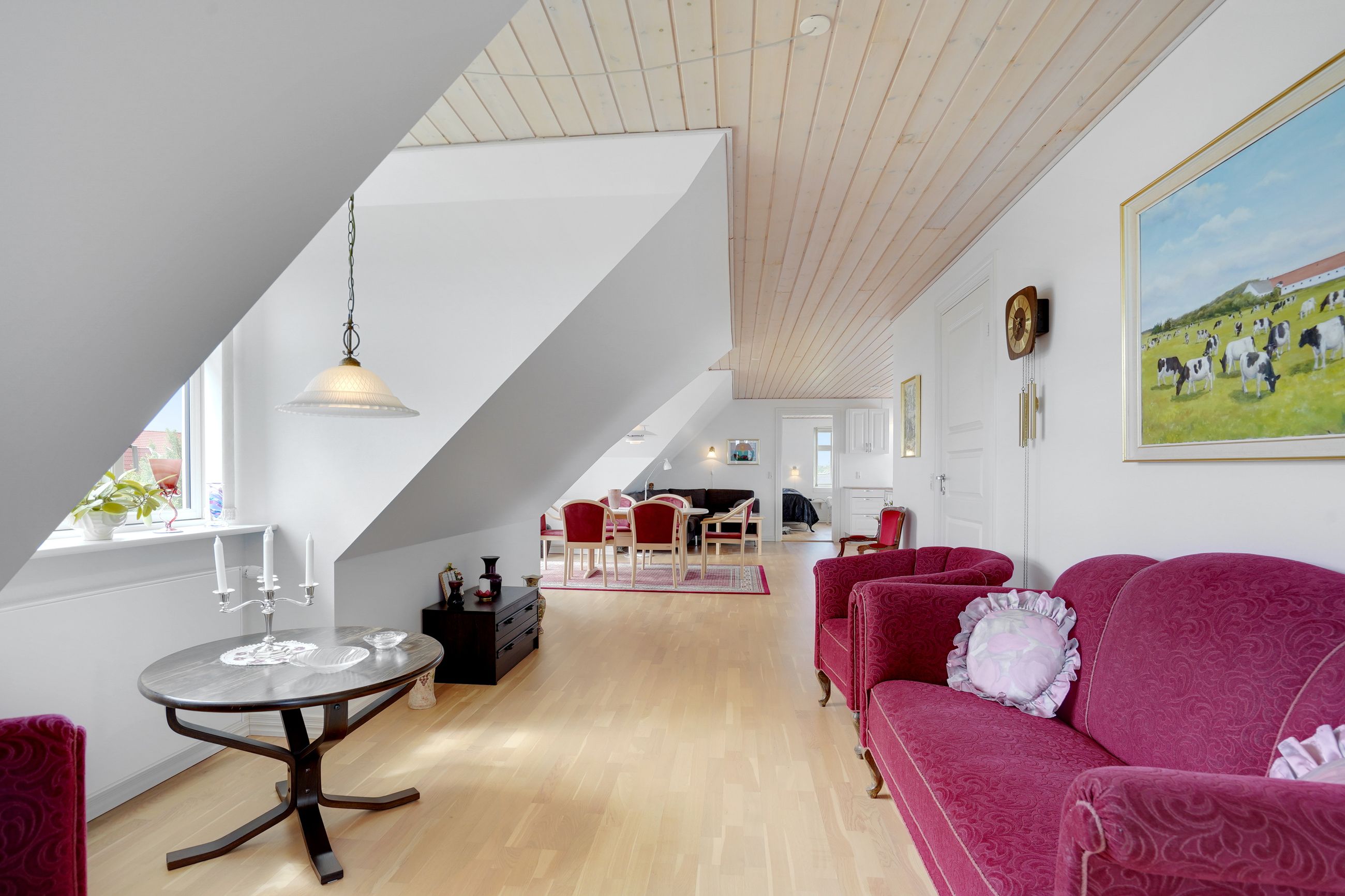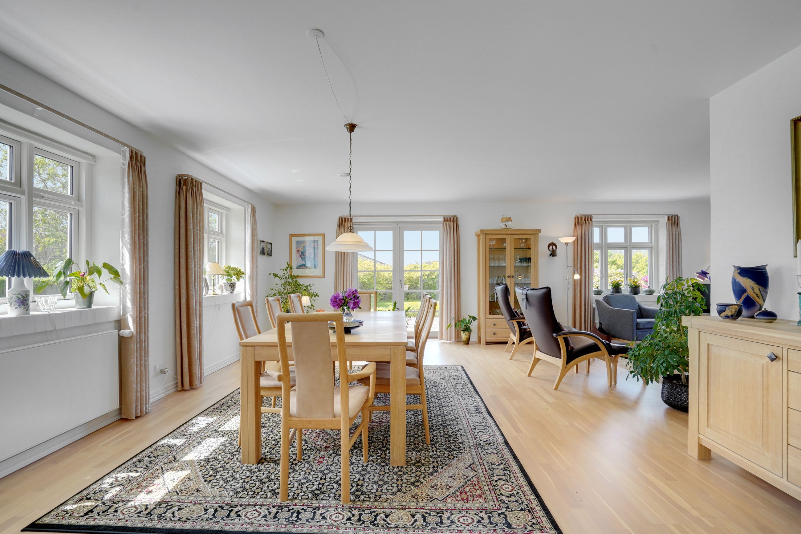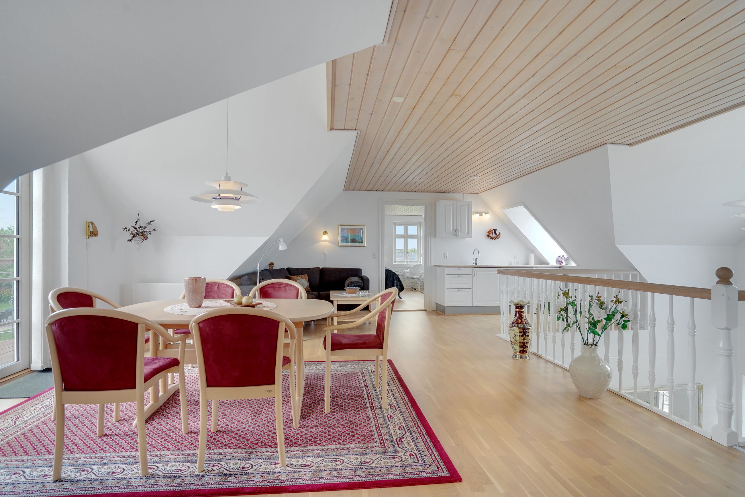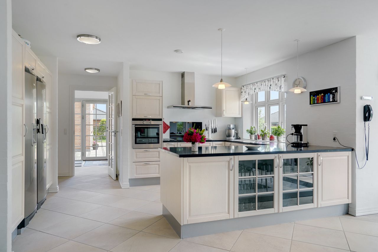 Man kommer ind i en dejlig stor hall, hvor der er adgang til husets store køkken/alrum, som er hjertet i huset. Stor dejlig opholdsstue med trægulv og adgang til haven. Gode værelser. Dejligt rummeligt badeværelse. 1. salen indeholder lyst stue, tekøkken. Stort soveværelse med waæl in skab. Dejlig badeværelse. Værelse/kontor med udgang til altan, herfra flot udsigt over marker, enge mv.