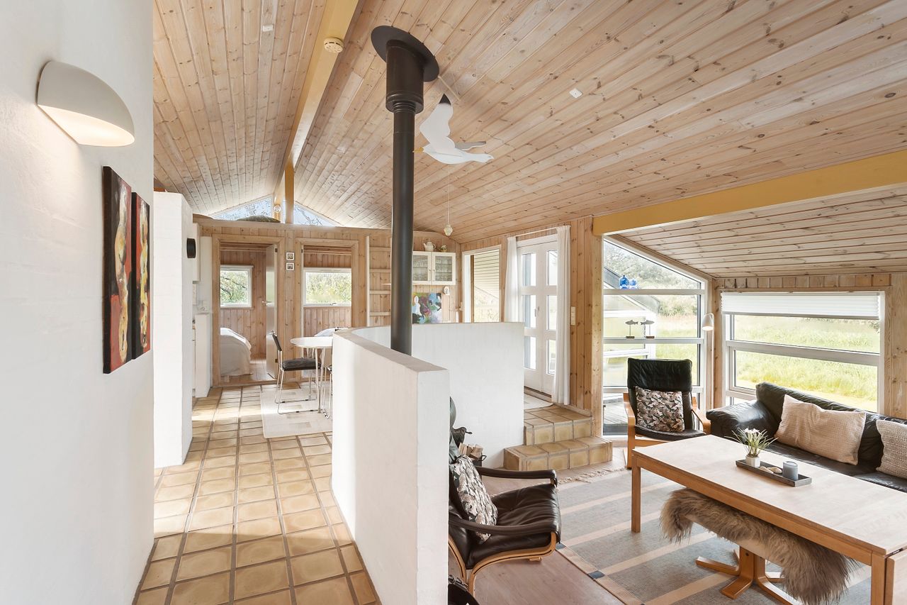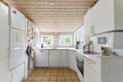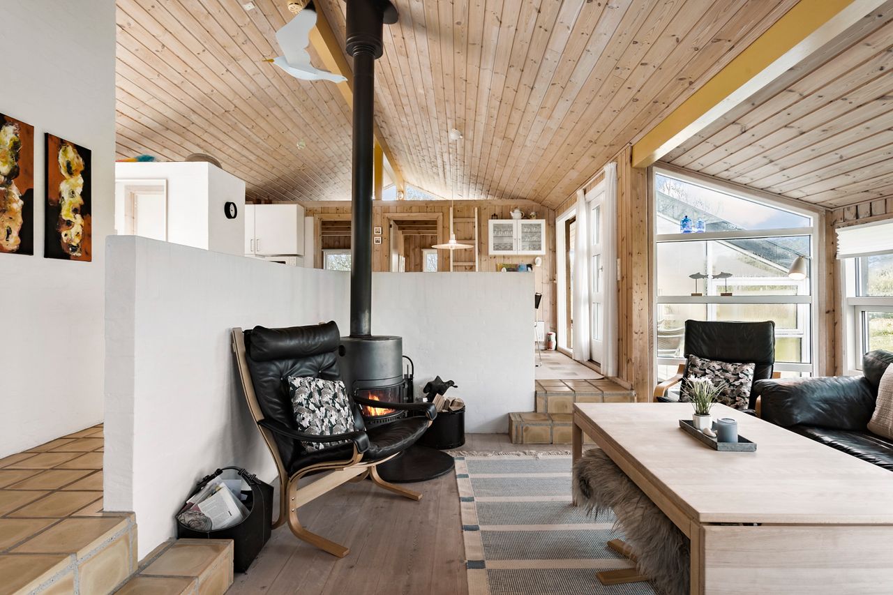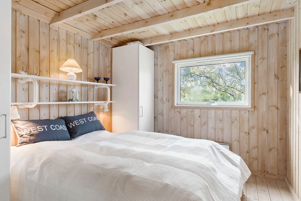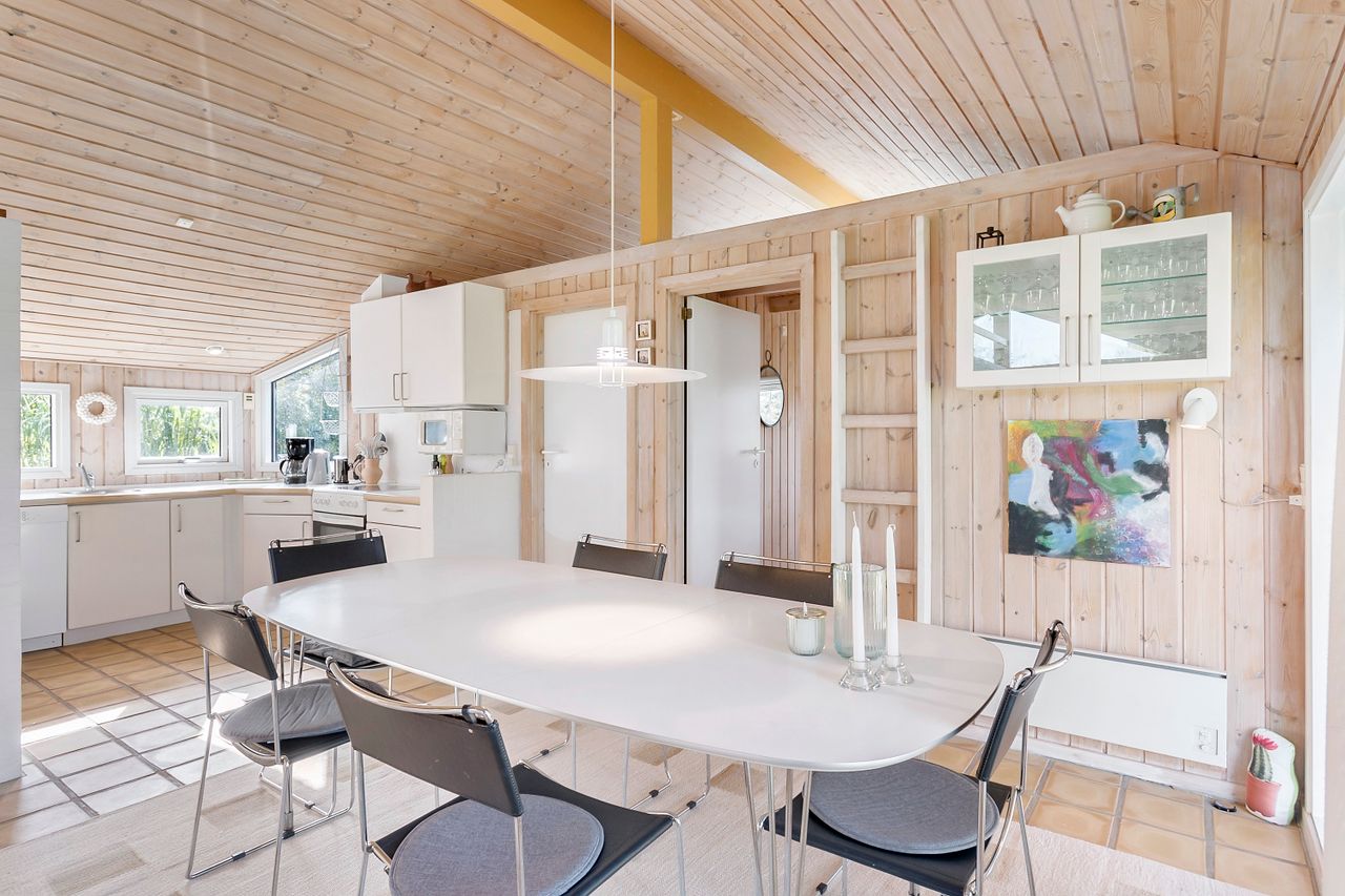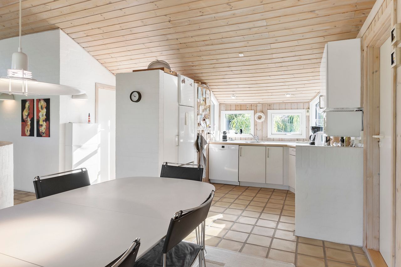 Indenfor mødes du af store vinduespartier, der skaber en lys og indbydende atmosfære i det rummelige køkken-alrum, som er i åben forbindelse med den store stue. Her er der plads til både afslapning og hyggelige middage med familie og venner. Huset byder også på viktualierum med ekstra opbevaring og køleskab. Sommerhuset har tre gode værelser, alle med indbygget skabsplads, og et lyst køkken, der er funktionelt og veludstyret.