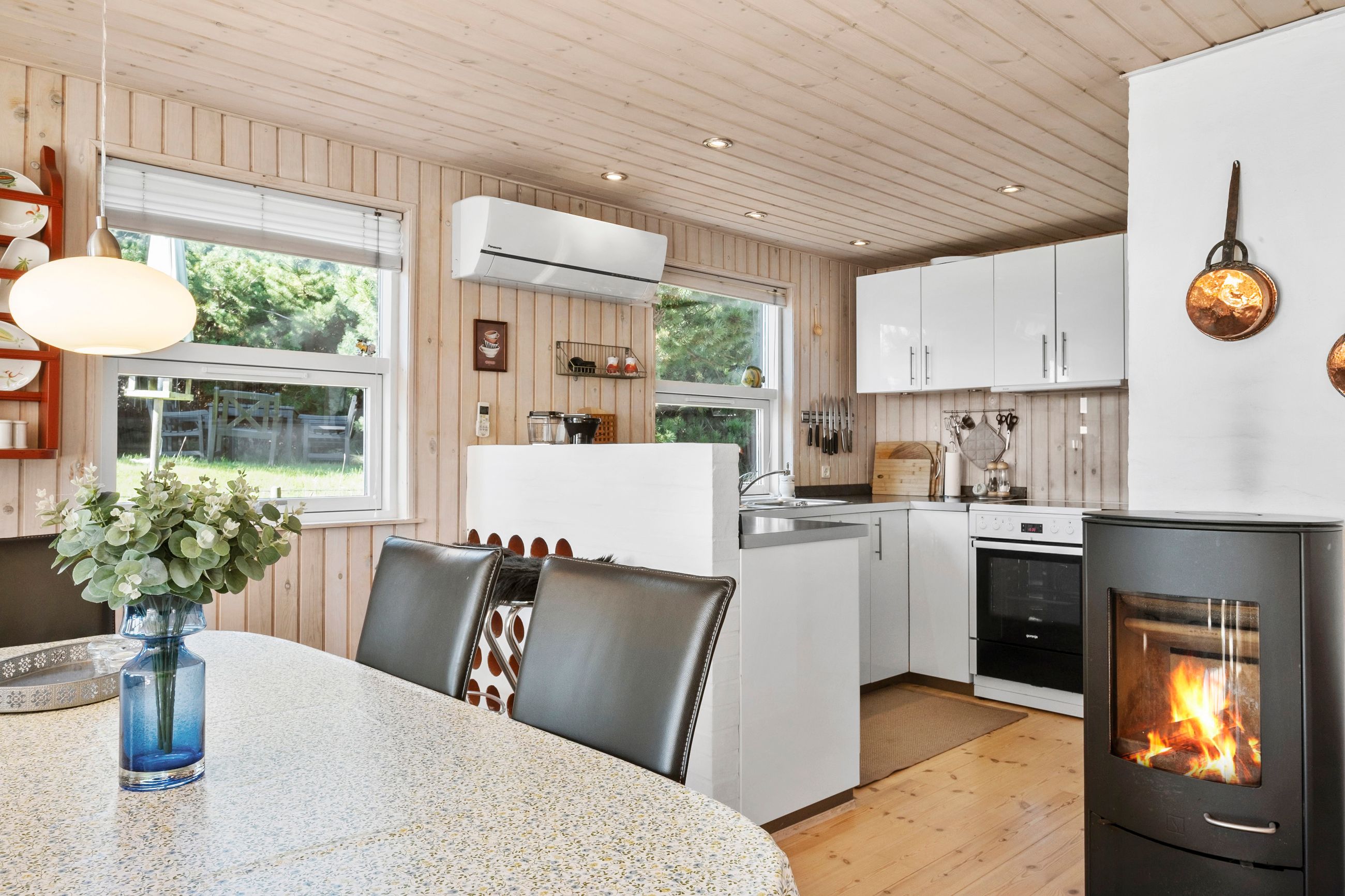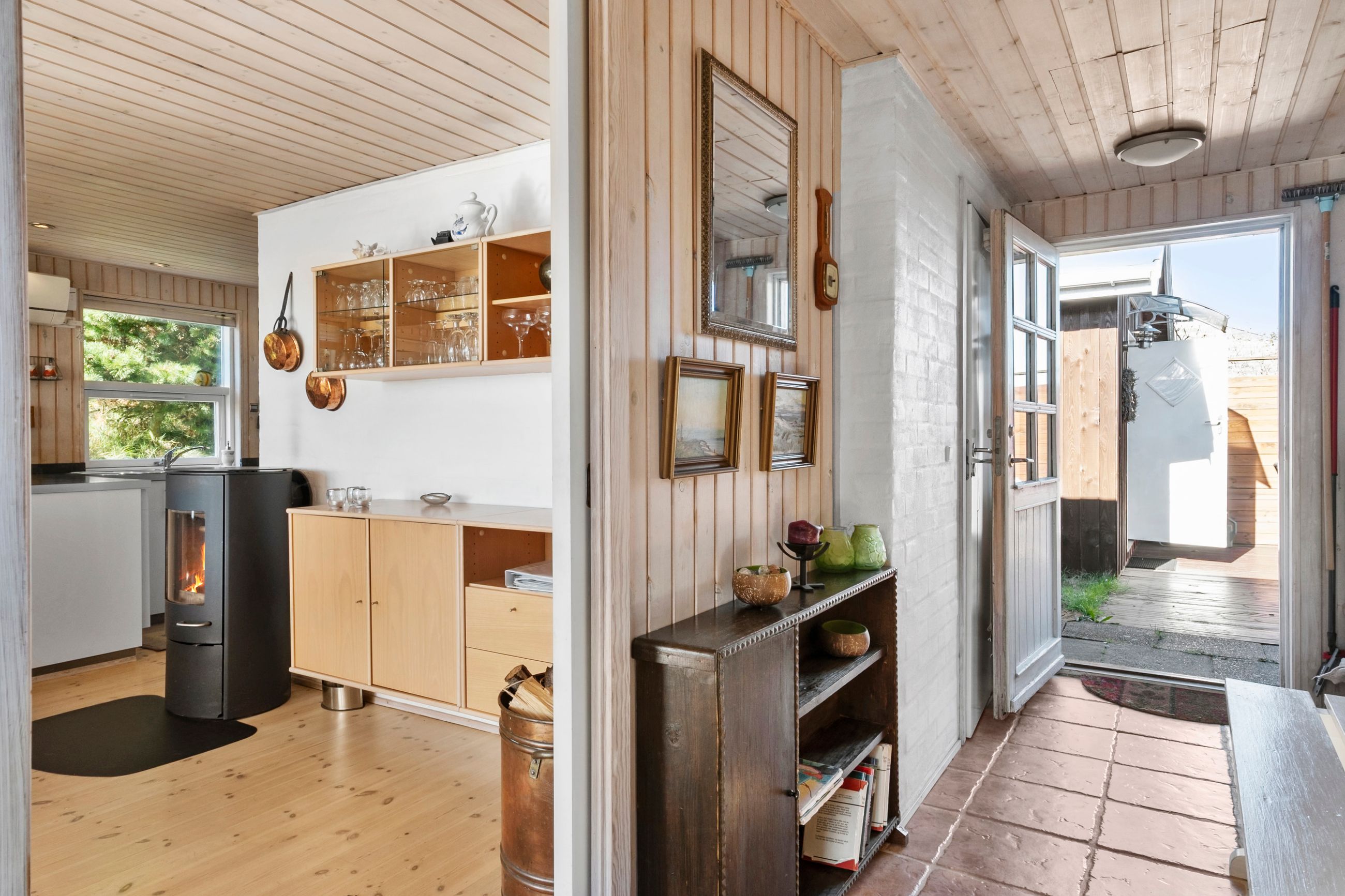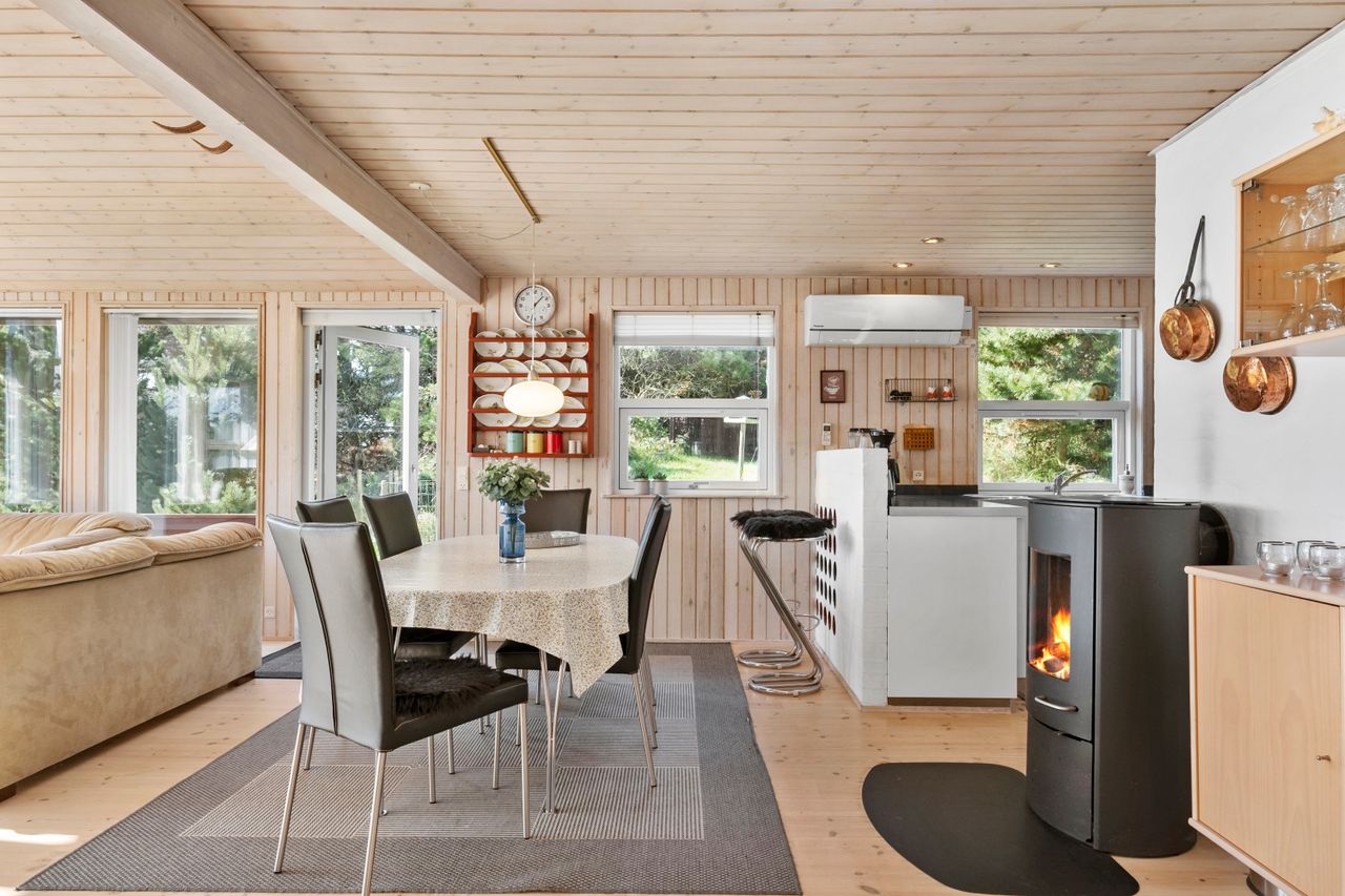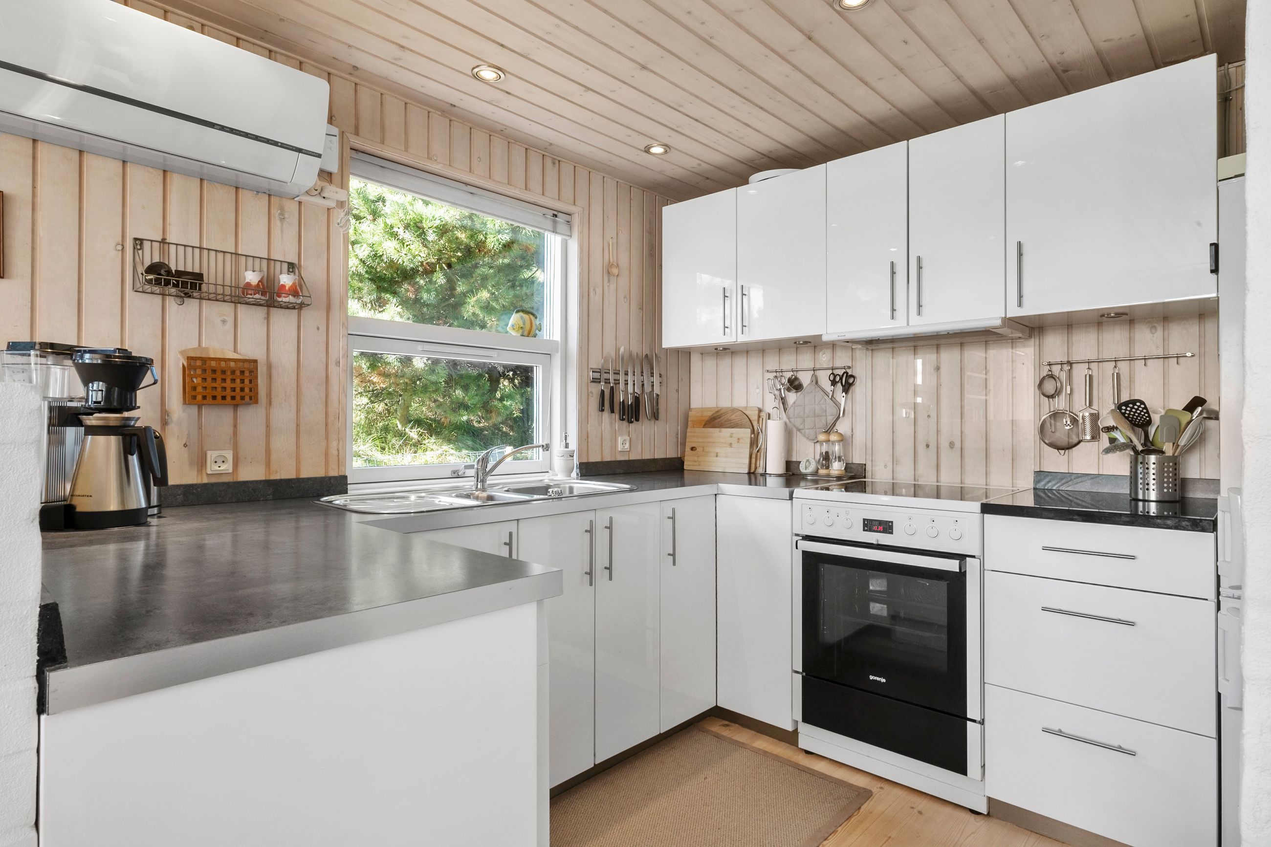 Indenfor mødes du af store vinduespartier, herfra er der udsigt til hele sommerhus området, der skaber en lys og indbydende atmosfære i det rummelige køkken-alrum, som er i åben forbindelse med den store stue. Her er der plads til både afslapning og hyggelige middage med familie og venner. Sommerhuset har to gode værelser. Dejligt badeværelse