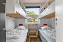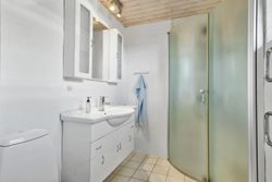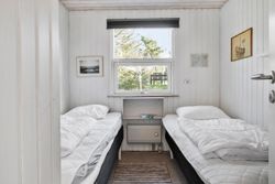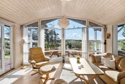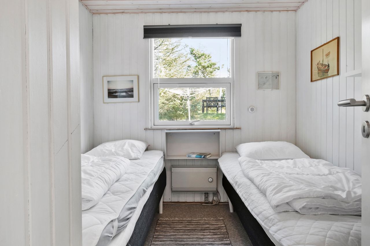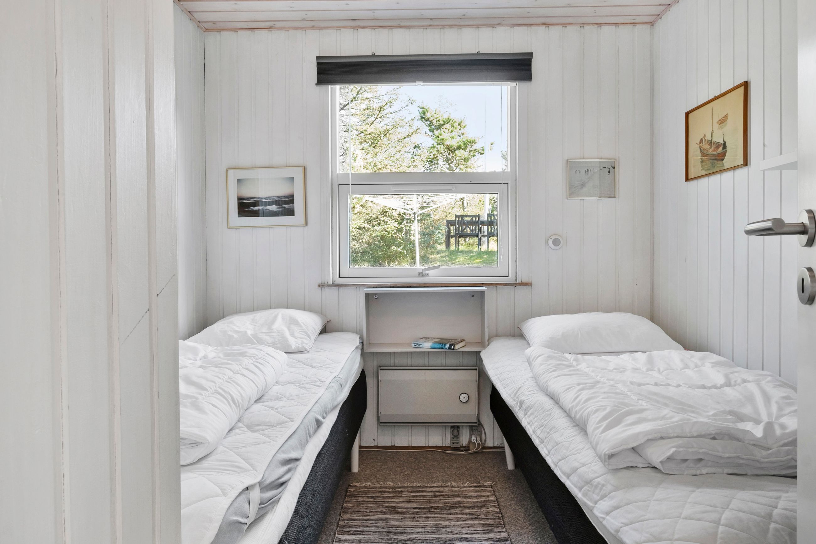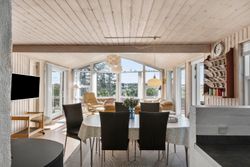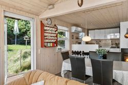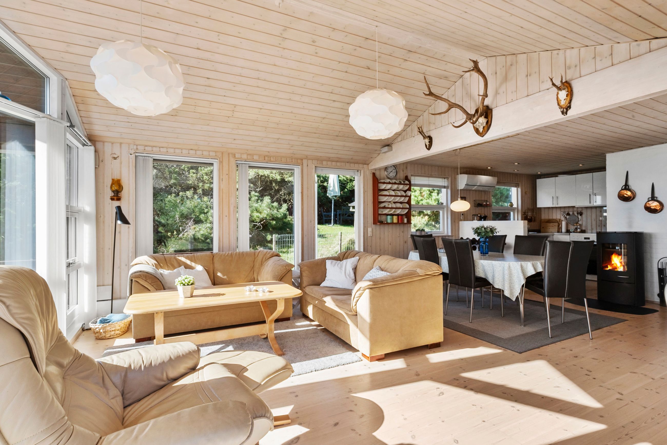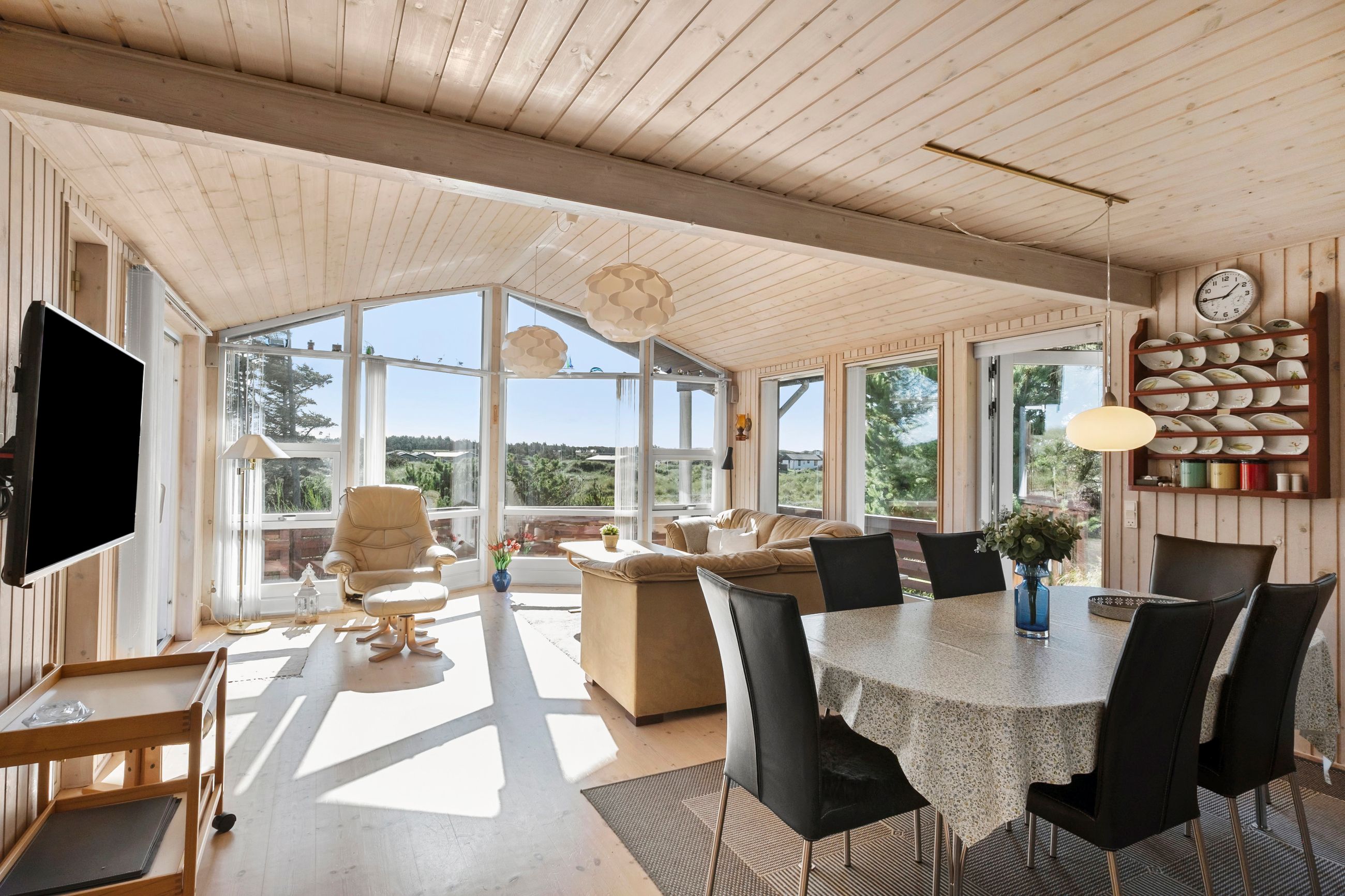 Indenfor mødes du af store vinduespartier, herfra er der udsigt til hele sommerhus området, der skaber en lys og indbydende atmosfære i det rummelige køkken-alrum, som er i åben forbindelse med den store stue. Her er der plads til både afslapning og hyggelige middage med familie og venner. Sommerhuset har to gode værelser. Dejligt badeværelse