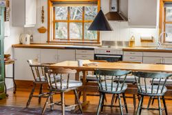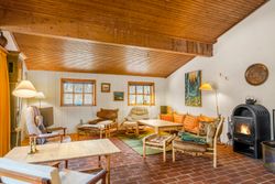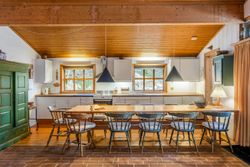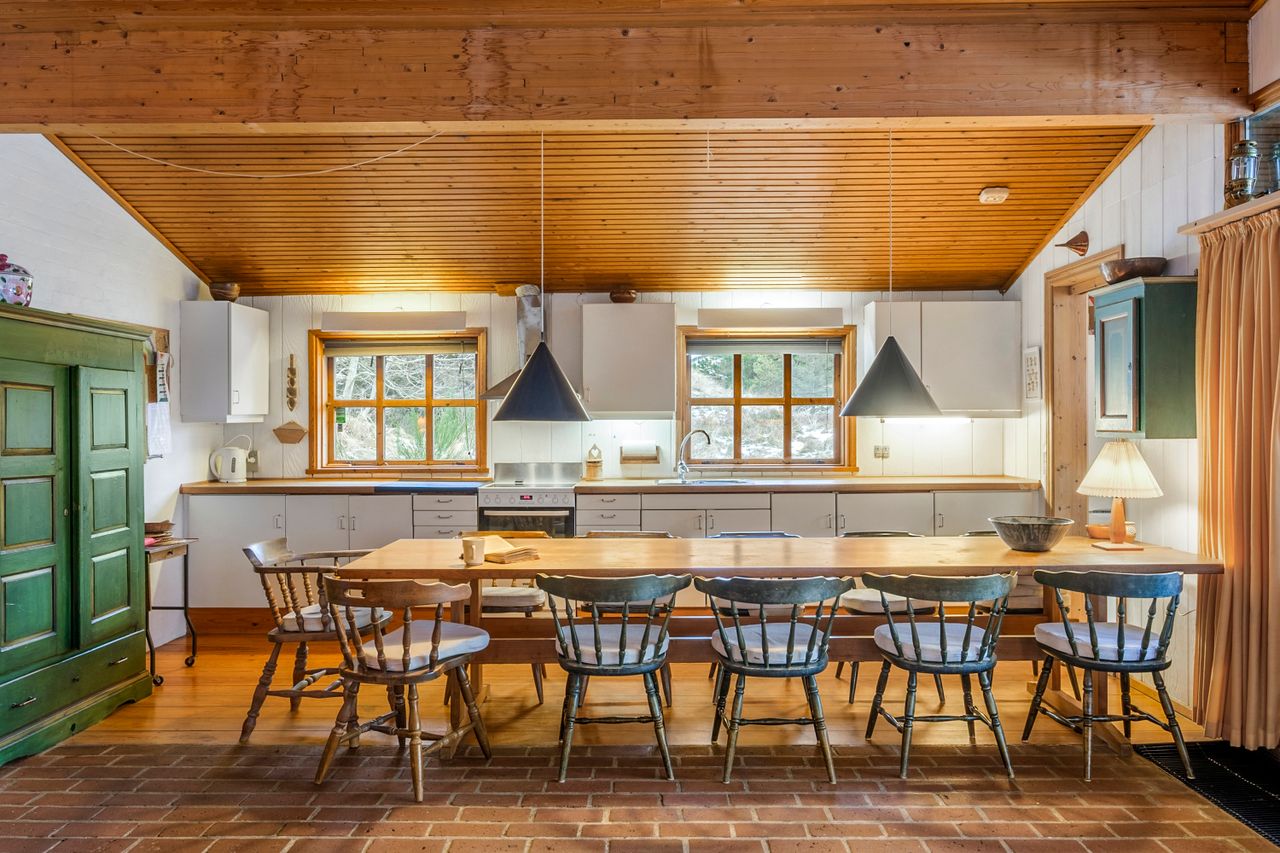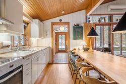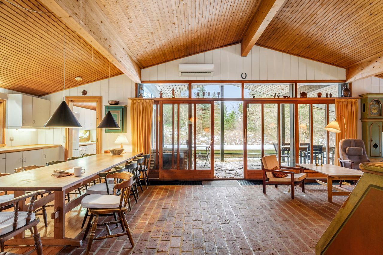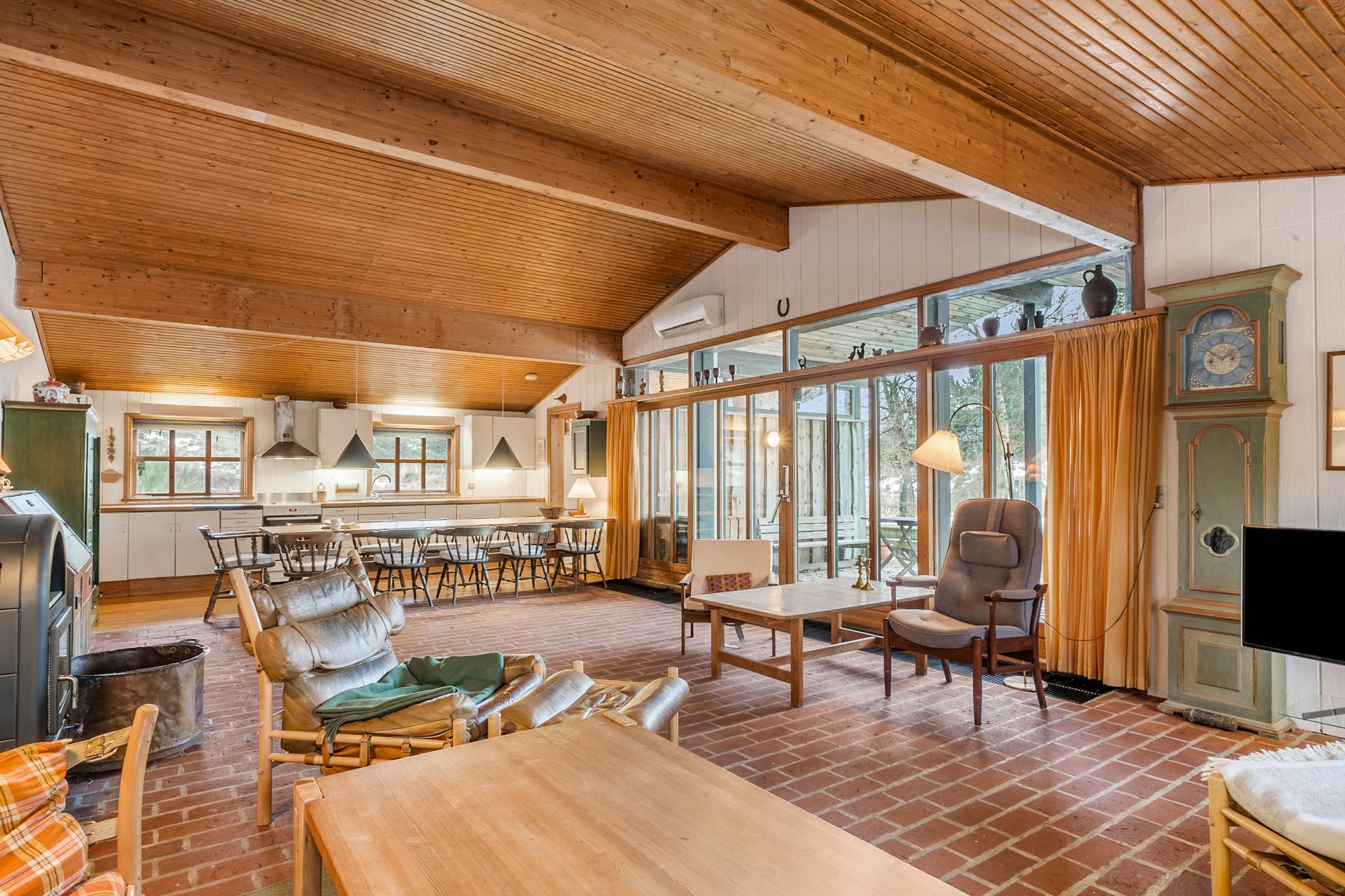 Sommerhuset byder velkommen i et lyst og rummeligt køkken-alrum i åben forbindelse med stuen, hvor loft til kip skaber en fantastisk rummelighed og en indbydende atmosfære. De store vinduespartier mod syd giver et skønt lysindfald og sikrer en naturlig sammenhæng mellem inde- og udeliv.