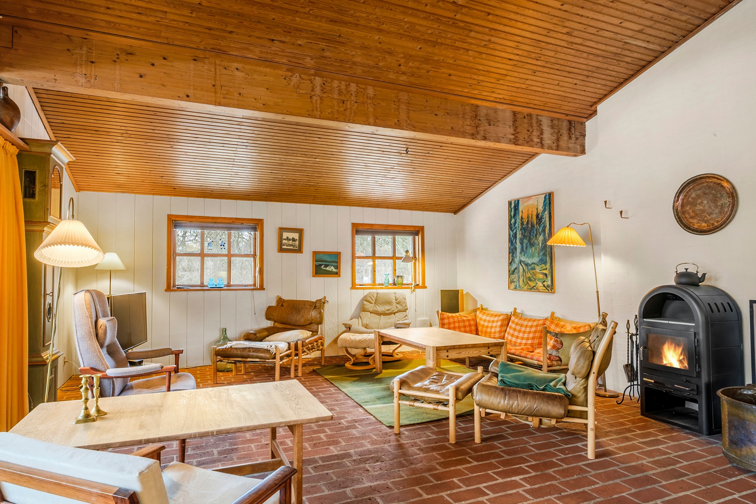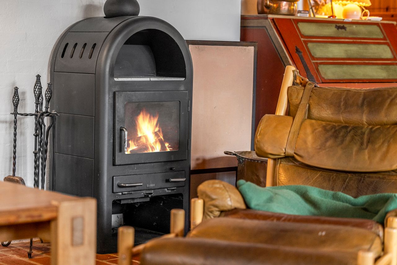 Hele huset opvarmes via varmepumpe, suppleret med brændeovn placeret i opholdsrummet – en god og fleksibel løsning året rundt.