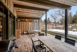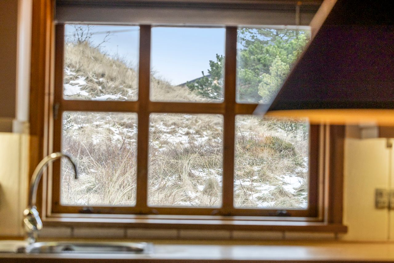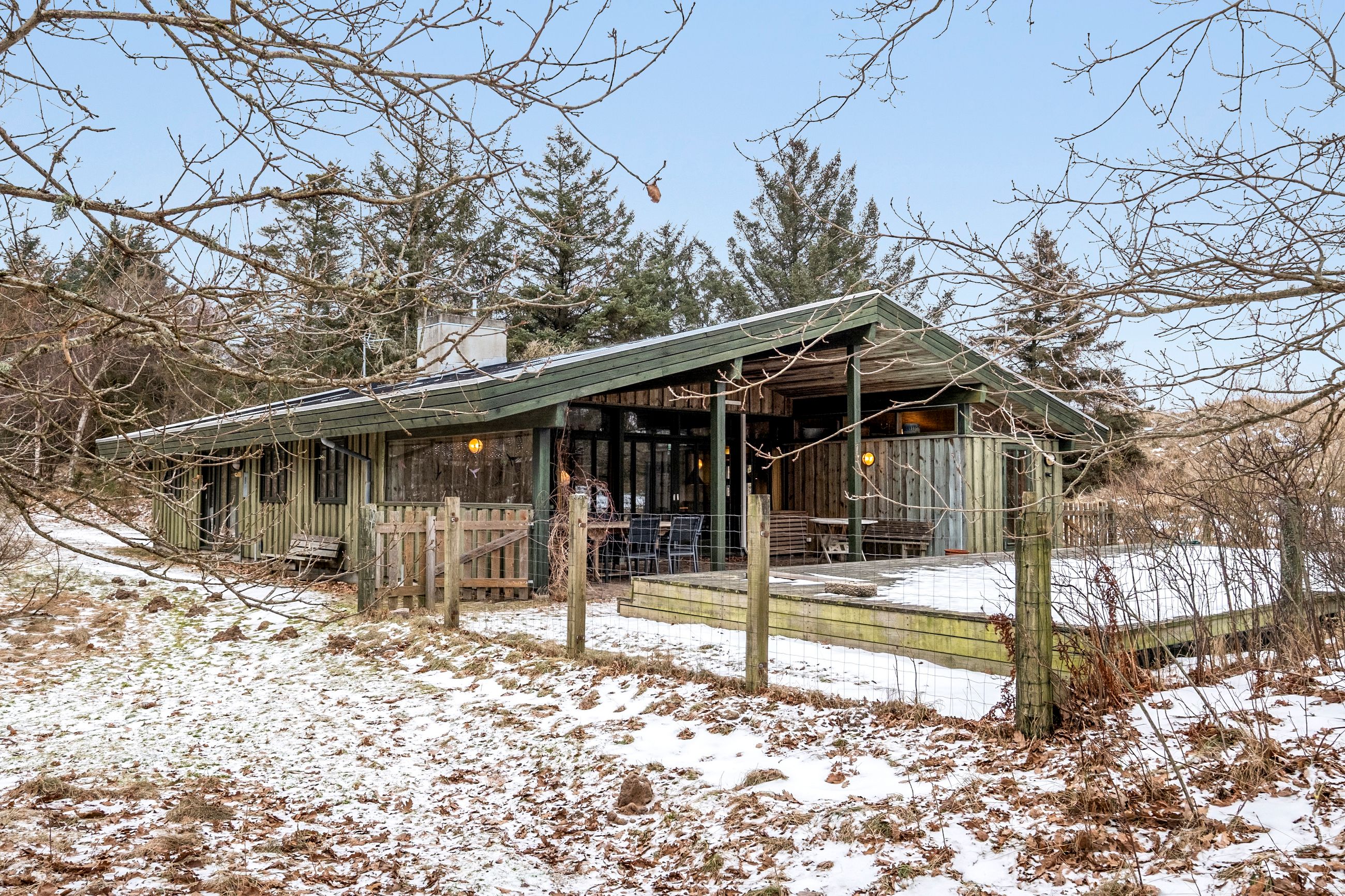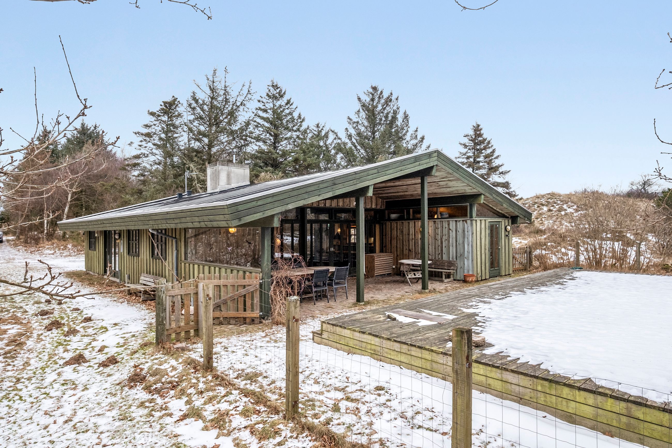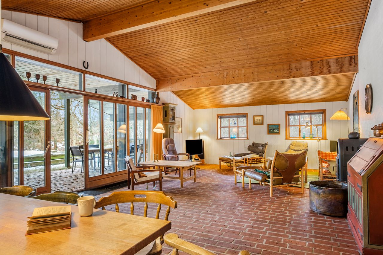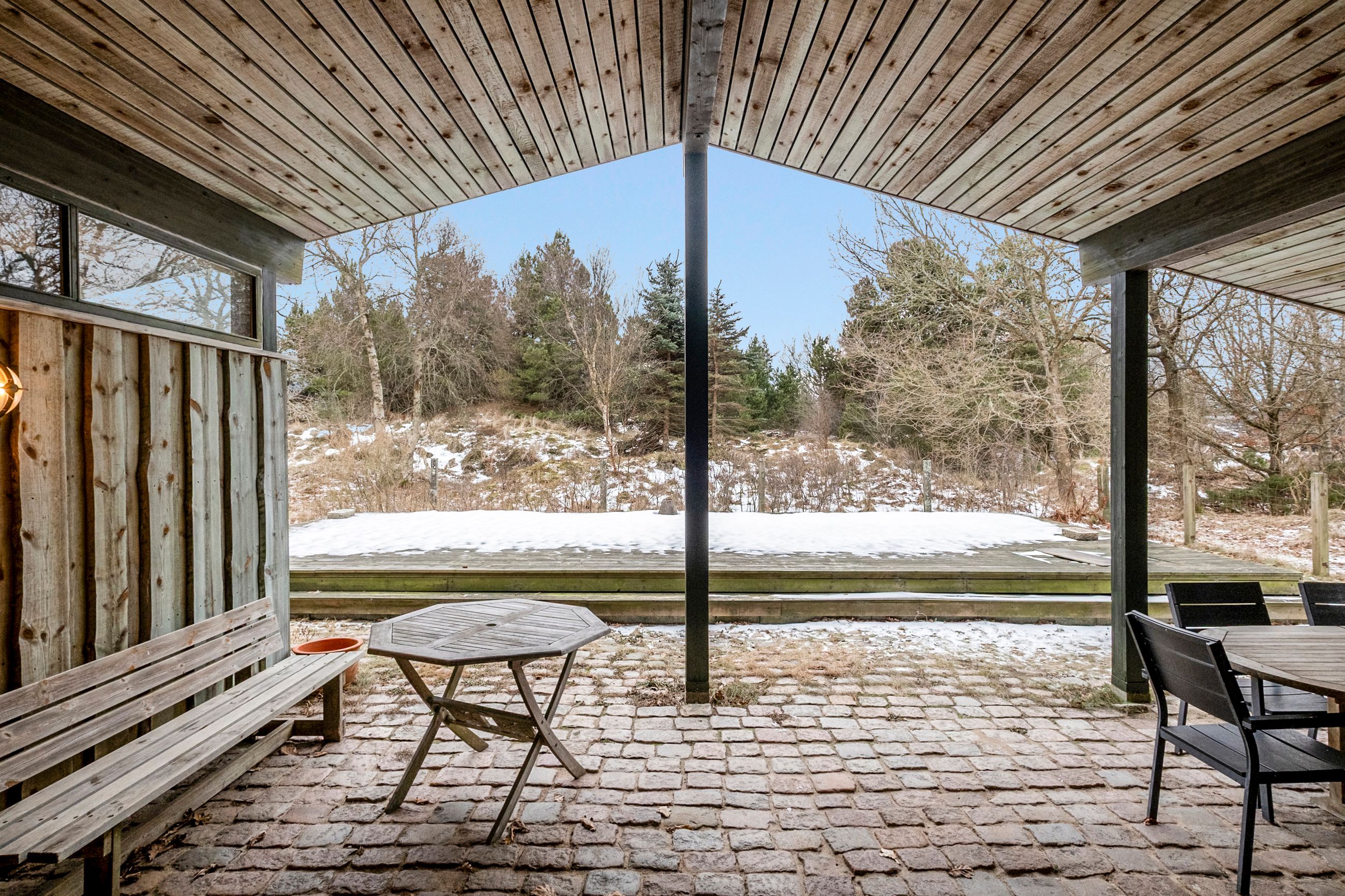 Fra opholdsrummet er der direkte udgang til en stor overdækket terrasse, hvor feriedagene kan nydes i læ og uanset vejret – perfekt til både morgenkaffe og lange sommeraftener.