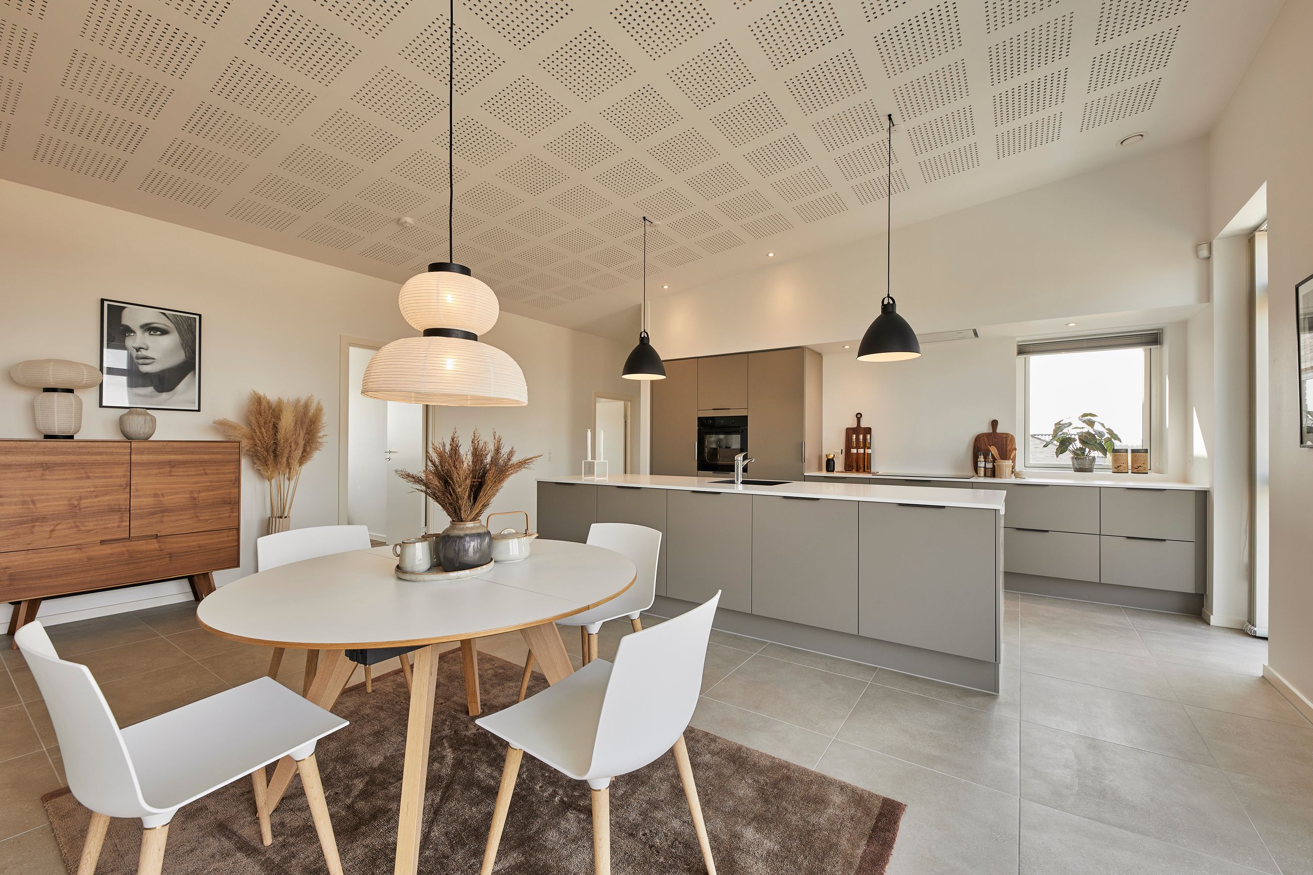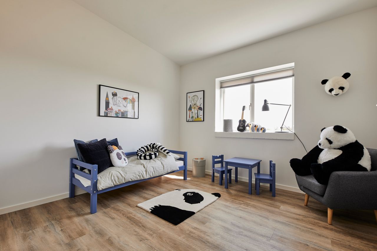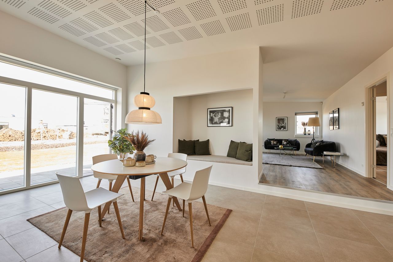 Overvejer du at bygge dit drømmehus i den attraktive udstykning, Gofthaven i Hjørring, så er det dette projektforslag fra Milton Huse måske noget for dig!? Flot og funktionelt forskudt vinkelhus på 170 m2 med ensidig taghælding, opført med tagpap uden listedækning på hele huset. Der er arkitekttagrender, nedløb og inddækning i sort alu og vinduerne er Rationel Aura Plus, 3-lags træ/alu lavenergi, sorte udvendigt og hvide indvendigt. Huset har desuden en 50 m2 stor integreret dobbelt carport med opmuret søjle samt redskabsrum, hvor gulvet er støbt og isoleret. Kom tørskoet fra carporten ind i husets entré med videre adgang til bryggers, 2 værelser og tilhørende badeværelse. Fra entréen er der adgang til det rummelige køkken/alrum, der er husets naturlige samlingsplads til hyggestunder og fælles madlavning. De skrå lofter med akustikfeler giver en dejlig stor rumfornemmelse og den indbyggede alkove indbyder til hygge og lektielæsning. Her er også direkte forbindelse til soveværelset med tilhørende dejligt badeværelse og walk-in. I stuen er der et flot lysindfald fra flere vinkler og udgang til terrassen. Gulve i entré, bryggers og begge badeværelser, herunder vægge i de store brusenicher, er med store flotte 60 x 60 cm fliser. I alle andre rum er der flotte akustikgulve i lyst design. I hele huset er der flotte hvide gipslofter og i køkken/alrummet er der skrå lofter med akustikfelter, der sikrer en optimal akustik og et godt indeklima i det store centrale rum. Samtlige vægge er beklædt med glasfilt. Alt inventar er fra HTH. Huset er med varmegenvindingsanlæg, som sikrer et perfekt indeklima og lavt energiforbrug. Husets energiklasse er LE2018 og opvarmning er med jordvarme. Vil du vide mere kontakt RealMæglerne Hjørring på tlf. 72 119 114.