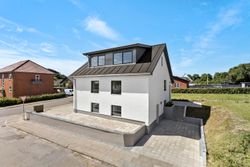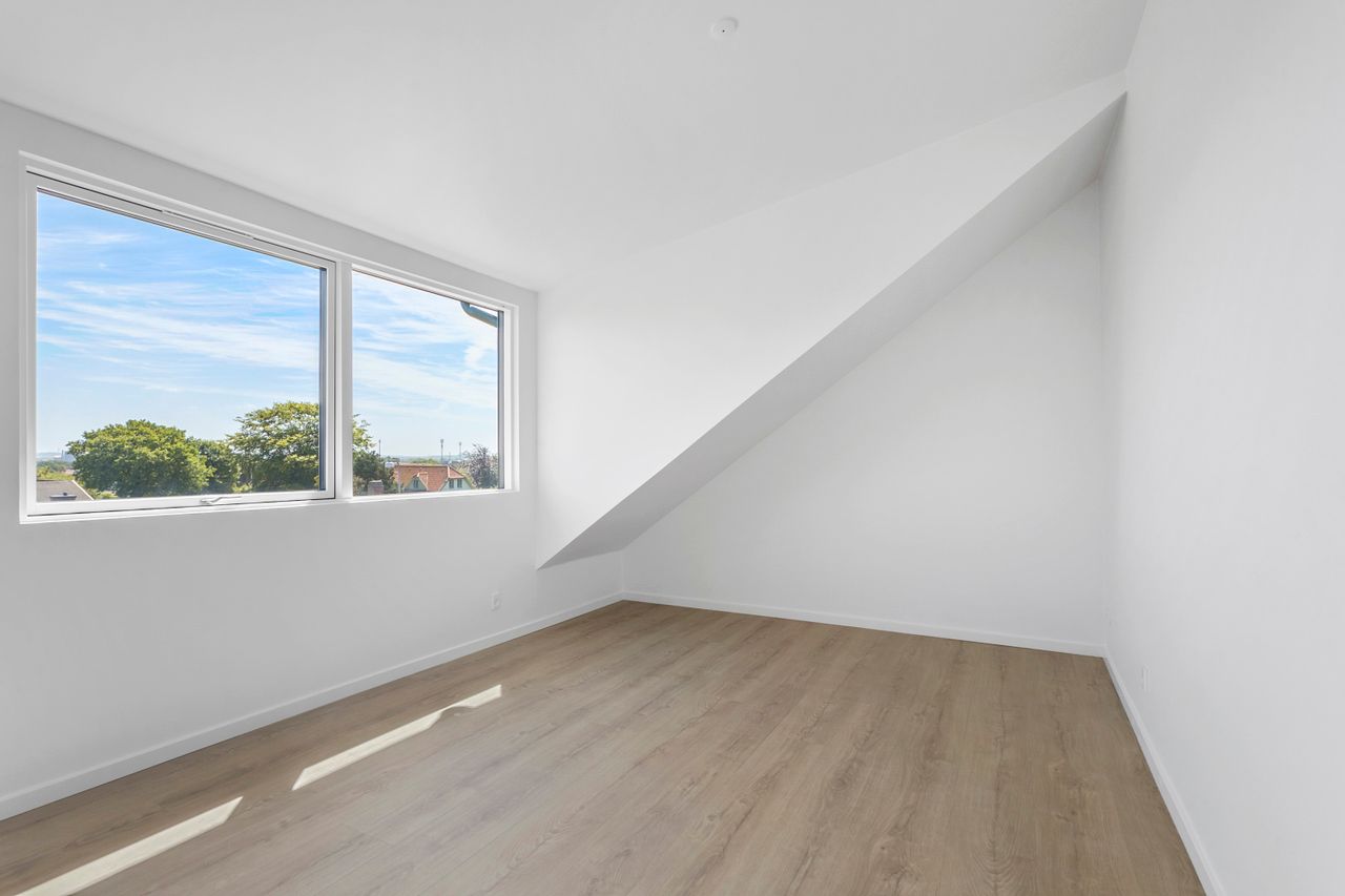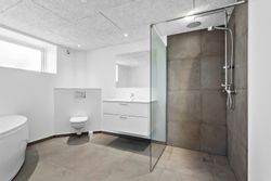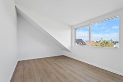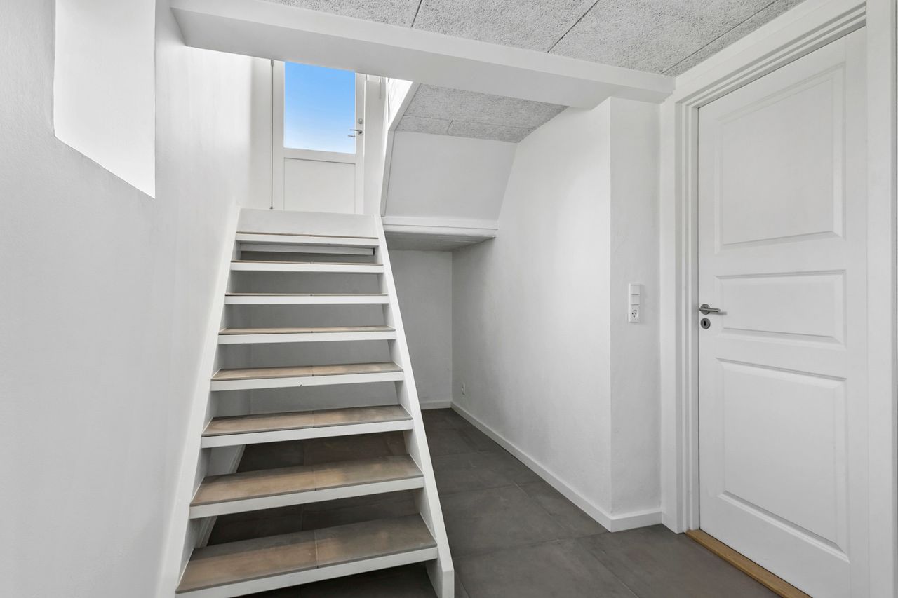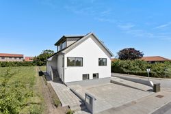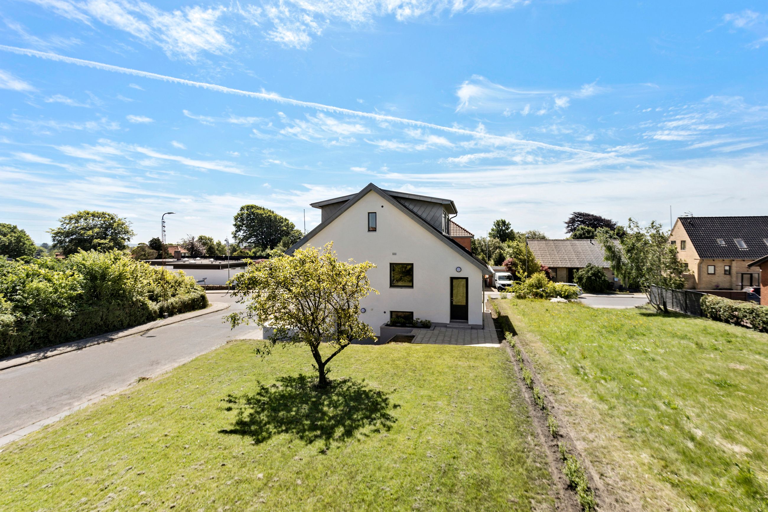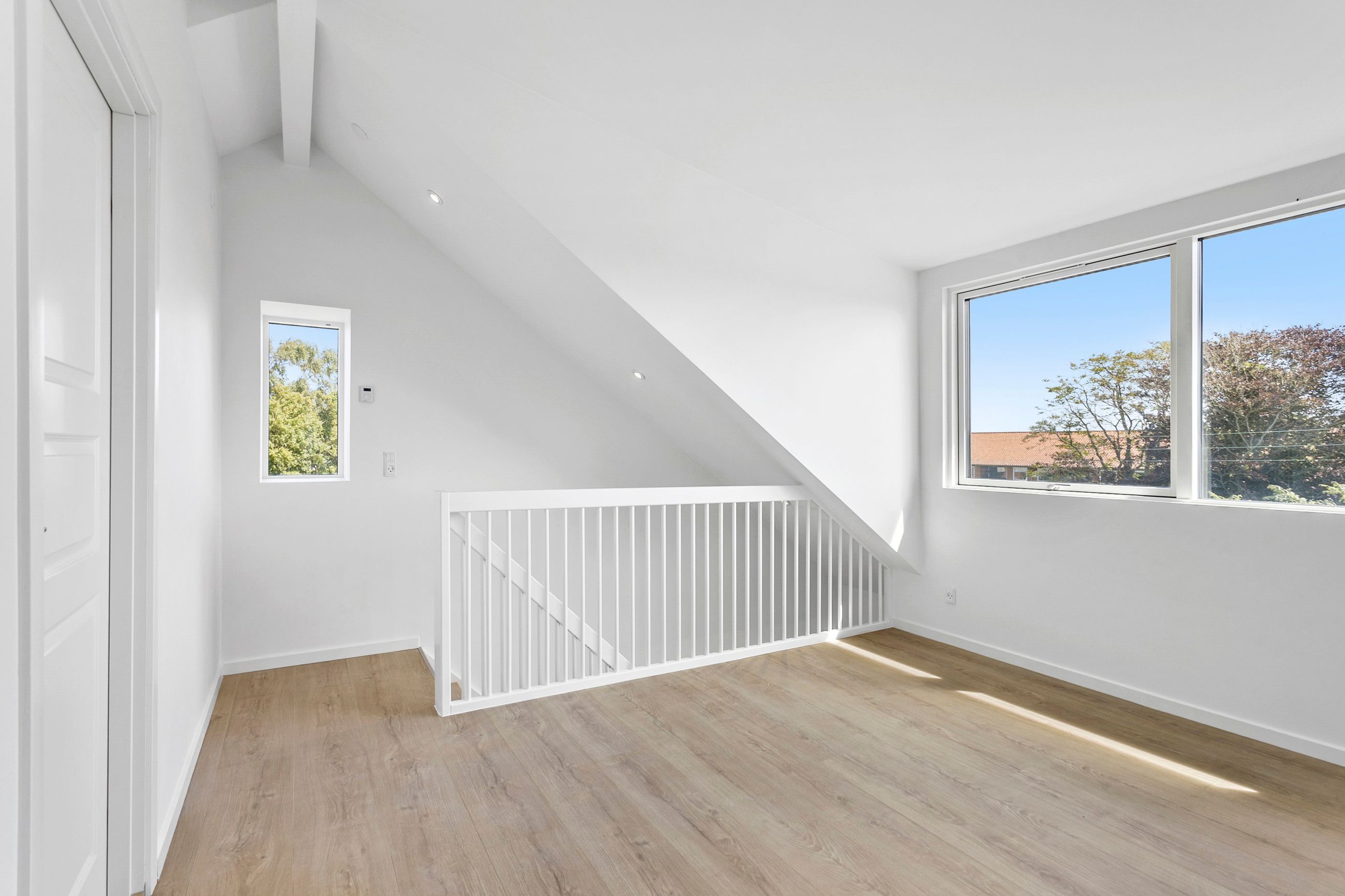 På husets overetage finder vi et stort repos, perfekt til hjemmekontor med udsigt mod øst så langt øjet rækker. Derudover er der to store værelser og et badeværelse med bruseniche. Taget er lavet med listedækning og tagpap fra 2016, hvilket fuldender villaens moderne udtryk.