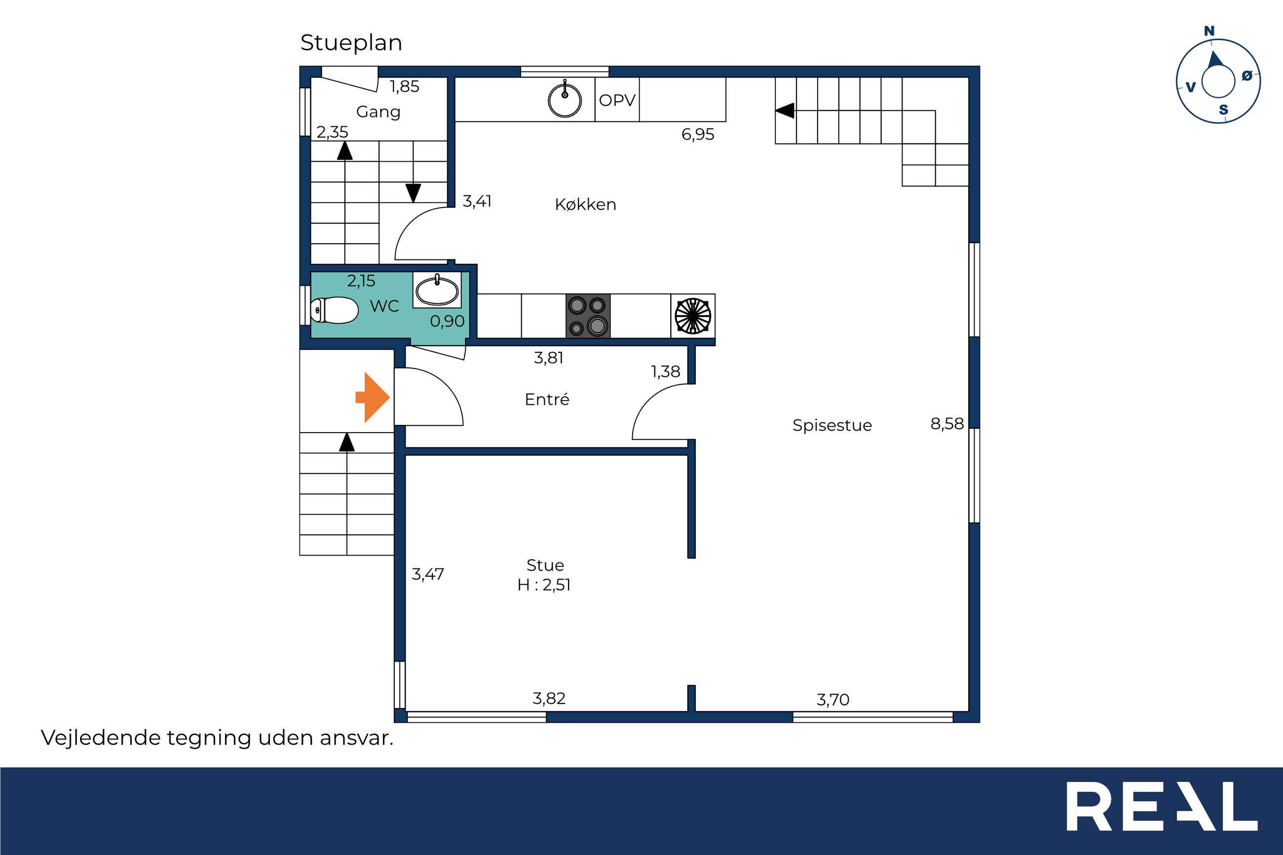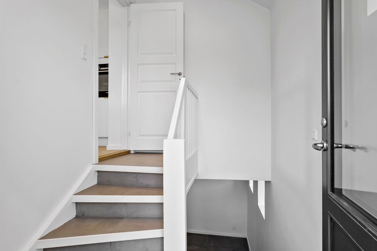 Fra kælderen er der en lille repos med udgang til haven. Stueetagen indeholder et rummeligt køkken i åben forbindelse med spisestuen, en tv-stue og et gæstetoilet.