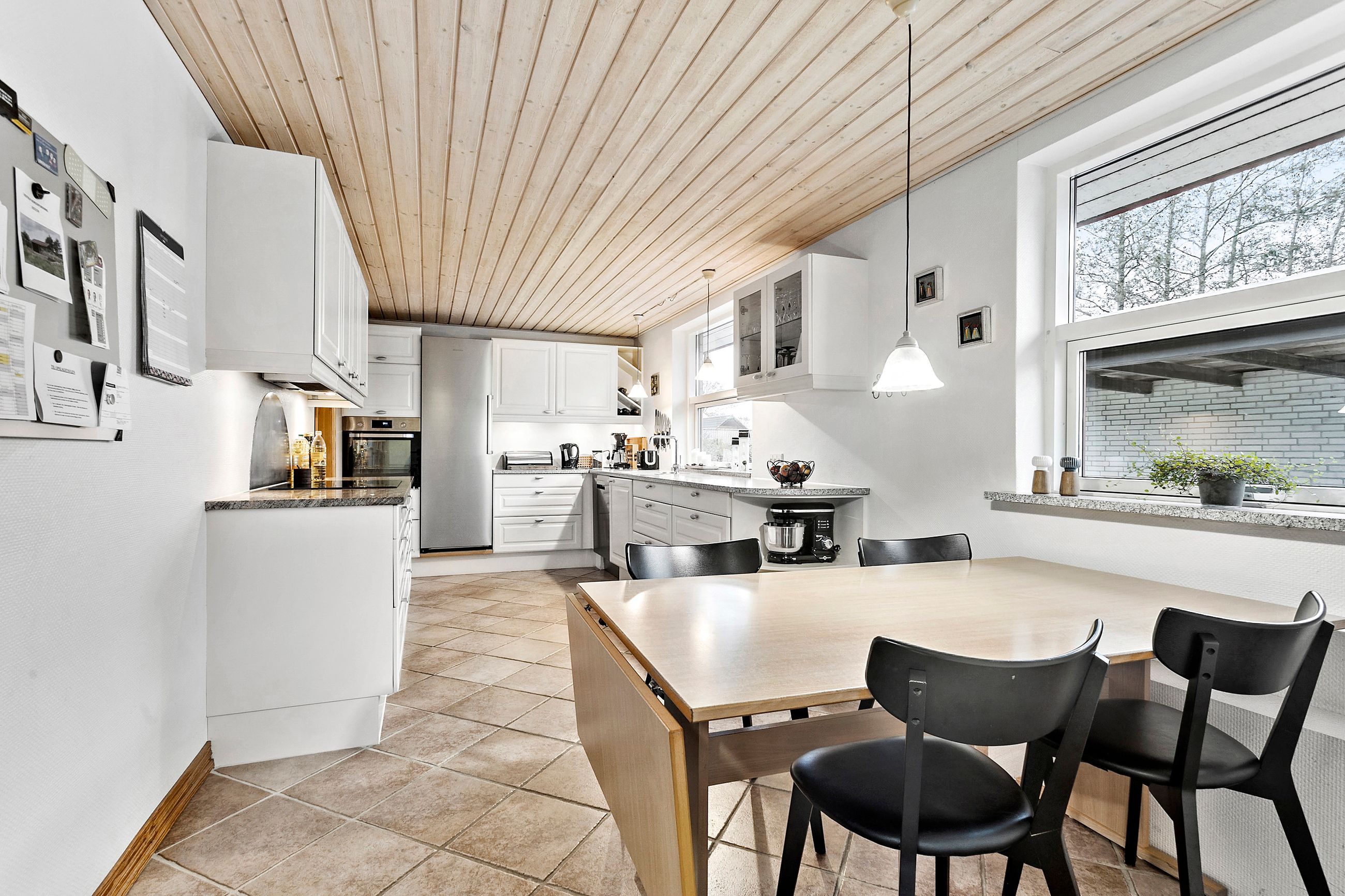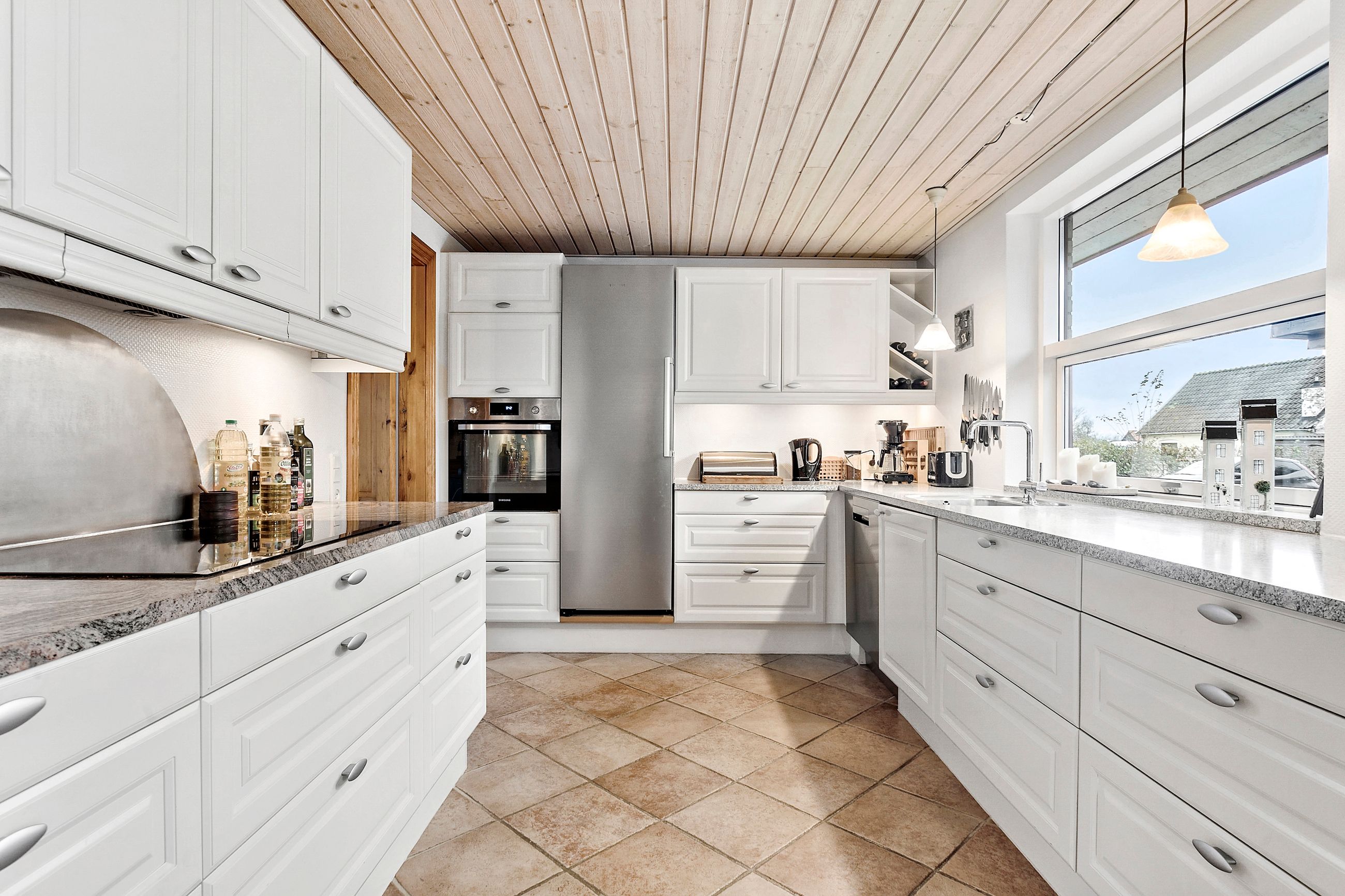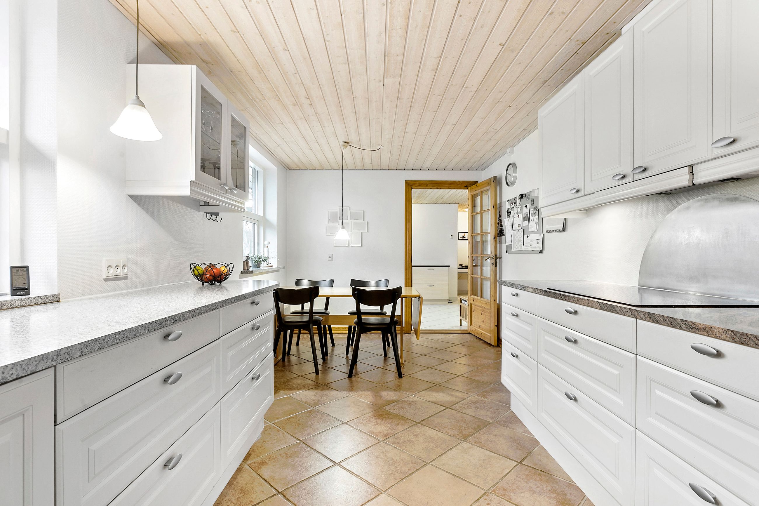 en baggang som idag bruges til opbevaringsrum, et lyst, lækkert og rummeligt køkken med en hyggelig