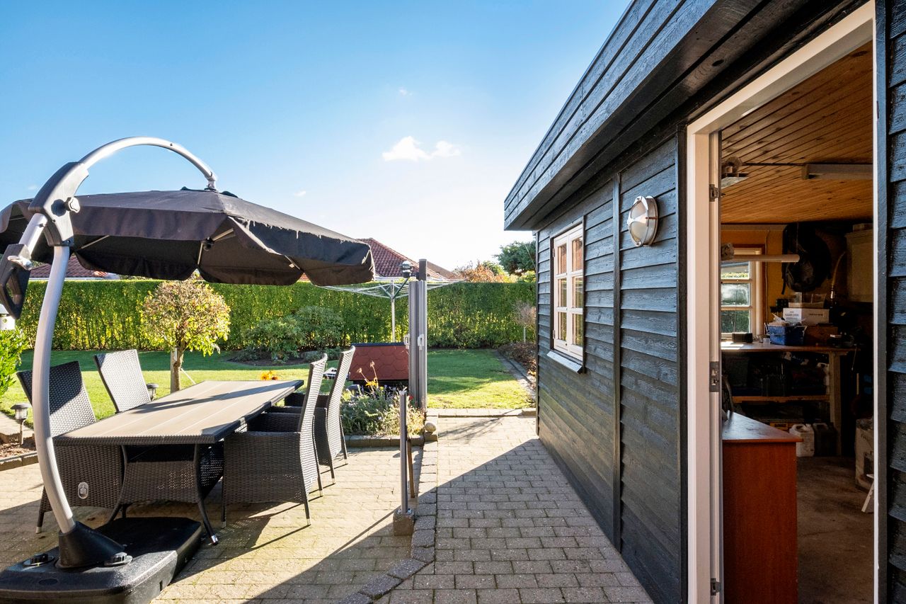 Udenfor venter en ugeneret og velanlagt have med pavillon – et perfekt uderum til afslapning og samvær i private omgivelser. Dertil kommer en rummelig carport samt et isoleret udhus, som i dag benyttes som værksted.