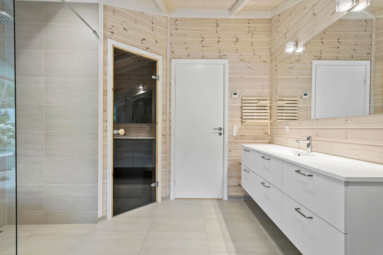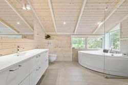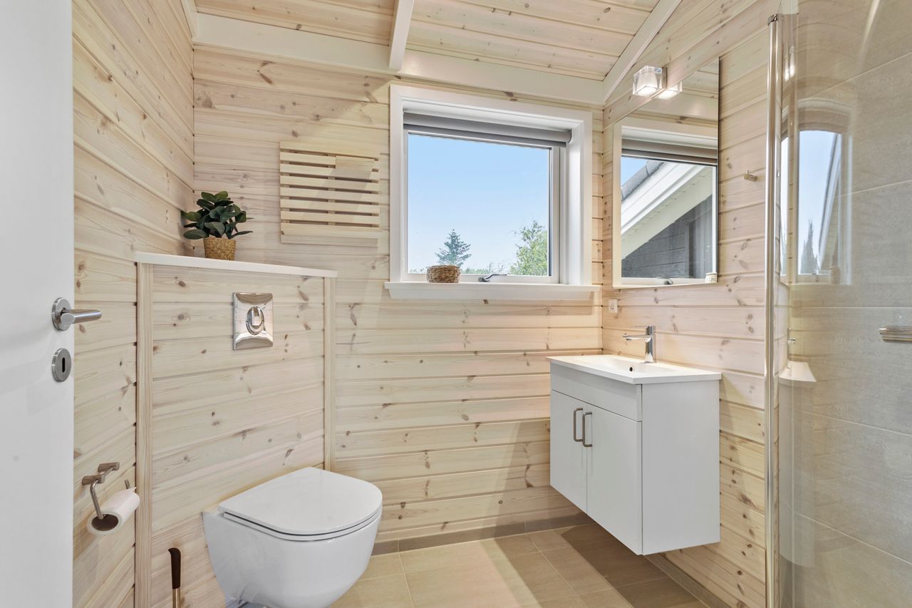 Sommerhuset har to badeværelser, hvoraf det ene er udstyret med spa og sauna, hvilket giver mulighed