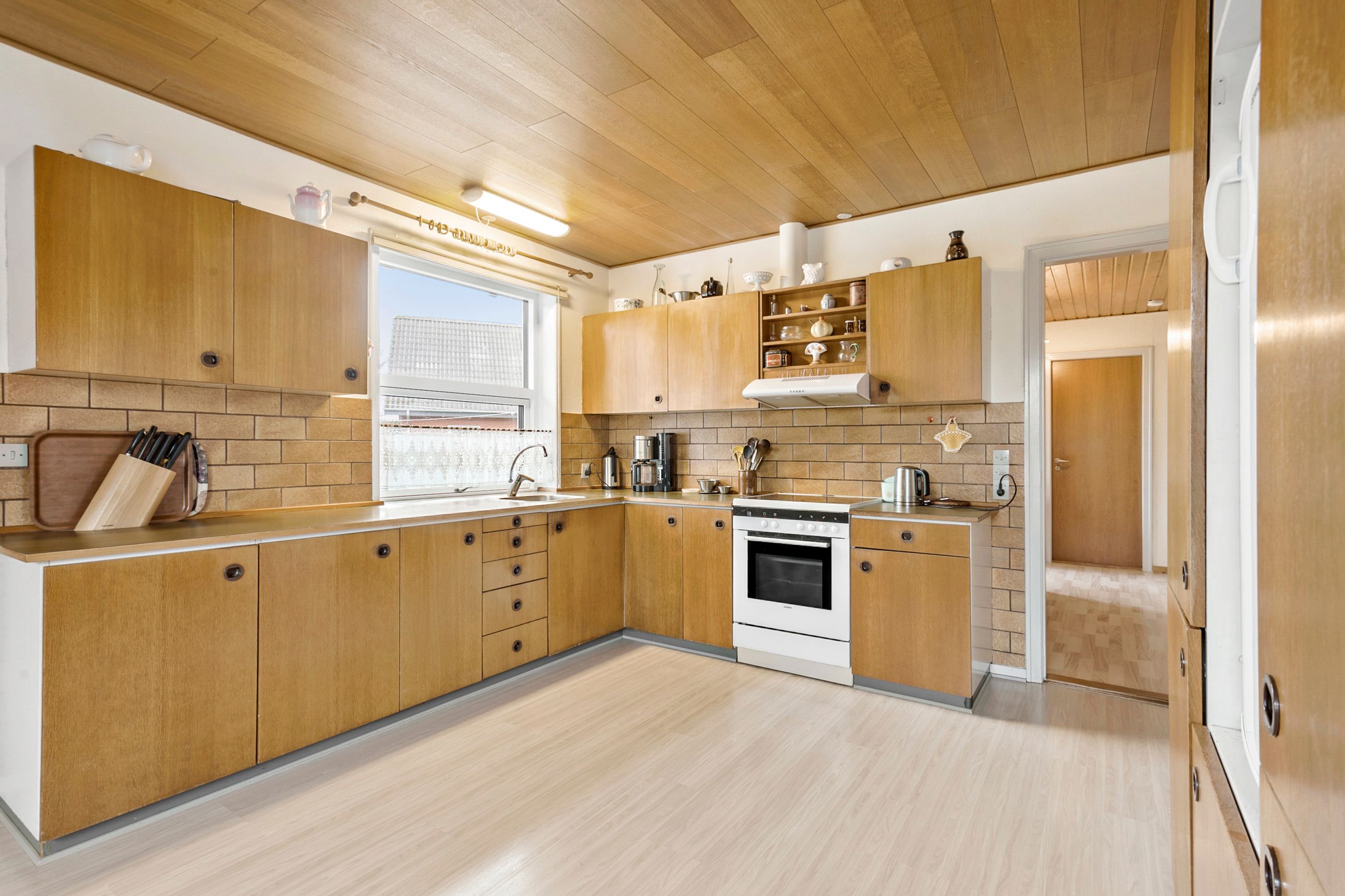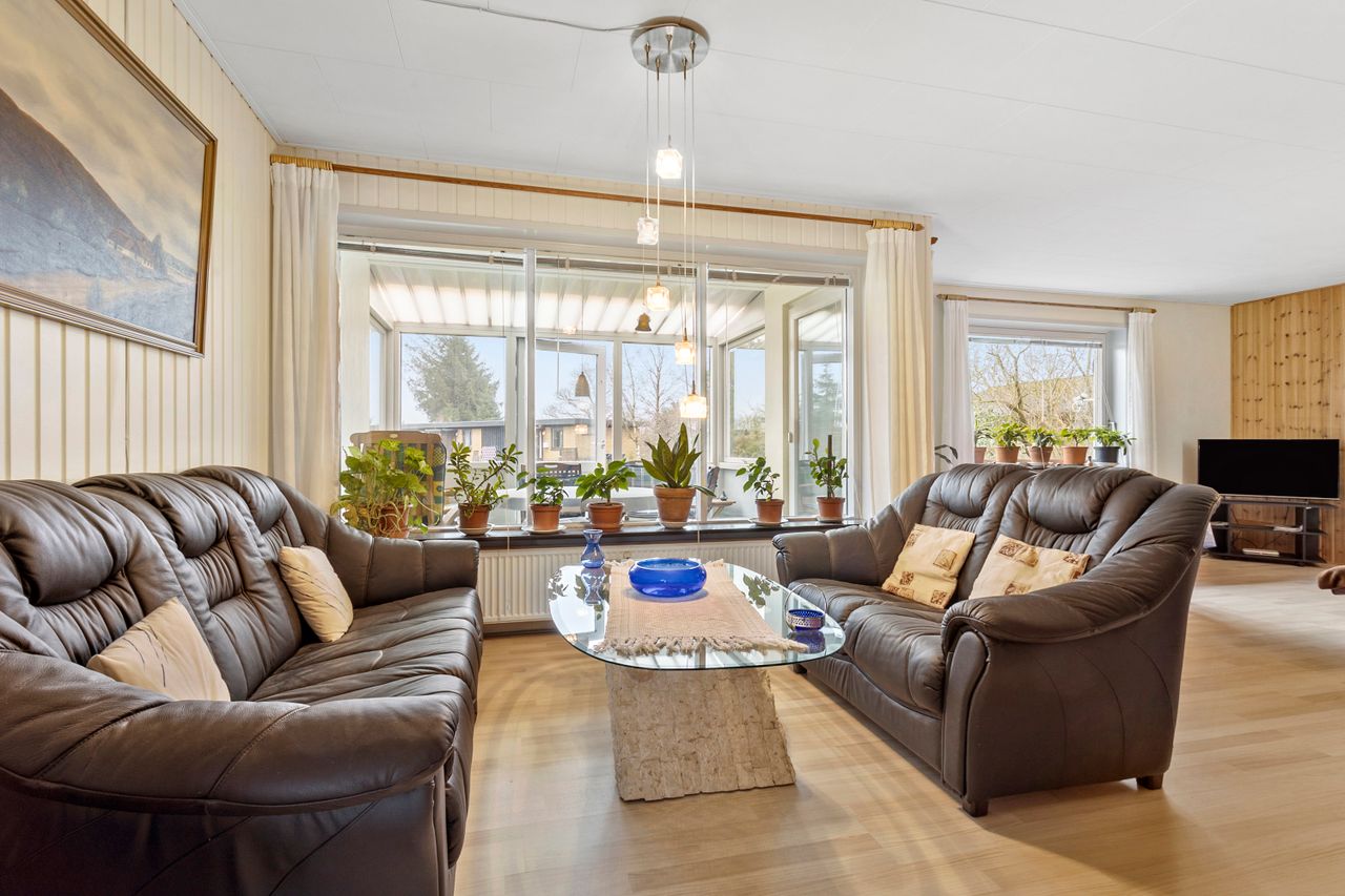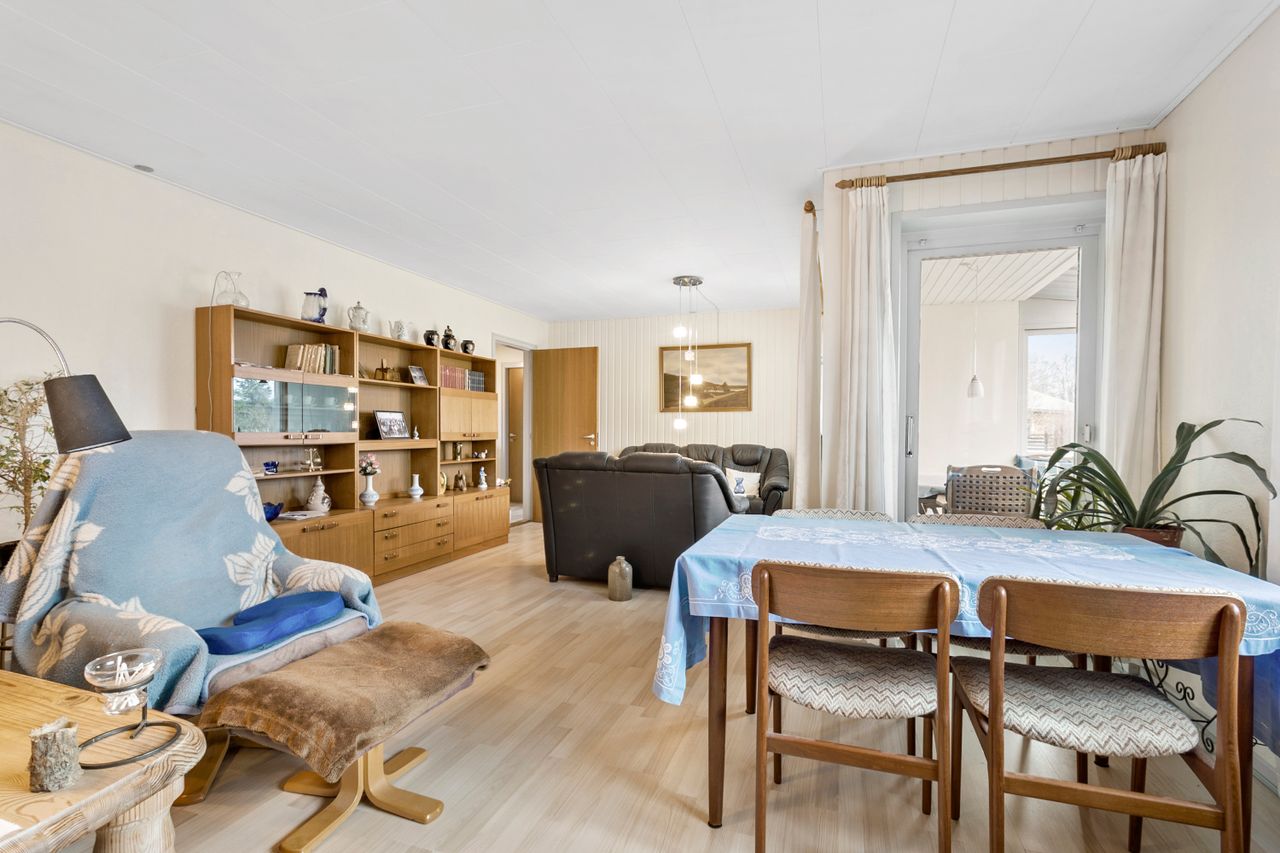 Videre af fordelingsgangen har du adgang til den gode lyse stue, der giver direkte udgang til en udestue og udgang til haven. Videre kommer du til køkken med spiseplads.