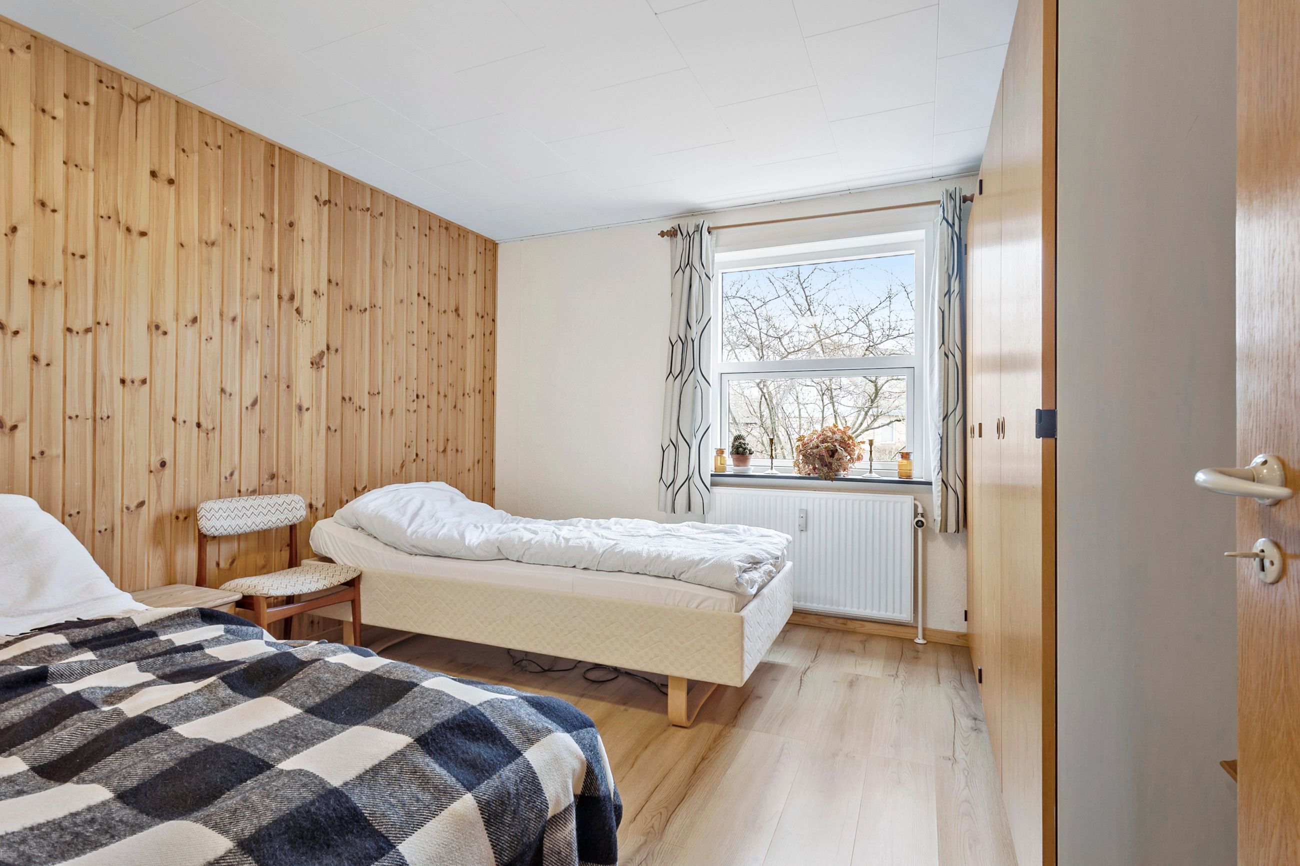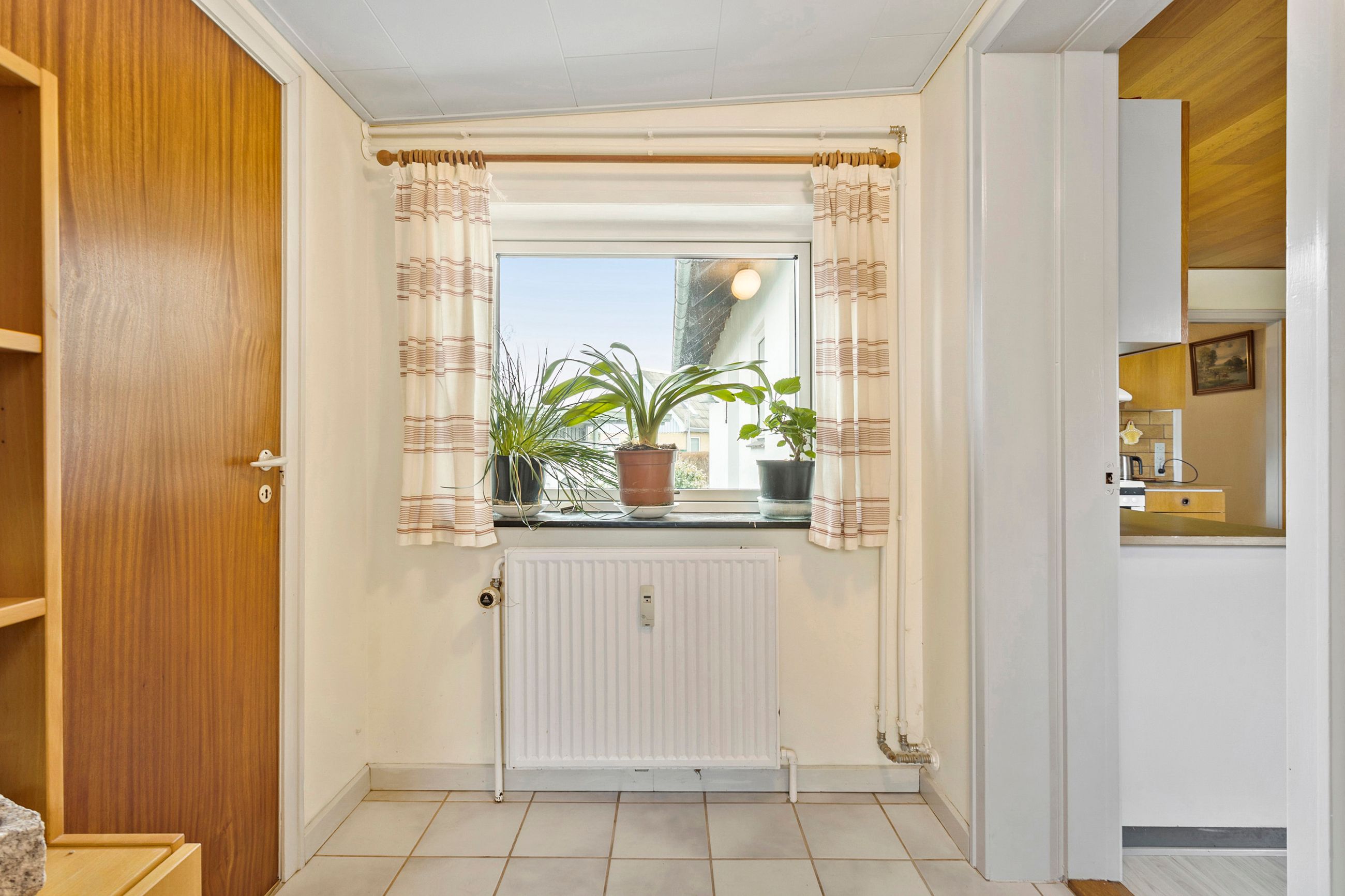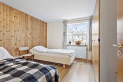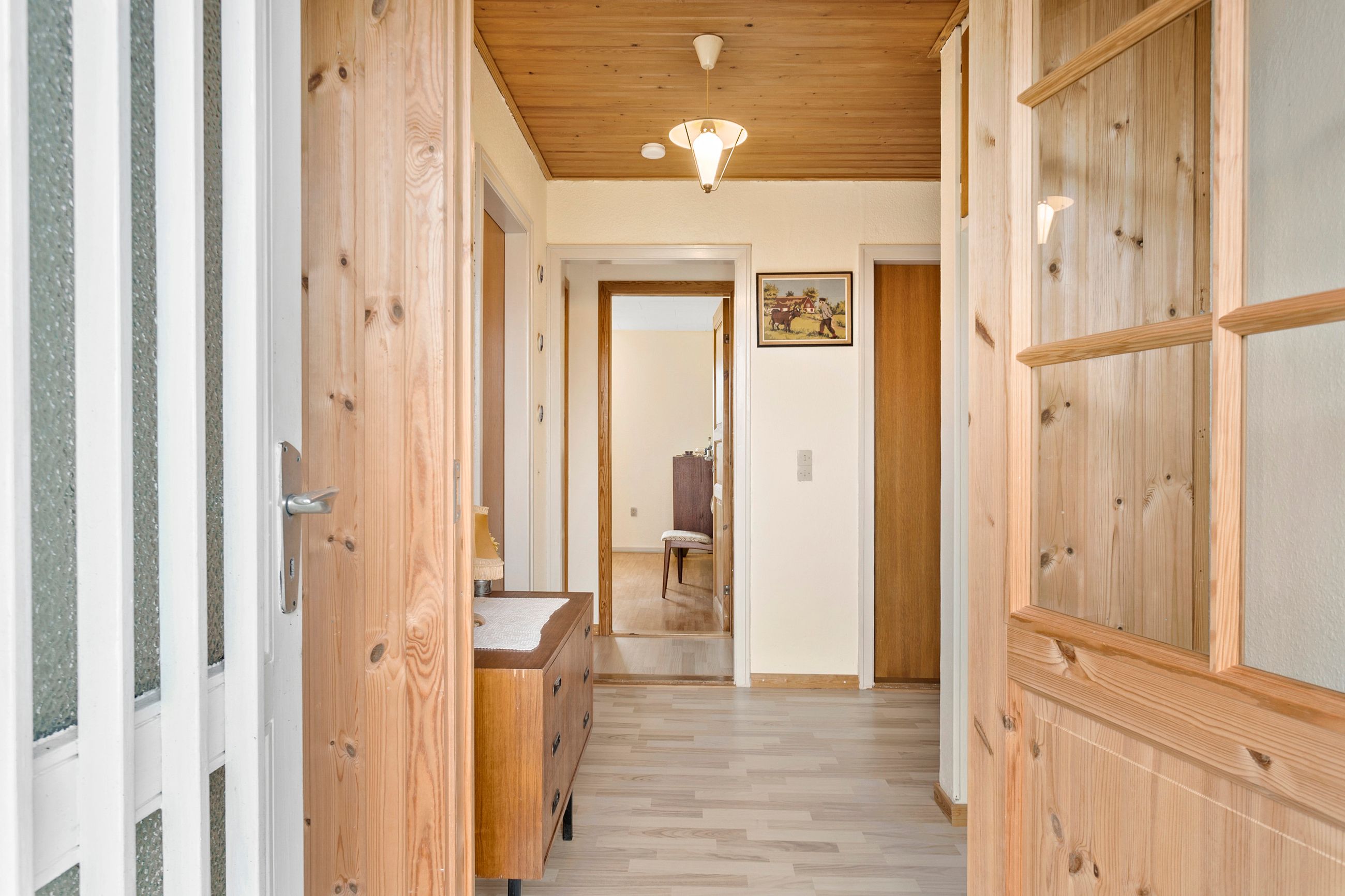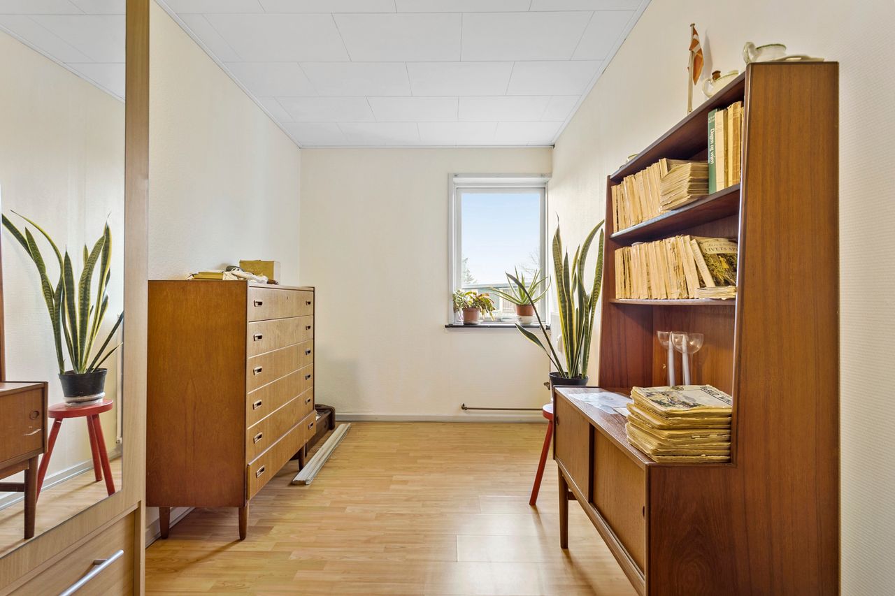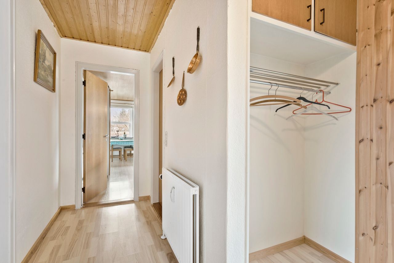 Når man træder ind i huset, mødes man af en rummelig entre med god plads til opbevaring af overtøj og sko. Fra entreen og videre ind gennem fordelingsgangen, møder man husets 3 værelser på venstre hånd. To af værelserne kan evt. lægges sammen, hvis man ønsker ét større værelse.