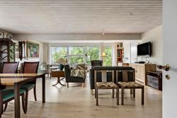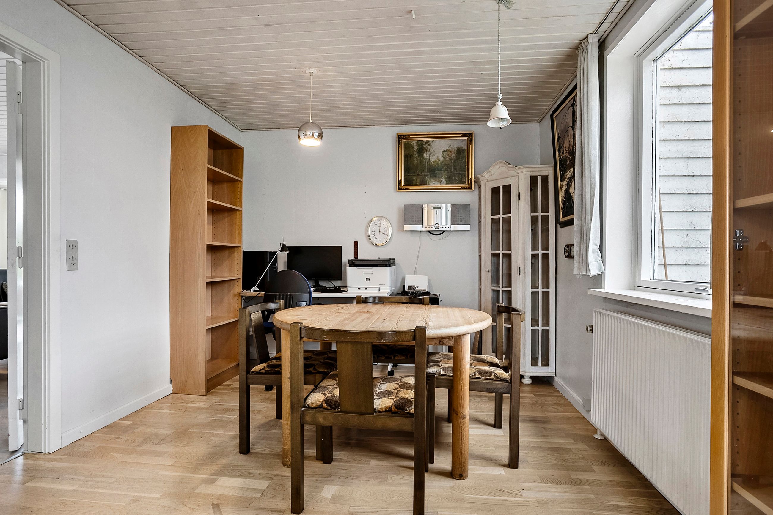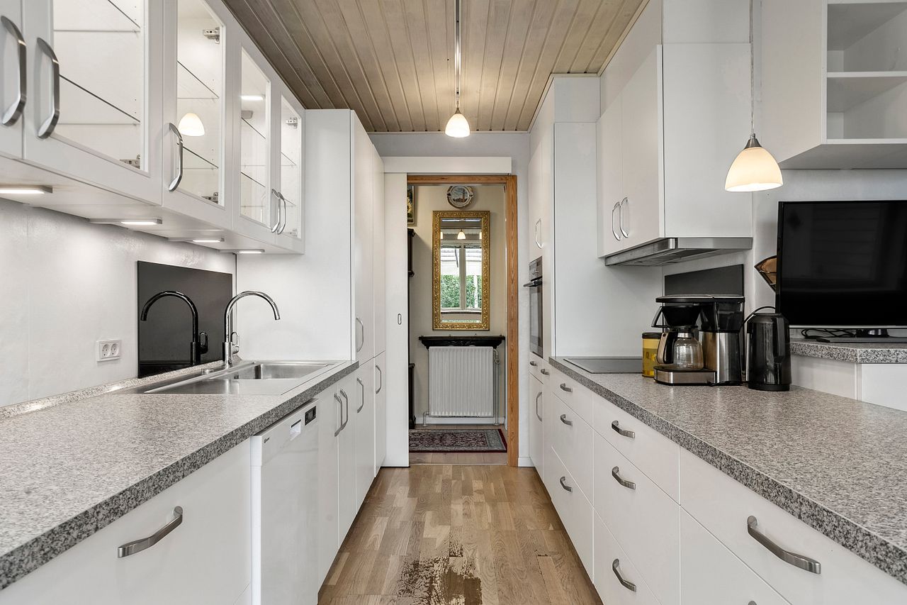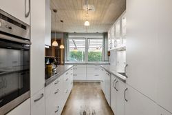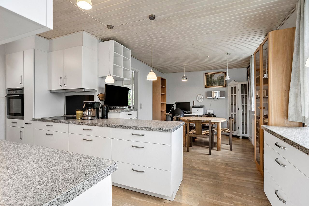 Køkkenet ligger centralt i boligen og har en praktisk spiseplads, der gør det oplagt som et naturligt samlingspunkt i hverdagen.