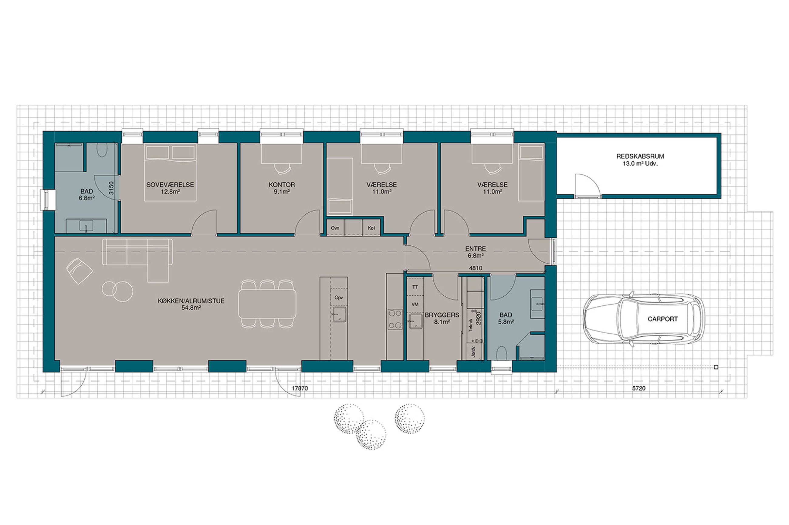 Projektets detaljer: Det foreslåede hus er et rummeligt, længehus på 150 m2 med en tilhørende dobbelt carport på 48 m2 heraf 12 m2 skur. Boligen inkluderer et soveværelse med eget badeværelse, to værelser, et kontor samt et køkken i åben forbindelse med stuen. Sidst men ikke mindst et praktisk bryggers med plads til vaskemaskine og tørretumbler, teknikrum, skabsplads til opbevaring og naturligvis håndvask i bryggers.