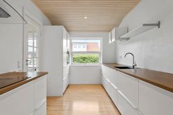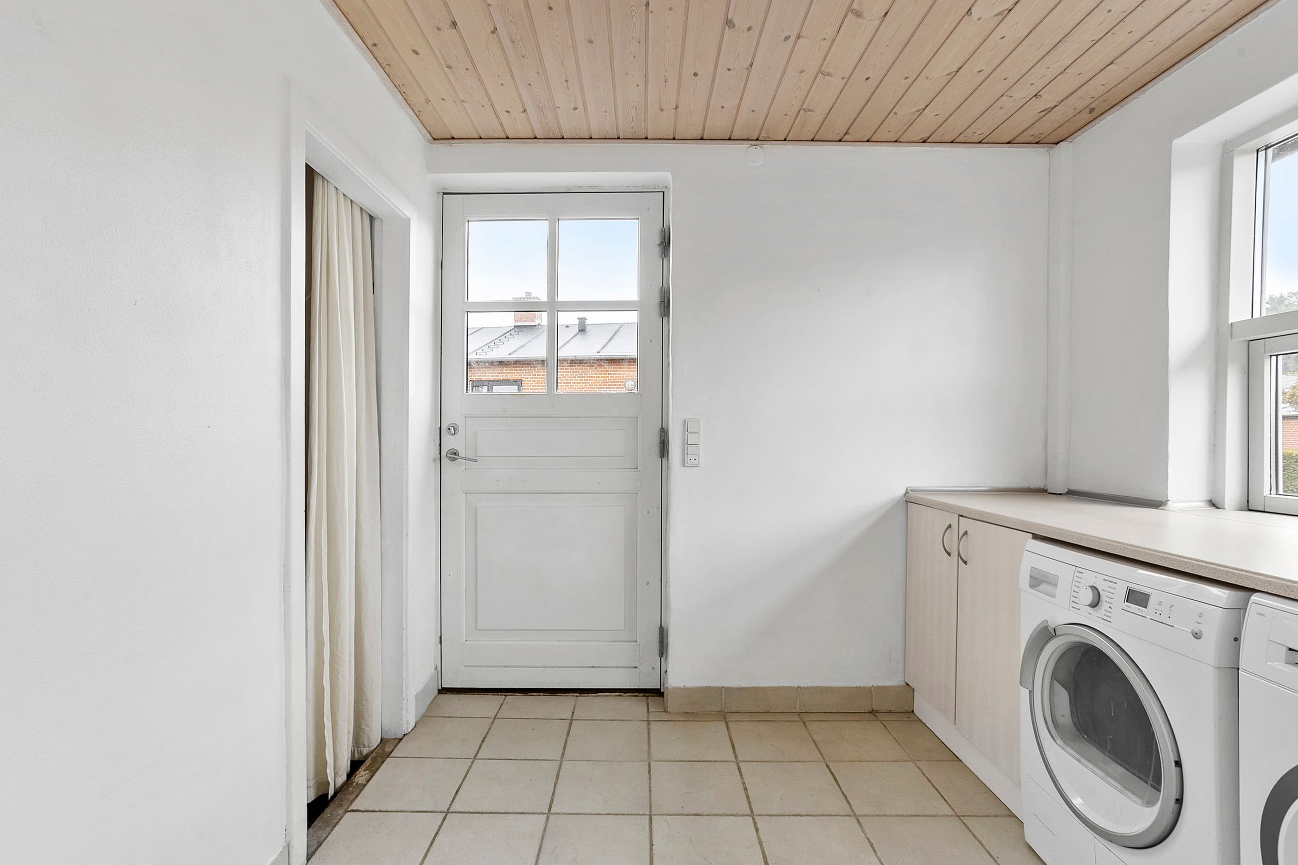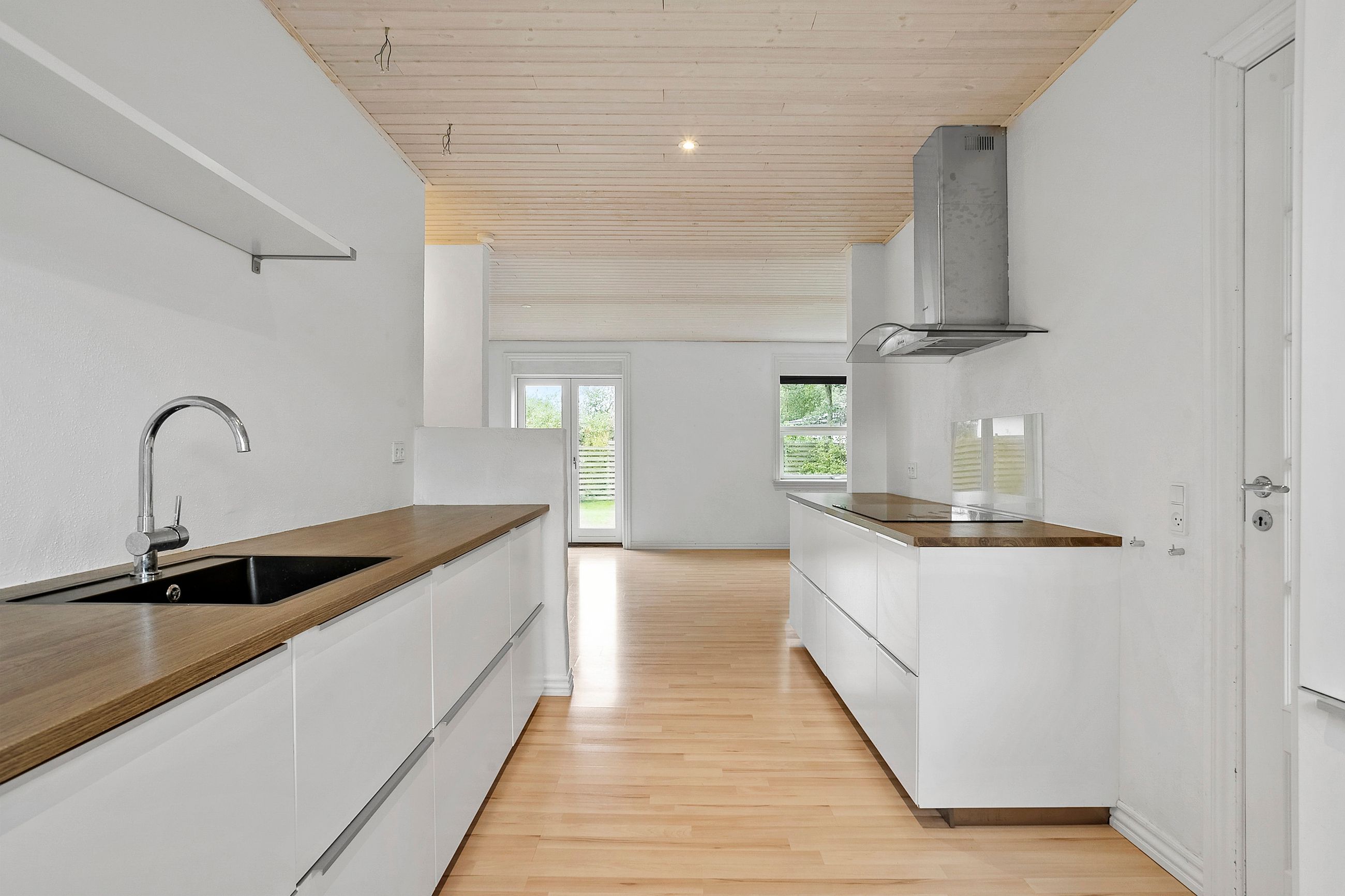 Når du træder ind i boligen finder du et praktisk bryggers med tilhørende depotrum, der giver massere af opbevaringsplads. Videre ind finder du køkken-alrummet, som er indrettet med et moderne IKEA-køkken og ligger i åben forbindelse med en hyggelig stue, hvorfra der er direkte udgang til en sydvendt terrasse og en overskuelig, lukket have.