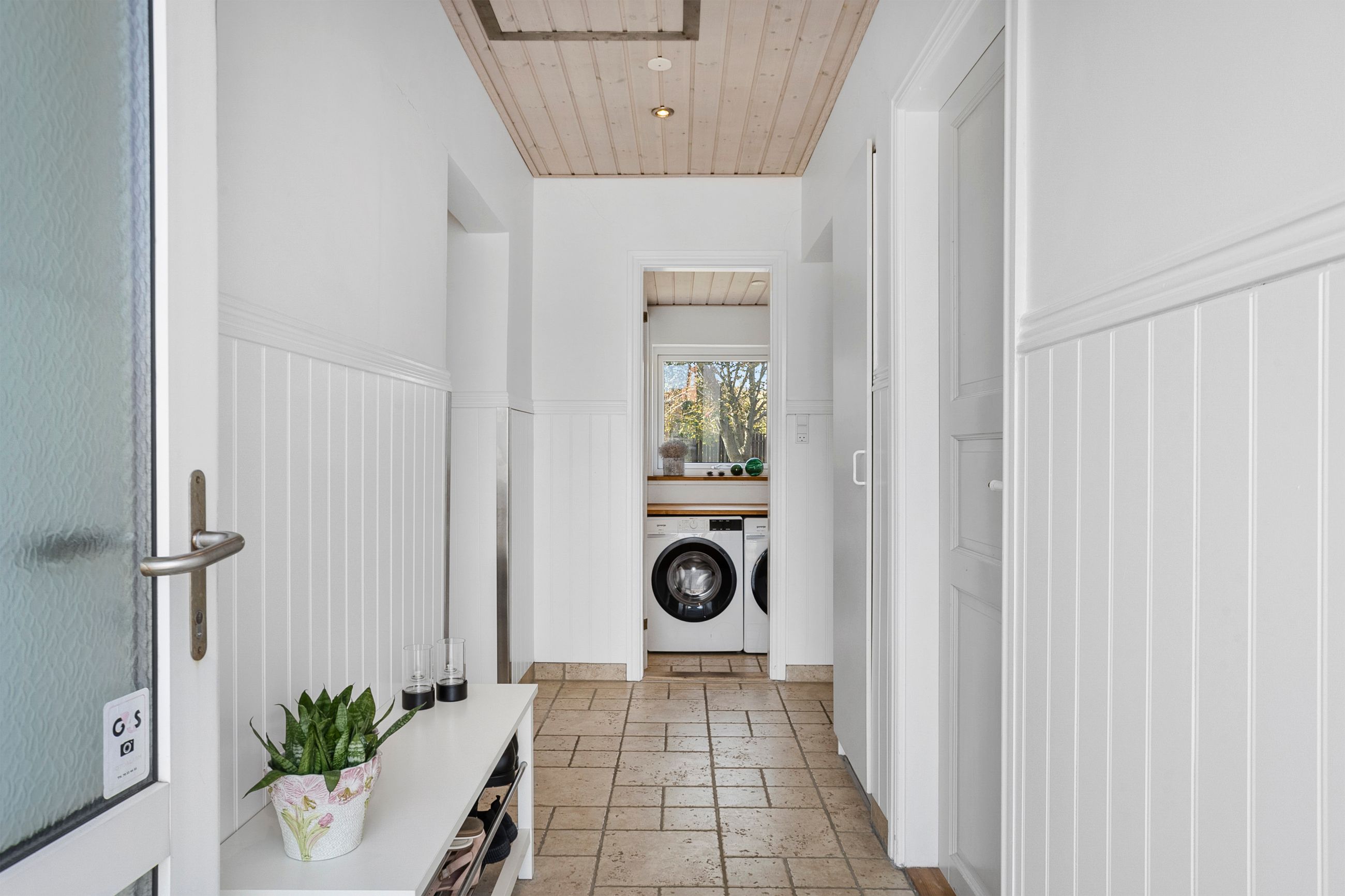 Selvom huset er opført i 1955, er det sidenhen blevet moderniseret, så der i dag ikke er meget tilbage af det oprindelige. Boligarealet på 86 m2 fremstår lyst, funktionelt og indbydende. Indretningen byder på entre, to værelser og et stort badeværelse, baggang med udgang til haven, et rummeligt soveværelse samt køkken/alrum i åben forbindelse med spisestue og tv-stue, hvor hjemmets hjerte samles.