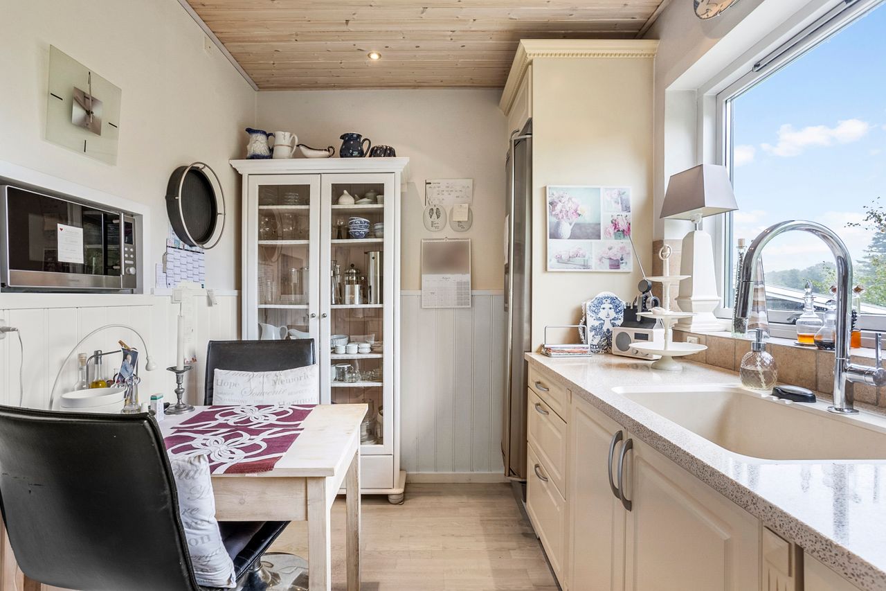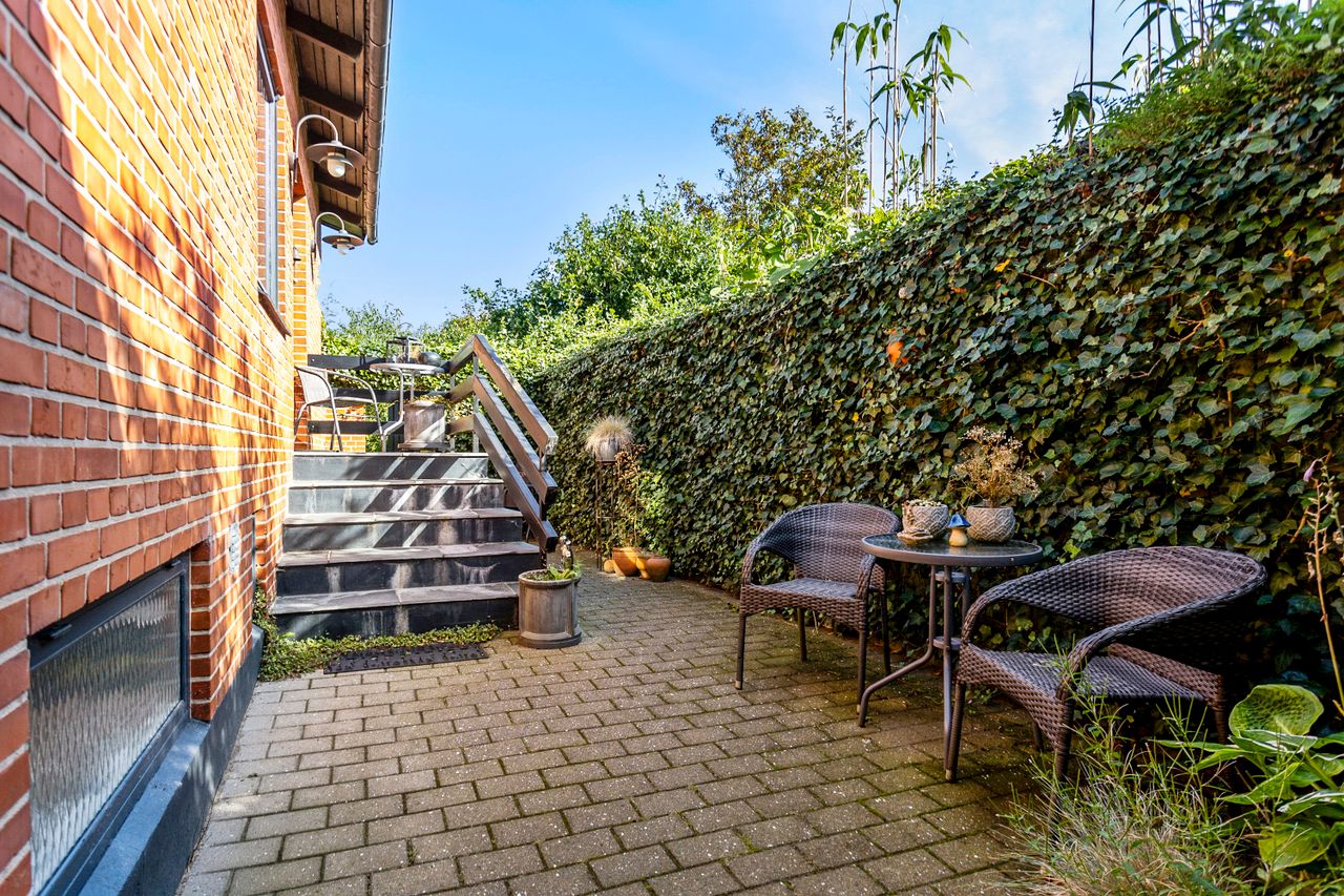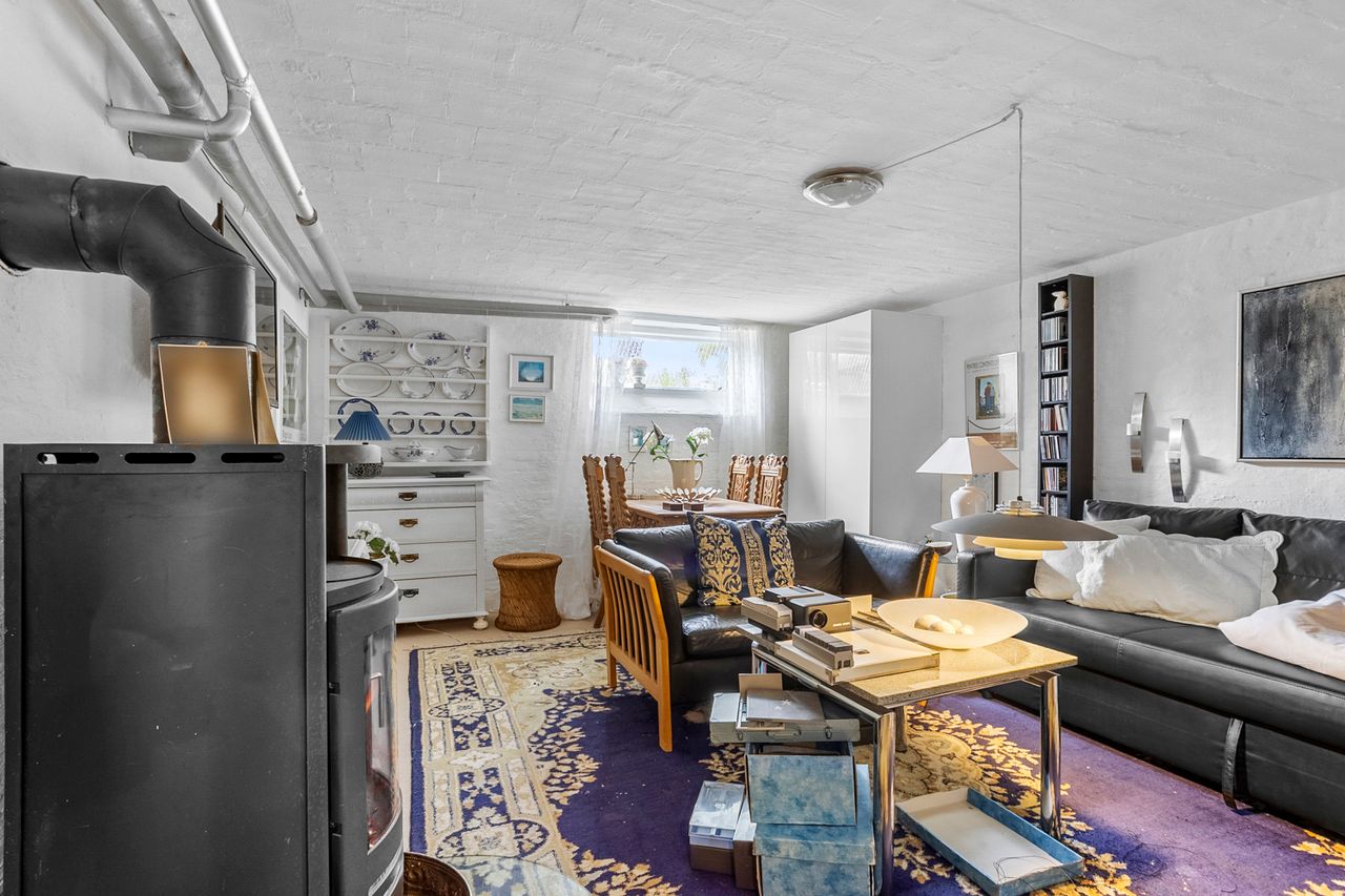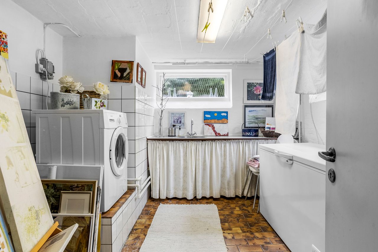 Boligen suppleres af en yderst anvendelig kælder på hele 86 m2. Her finder du et badeværelse fra 2011 med gulvvarme, stor bruseniche og badekar, et stort bryggers samt tre disponible rum, hvoraf det ene er indrettet med brændeovn – perfekt som ekstra hobbyrum.