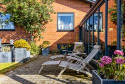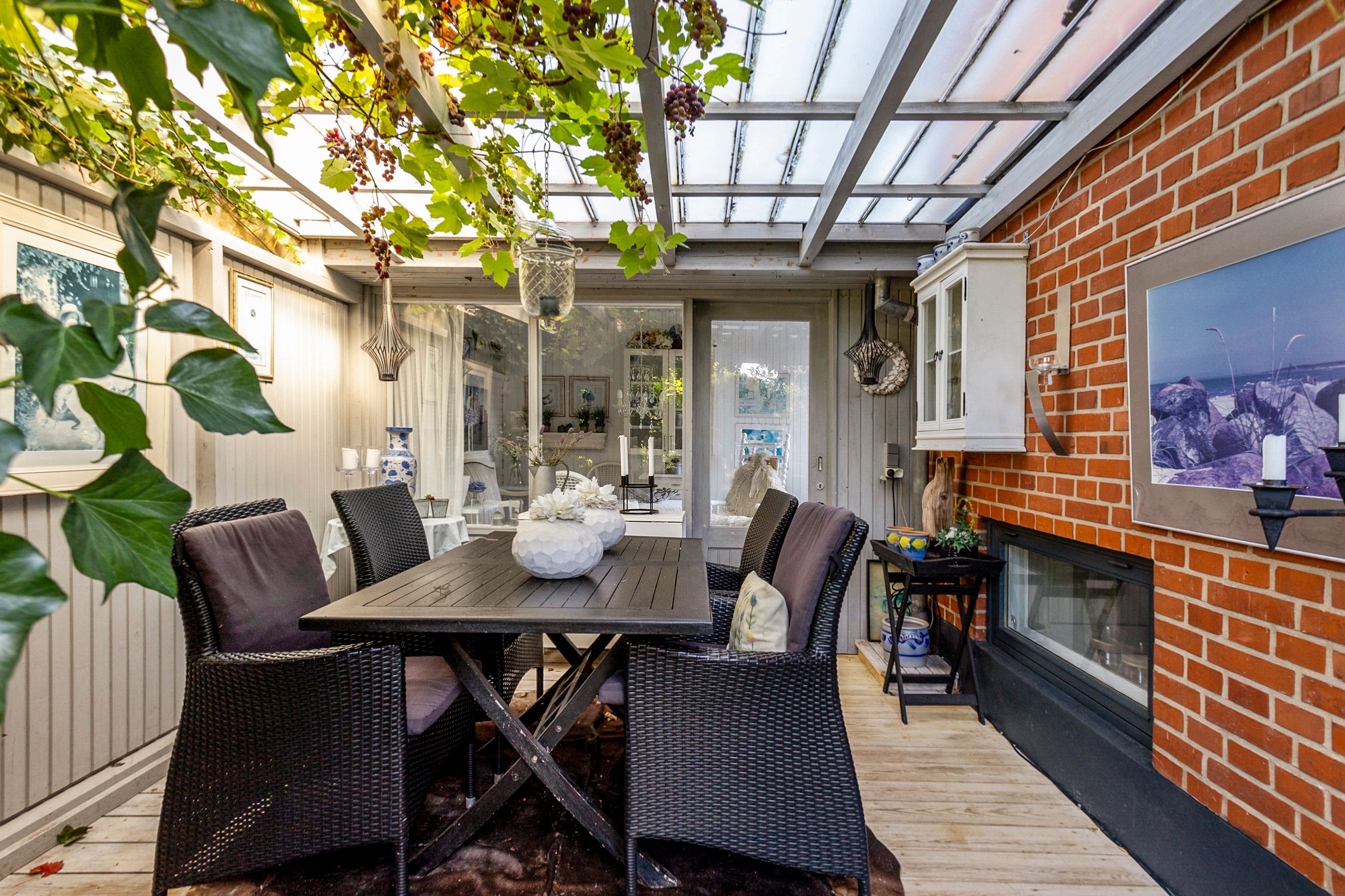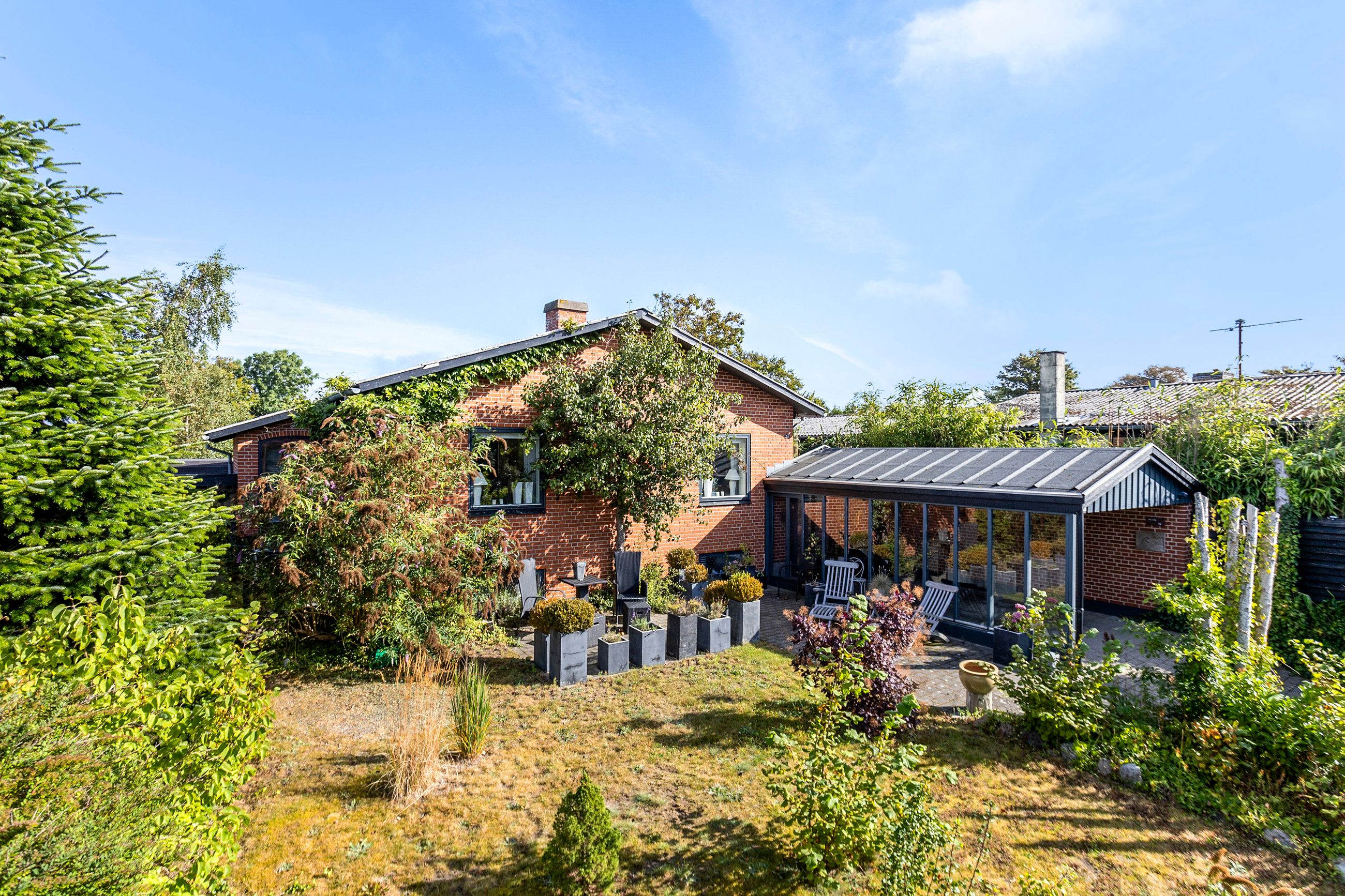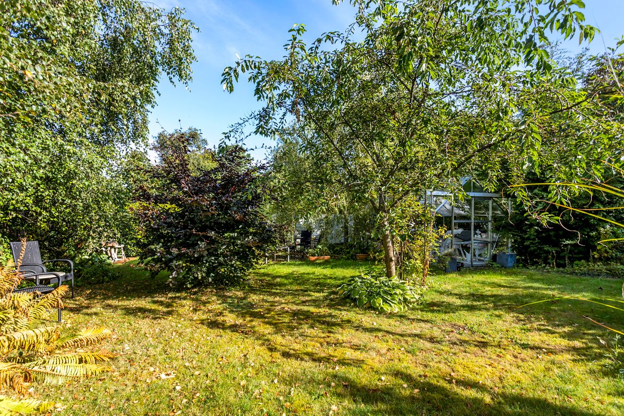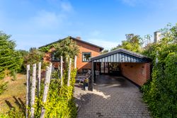 Udendørs får du en flot carport med tagpap, flere gode udhuse og en skøn overdækket terrasse, hvor vindruer slynger sig i loftet og danner en stemningsfuld ramme om sommerens og sensommerens aftener. Den 788 m2 store grund giver god plads til leg, havearbejde og udeliv, og ejendommen er samtidig praktisk opdateret med separat kloakering.