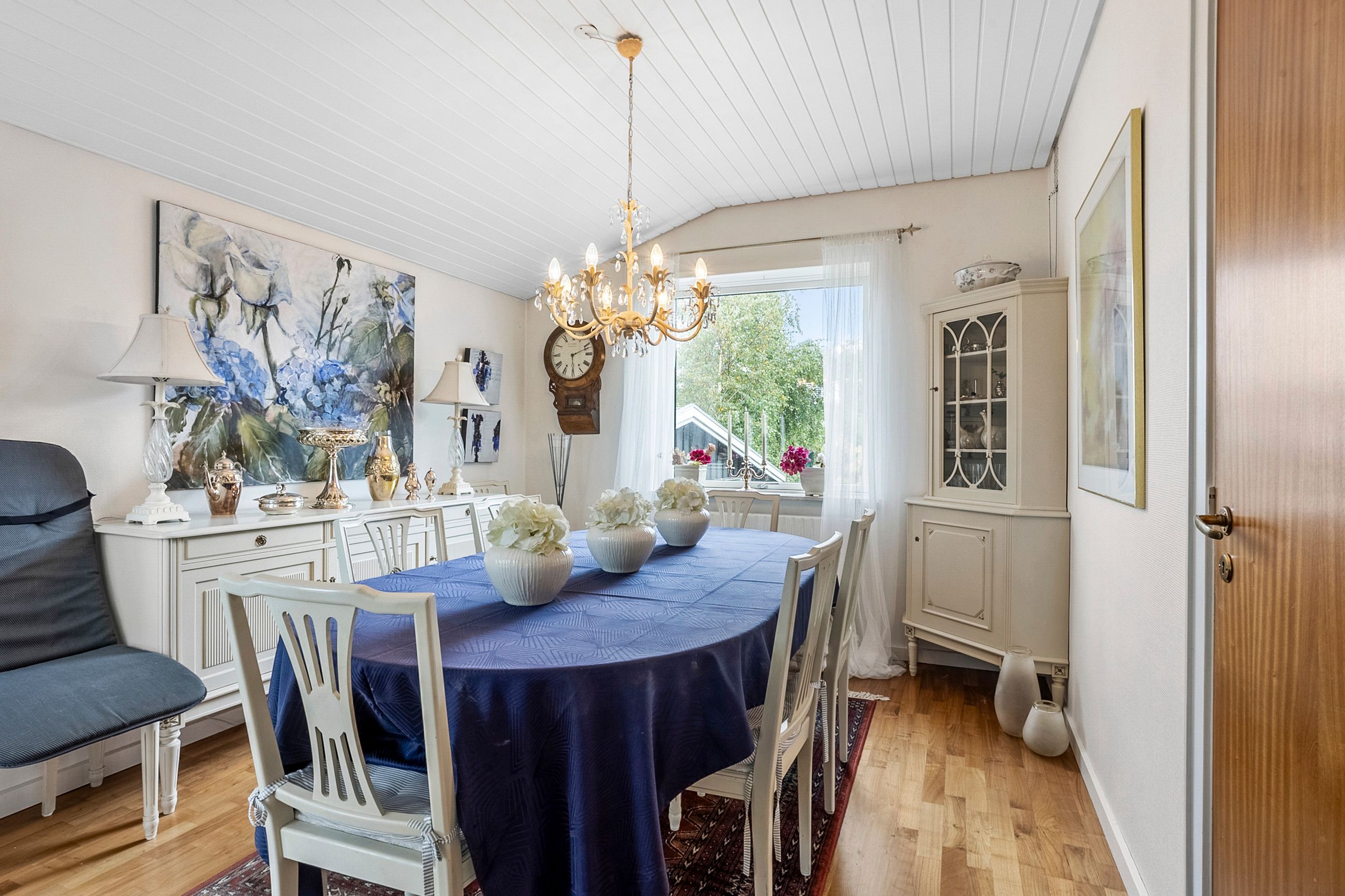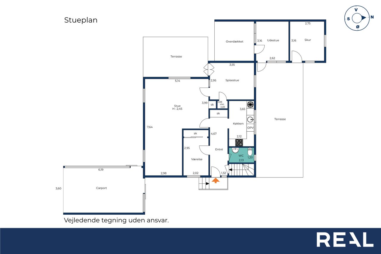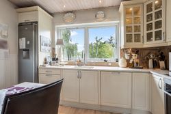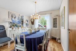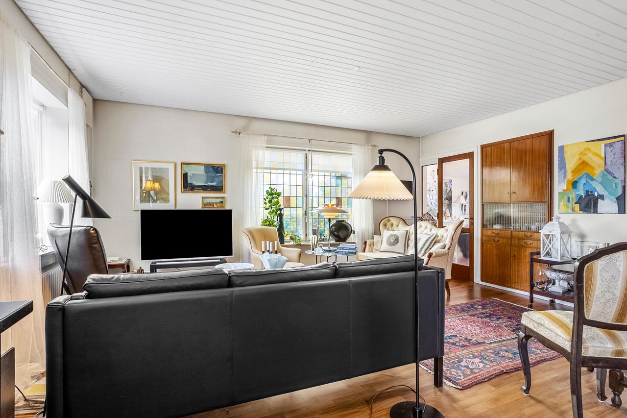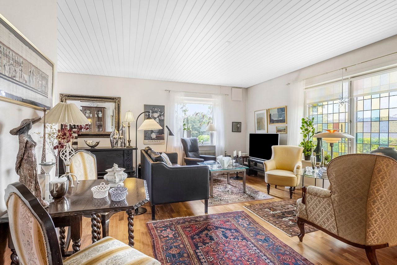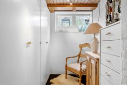 Villaen rummer en indbydende entre, gæstetoilet, et værelse og et lyst, velholdt køkken med kig til haven og plads til, at dagens første måltid kan indtages i hyggelige rammer. Den store vinkelstue og tilstødende stue giver rig mulighed for at indrette sig med både spise- og opholdsafdeling, og ønsker man et ekstra værelse, kan det nemt etableres på førstesalen.