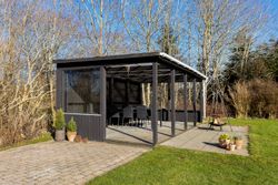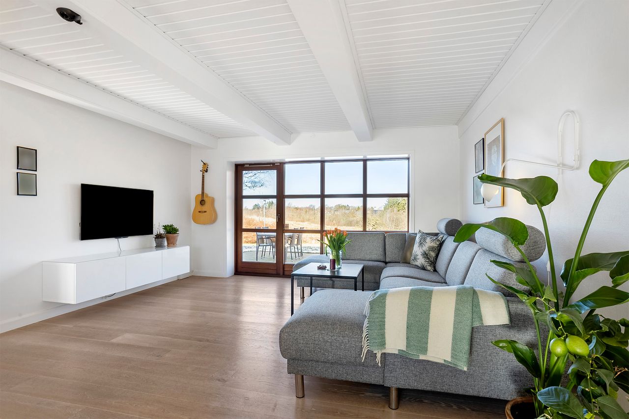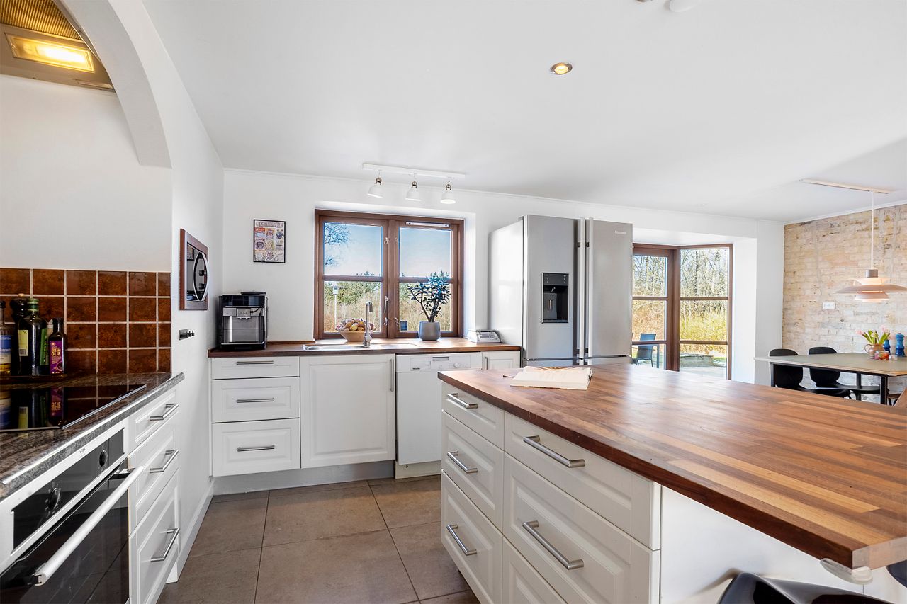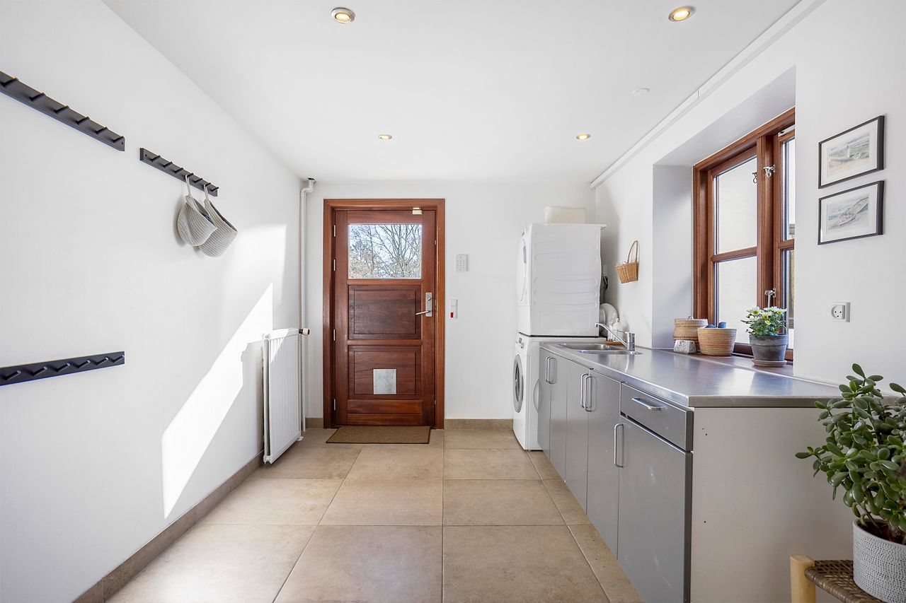 Udvendig får man en skøn gårdsplads og 170 kvm udhus med dobbeltcarport, hobbyrum/gildesal med toilet, samt gode opbevaringsmuligheder. Den omkringliggende have er velholdt og byder b.la. på en skøn overdækket terrasse.