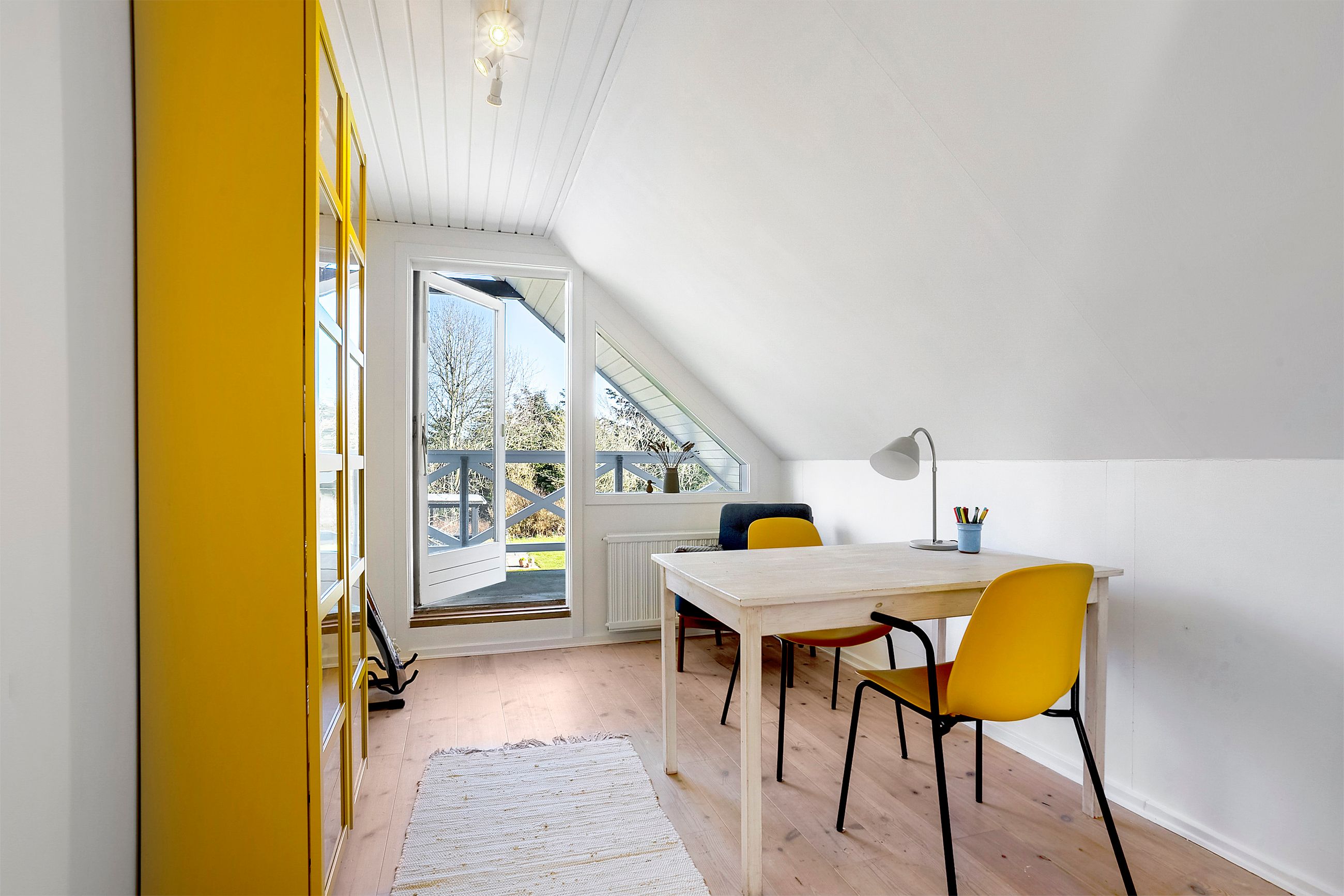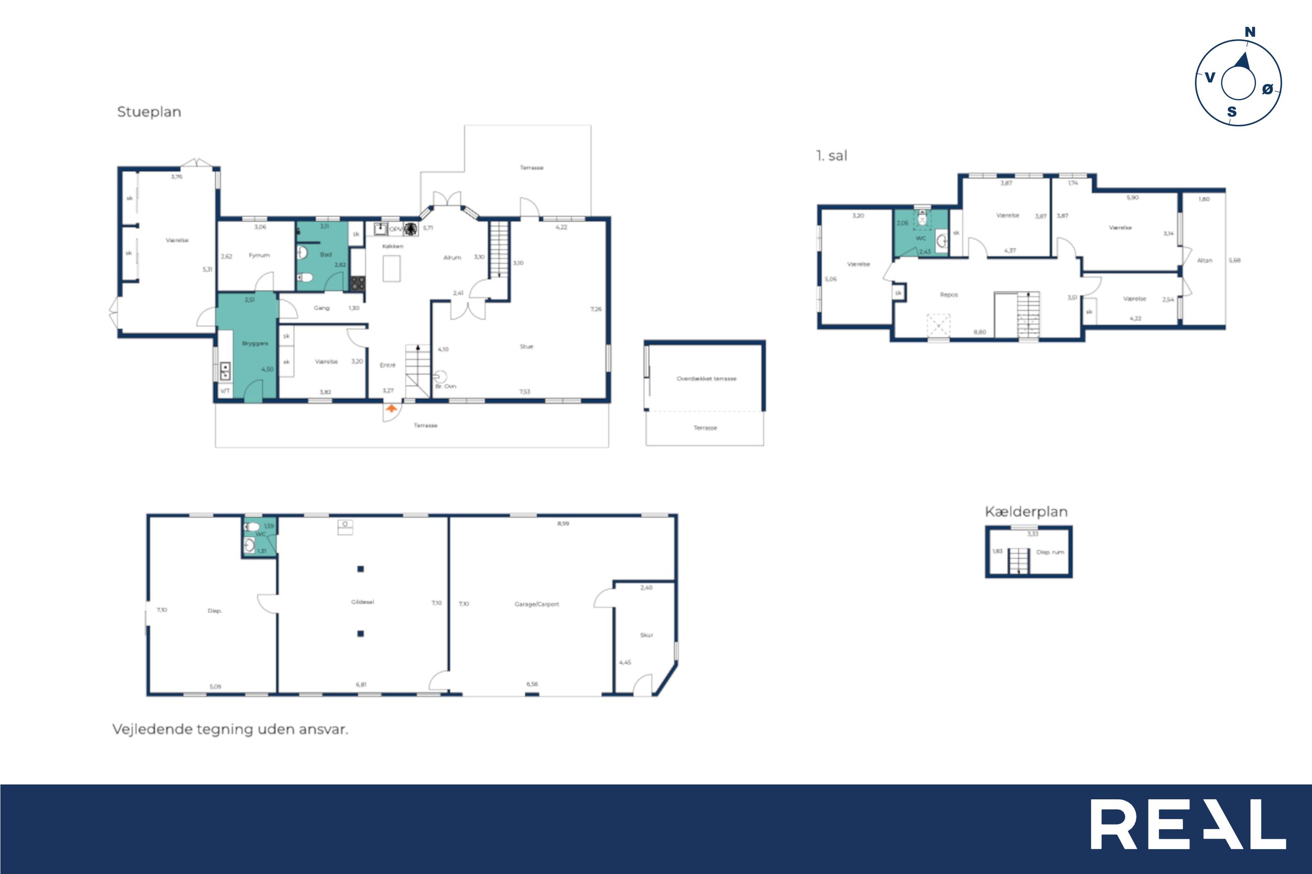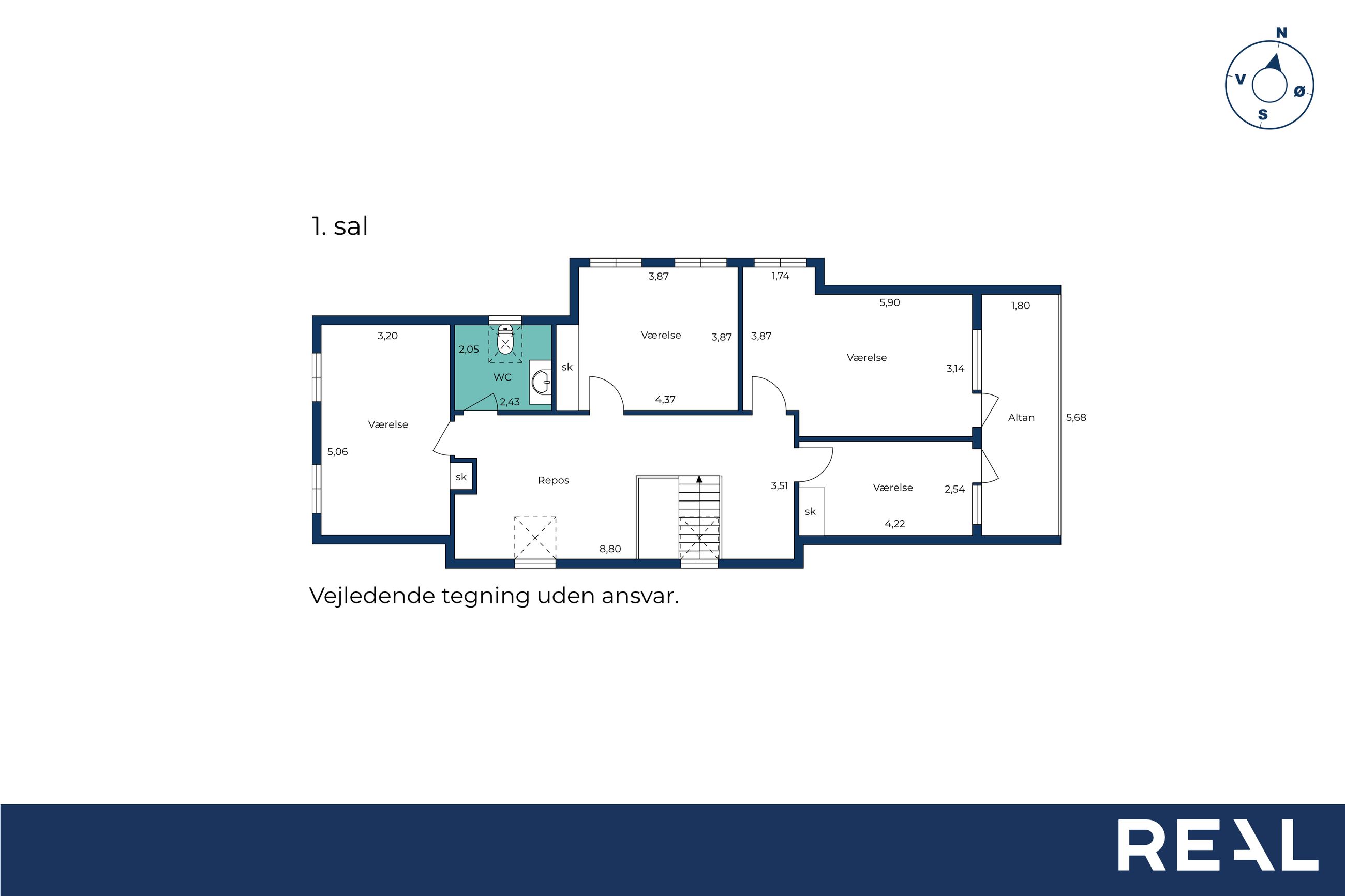 Førstesalen indeholder en stor repos, fire gode værelser – heraf har to værelser med udgang til svalegang, samt et toilet.