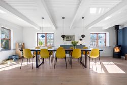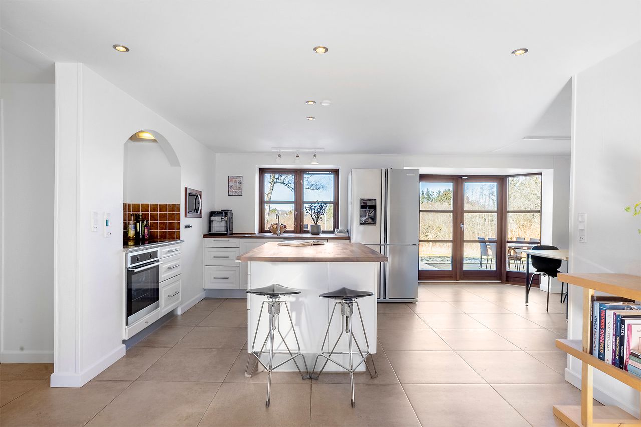 Stueetagen indeholder en entré med opgang til førstesalen, et lyst køkken-alrum med integreret spiseplads og viktualierum, samt udgang til en udsigtsrig terrasse. Fra køkken-alrummet finder man en rummelig spisestue med brændeovn og en hyggelig stue, også med udgang til terrassen.